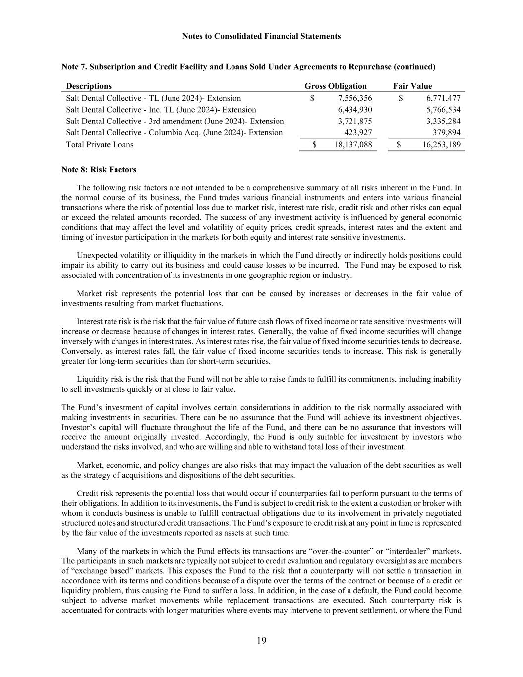 Notes to Consolidated Financial Statements 19 Note 7. Subscription and Credit Facility and Loans Sold Under Agreements to Repurchase (continued) Descriptions Gross Obligation Fair Value Salt Dental Collective - TL (June 2024)- Extension $ 7,556,356 $ 6,771,477 Salt Dental Collective - Inc. TL (June 2024)- Extension 6,434,930 5,766,534 Salt Dental Collective - 3rd amendment (June 2024)- Extension 3,721,875 3,335,284 Salt Dental Collective - Columbia Acq. (June 2024)- Extension 423,927 379,894 Total Private Loans $ 18,137,088 $ 16,253,189 Note 8: Risk Factors The following risk factors are not intended to be a comprehensive summary of all risks inherent in the Fund. In the normal course of its business, the Fund trades various financial instruments and enters into various financial transactions where the risk of potential loss due to market risk, interest rate risk, credit risk and other risks can equal or exceed the related amounts recorded. The success of any investment activity is influenced by general economic conditions that may affect the level and volatility of equity prices, credit spreads, interest rates and the extent and timing of investor participation in the markets for both equity and interest rate sensitive investments. Unexpected volatility or illiquidity in the markets in which the Fund directly or indirectly holds positions could impair its ability to carry out its business and could cause losses to be incurred. The Fund may be exposed to risk associated with concentration of its investments in one geographic region or industry. Market risk represents the potential loss that can be caused by increases or decreases in the fair value of investments resulting from market fluctuations. Interest rate risk is the risk that the fair value of future cash flows of fixed income or rate sensitive investments will increase or decrease because of changes in interest rates. Generally, the value of fixed income securities will change inversely with changes in interest rates. As interest rates rise, the fair value of fixed income securities tends to decrease. Conversely, as interest rates fall, the fair value of fixed income securities tends to increase. This risk is generally greater for long-term securities than for short-term securities. Liquidity risk is the risk that the Fund will not be able to raise funds to fulfill its commitments, including inability to sell investments quickly or at close to fair value. The Fund’s investment of capital involves certain considerations in addition to the risk normally associated with making investments in securities. There can be no assurance that the Fund will achieve its investment objectives. Investor’s capital will fluctuate throughout the life of the Fund, and there can be no assurance that investors will receive the amount originally invested. Accordingly, the Fund is only suitable for investment by investors who understand the risks involved, and who are willing and able to withstand total loss of their investment. Market, economic, and policy changes are also risks that may impact the valuation of the debt securities as well as the strategy of acquisitions and dispositions of the debt securities. Credit risk represents the potential loss that would occur if counterparties fail to perform pursuant to the terms of their obligations. In addition to its investments, the Fund is subject to credit risk to the extent a custodian or broker with whom it conducts business is unable to fulfill contractual obligations due to its involvement in privately negotiated structured notes and structured credit transactions. The Fund’s exposure to credit risk at any point in time is represented by the fair value of the investments reported as assets at such time. Many of the markets in which the Fund effects its transactions are “over-the-counter” or “interdealer” markets. The participants in such markets are typically not subject to credit evaluation and regulatory oversight as are members of “exchange based” markets. This exposes the Fund to the risk that a counterparty will not settle a transaction in accordance with its terms and conditions because of a dispute over the terms of the contract or because of a credit or liquidity problem, thus causing the Fund to suffer a loss. In addition, in the case of a default, the Fund could become subject to adverse market movements while replacement transactions are executed. Such counterparty risk is accentuated for contracts with longer maturities where events may intervene to prevent settlement, or where the Fund