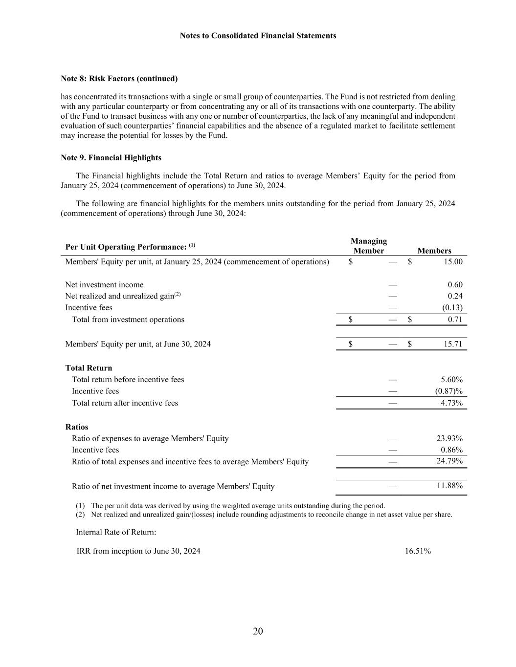 Notes to Consolidated Financial Statements 20 Note 8: Risk Factors (continued) has concentrated its transactions with a single or small group of counterparties. The Fund is not restricted from dealing with any particular counterparty or from concentrating any or all of its transactions with one counterparty. The ability of the Fund to transact business with any one or number of counterparties, the lack of any meaningful and independent evaluation of such counterparties’ financial capabilities and the absence of a regulated market to facilitate settlement may increase the potential for losses by the Fund. Note 9. Financial Highlights The Financial highlights include the Total Return and ratios to average Members’ Equity for the period from January 25, 2024 (commencement of operations) to June 30, 2024. The following are financial highlights for the members units outstanding for the period from January 25, 2024 (commencement of operations) through June 30, 2024: Managing Member Members Per Unit Operating Performance: (1) Members' Equity per unit, at January 25, 2024 (commencement of operations) $ — $ 15.00 Net investment income — 0.60 Net realized and unrealized gain(2) — 0.24 Incentive fees — (0.13) Total from investment operations $ — $ 0.71 Members' Equity per unit, at June 30, 2024 $ — $ 15.71 Total Return Total return before incentive fees — 5.60% Incentive fees — (0.87)% Total return after incentive fees — 4.73% Ratios Ratio of expenses to average Members' Equity — 23.93% Incentive fees — 0.86% Ratio of total expenses and incentive fees to average Members' Equity — 24.79% Ratio of net investment income to average Members' Equity — 11.88% (1) The per unit data was derived by using the weighted average units outstanding during the period. (2) Net realized and unrealized gain/(losses) include rounding adjustments to reconcile change in net asset value per share. Internal Rate of Return: IRR from inception to June 30, 2024 16.51%