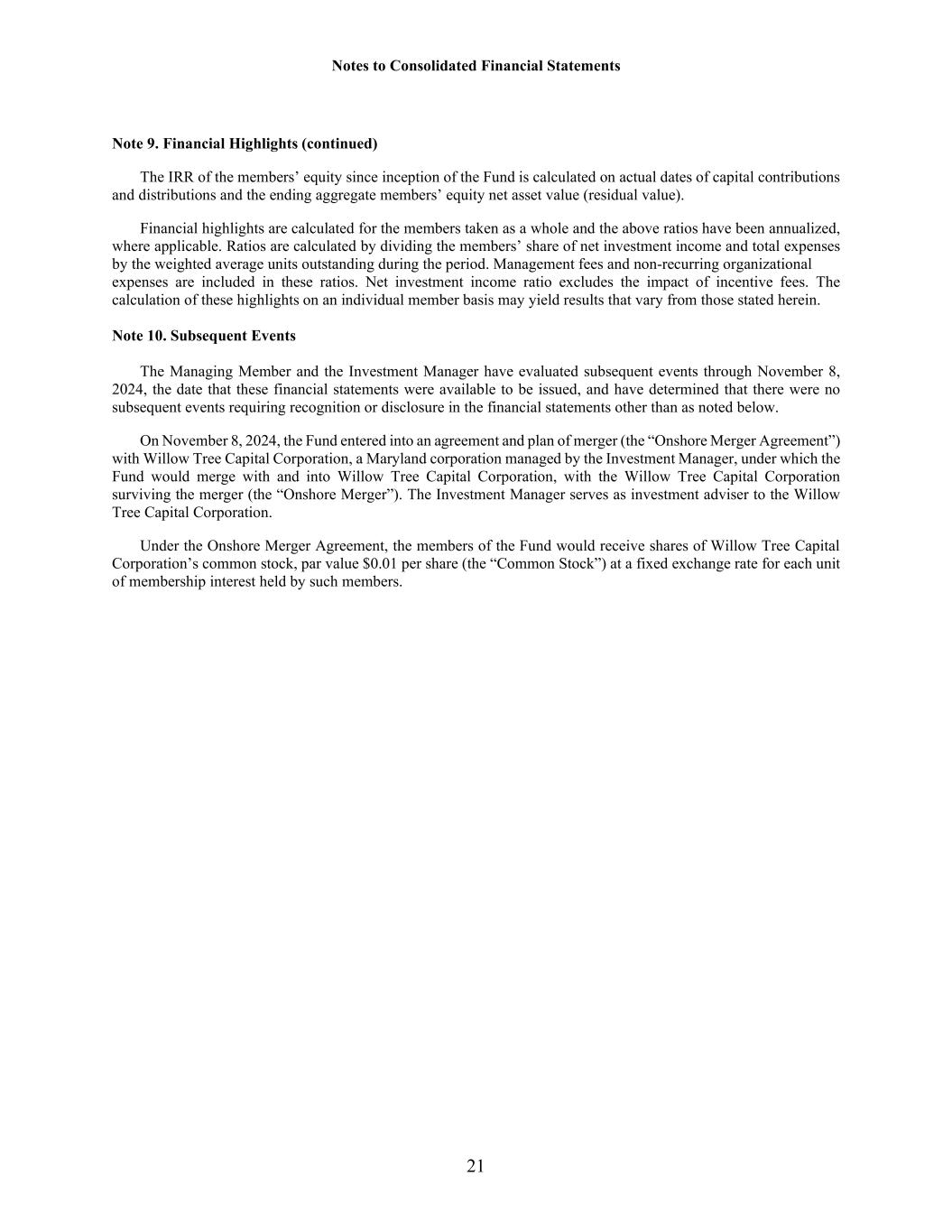 Notes to Consolidated Financial Statements 21 Note 9. Financial Highlights (continued) The IRR of the members’ equity since inception of the Fund is calculated on actual dates of capital contributions and distributions and the ending aggregate members’ equity net asset value (residual value). Financial highlights are calculated for the members taken as a whole and the above ratios have been annualized, where applicable. Ratios are calculated by dividing the members’ share of net investment income and total expenses by the weighted average units outstanding during the period. Management fees and non-recurring organizational expenses are included in these ratios. Net investment income ratio excludes the impact of incentive fees. The calculation of these highlights on an individual member basis may yield results that vary from those stated herein. Note 10. Subsequent Events The Managing Member and the Investment Manager have evaluated subsequent events through November 8, 2024, the date that these financial statements were available to be issued, and have determined that there were no subsequent events requiring recognition or disclosure in the financial statements other than as noted below. On November 8, 2024, the Fund entered into an agreement and plan of merger (the “Onshore Merger Agreement”) with Willow Tree Capital Corporation, a Maryland corporation managed by the Investment Manager, under which the Fund would merge with and into Willow Tree Capital Corporation, with the Willow Tree Capital Corporation surviving the merger (the “Onshore Merger”). The Investment Manager serves as investment adviser to the Willow Tree Capital Corporation. Under the Onshore Merger Agreement, the members of the Fund would receive shares of Willow Tree Capital Corporation’s common stock, par value $0.01 per share (the “Common Stock”) at a fixed exchange rate for each unit of membership interest held by such members.