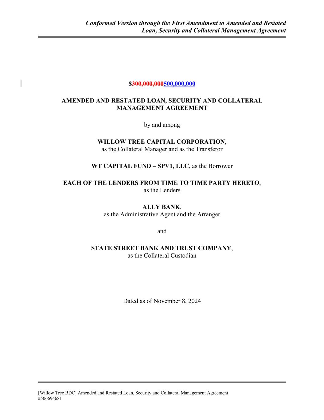 Conformed Version through the First Amendment to Amended and Restated Loan, Security and Collateral Management Agreement $300,000,000500,000,000 AMENDED AND RESTATED LOAN, SECURITY AND COLLATERAL MANAGEMENT AGREEMENT by and among WILLOW TREE CAPITAL CORPORATION, as the Collateral Manager and as the Transferor WT CAPITAL FUND – SPV1, LLC, as the Borrower EACH OF THE LENDERS FROM TIME TO TIME PARTY HERETO, as the Lenders ALLY BANK, as the Administrative Agent and the Arranger and STATE STREET BANK AND TRUST COMPANY, as the Collateral Custodian Dated as of November 8, 2024 [Willow Tree BDC] Amended and Restated Loan, Security and Collateral Management Agreement #506694681