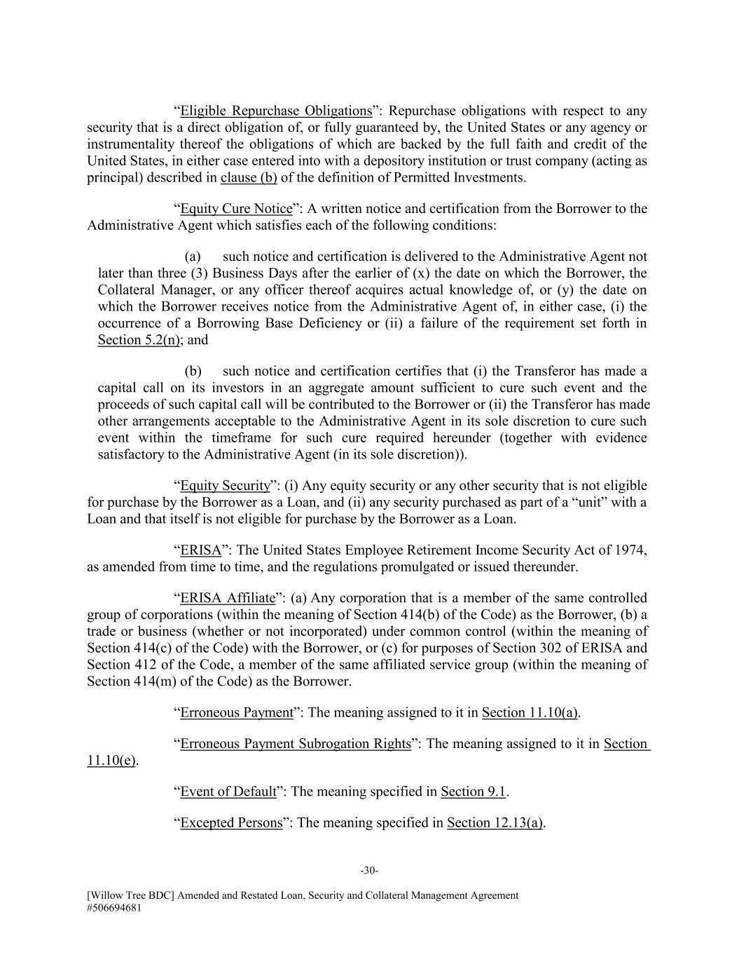 “Eligible Repurchase Obligations”: Repurchase obligations with respect to any security that is a direct obligation of, or fully guaranteed by, the United States or any agency or instrumentality thereof the obligations of which are backed by the full faith and credit of the United States, in either case entered into with a depository institution or trust company (acting as principal) described in clause (b) of the definition of Permitted Investments. “Equity Cure Notice”: A written notice and certification from the Borrower to the Administrative Agent which satisfies each of the following conditions: (a) such notice and certification is delivered to the Administrative Agent not later than three (3) Business Days after the earlier of (x) the date on which the Borrower, the Collateral Manager, or any officer thereof acquires actual knowledge of, or (y) the date on which the Borrower receives notice from the Administrative Agent of, in either case, (i) the occurrence of a Borrowing Base Deficiency or (ii) a failure of the requirement set forth in Section 5.2(n); and (b) such notice and certification certifies that (i) the Transferor has made a capital call on its investors in an aggregate amount sufficient to cure such event and the proceeds of such capital call will be contributed to the Borrower or (ii) the Transferor has made other arrangements acceptable to the Administrative Agent in its sole discretion to cure such event within the timeframe for such cure required hereunder (together with evidence satisfactory to the Administrative Agent (in its sole discretion)). “Equity Security”: (i) Any equity security or any other security that is not eligible for purchase by the Borrower as a Loan, and (ii) any security purchased as part of a “unit” with a Loan and that itself is not eligible for purchase by the Borrower as a Loan. “ERISA”: The United States Employee Retirement Income Security Act of 1974, as amended from time to time, and the regulations promulgated or issued thereunder. “ERISA Affiliate”: (a) Any corporation that is a member of the same controlled group of corporations (within the meaning of Section 414(b) of the Code) as the Borrower, (b) a trade or business (whether or not incorporated) under common control (within the meaning of Section 414(c) of the Code) with the Borrower, or (c) for purposes of Section 302 of ERISA and Section 412 of the Code, a member of the same affiliated service group (within the meaning of Section 414(m) of the Code) as the Borrower. “Erroneous Payment”: The meaning assigned to it in Section 11.10(a). “Erroneous Payment Subrogation Rights”: The meaning assigned to it in Section 11.10(e). “Event of Default”: The meaning specified in Section 9.1. “Excepted Persons”: The meaning specified in Section 12.13(a). -30- [Willow Tree BDC] Amended and Restated Loan, Security and Collateral Management Agreement #506694681
