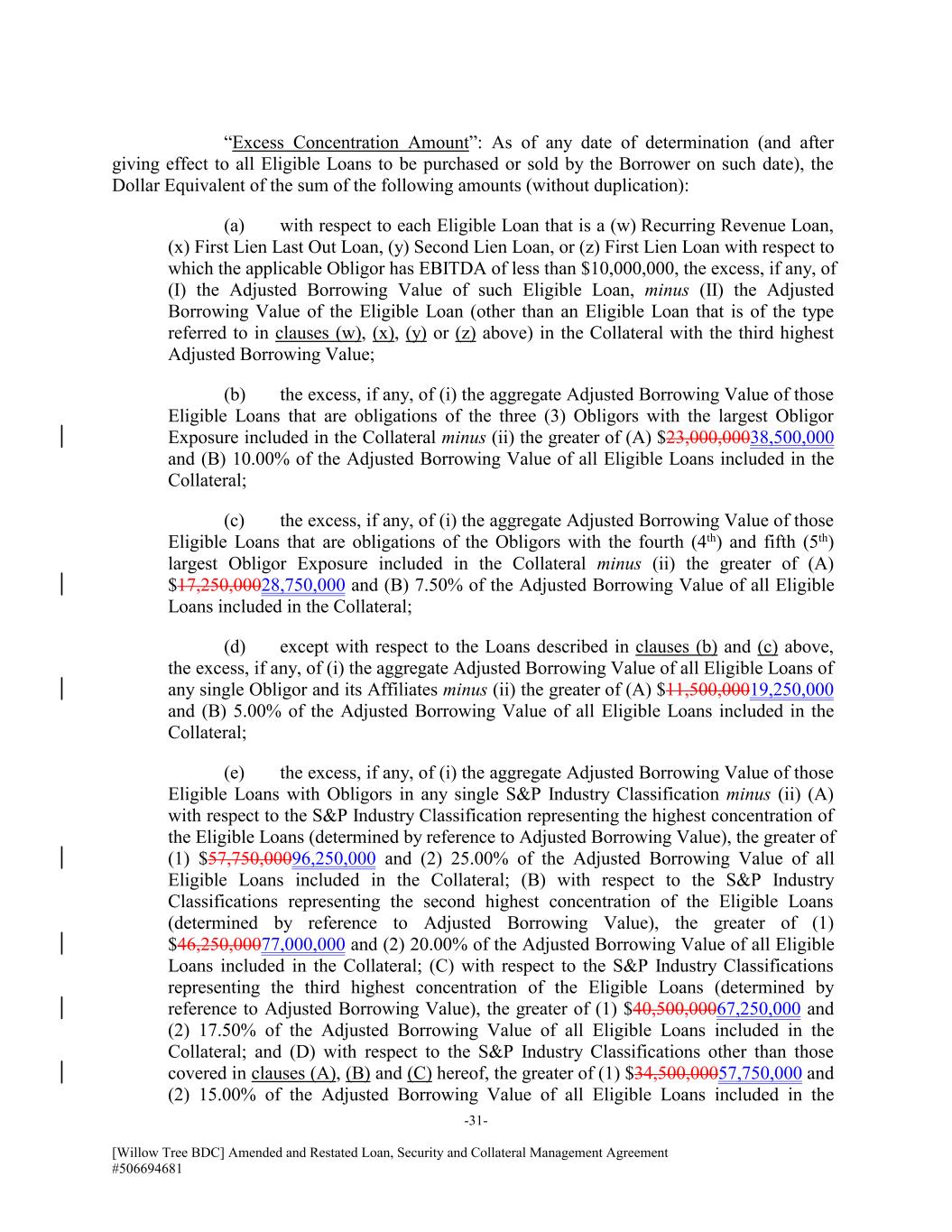 “Excess Concentration Amount”: As of any date of determination (and after giving effect to all Eligible Loans to be purchased or sold by the Borrower on such date), the Dollar Equivalent of the sum of the following amounts (without duplication): (a) with respect to each Eligible Loan that is a (w) Recurring Revenue Loan, (x) First Lien Last Out Loan, (y) Second Lien Loan, or (z) First Lien Loan with respect to which the applicable Obligor has EBITDA of less than $10,000,000, the excess, if any, of (I) the Adjusted Borrowing Value of such Eligible Loan, minus (II) the Adjusted Borrowing Value of the Eligible Loan (other than an Eligible Loan that is of the type referred to in clauses (w), (x), (y) or (z) above) in the Collateral with the third highest Adjusted Borrowing Value; (b) the excess, if any, of (i) the aggregate Adjusted Borrowing Value of those Eligible Loans that are obligations of the three (3) Obligors with the largest Obligor Exposure included in the Collateral minus (ii) the greater of (A) $23,000,00038,500,000 and (B) 10.00% of the Adjusted Borrowing Value of all Eligible Loans included in the Collateral; (c) the excess, if any, of (i) the aggregate Adjusted Borrowing Value of those Eligible Loans that are obligations of the Obligors with the fourth (4th) and fifth (5th) largest Obligor Exposure included in the Collateral minus (ii) the greater of (A) $17,250,00028,750,000 and (B) 7.50% of the Adjusted Borrowing Value of all Eligible Loans included in the Collateral; (d) except with respect to the Loans described in clauses (b) and (c) above, the excess, if any, of (i) the aggregate Adjusted Borrowing Value of all Eligible Loans of any single Obligor and its Affiliates minus (ii) the greater of (A) $11,500,00019,250,000 and (B) 5.00% of the Adjusted Borrowing Value of all Eligible Loans included in the Collateral; (e) the excess, if any, of (i) the aggregate Adjusted Borrowing Value of those Eligible Loans with Obligors in any single S&P Industry Classification minus (ii) (A) with respect to the S&P Industry Classification representing the highest concentration of the Eligible Loans (determined by reference to Adjusted Borrowing Value), the greater of (1) $57,750,00096,250,000 and (2) 25.00% of the Adjusted Borrowing Value of all Eligible Loans included in the Collateral; (B) with respect to the S&P Industry Classifications representing the second highest concentration of the Eligible Loans (determined by reference to Adjusted Borrowing Value), the greater of (1) $46,250,00077,000,000 and (2) 20.00% of the Adjusted Borrowing Value of all Eligible Loans included in the Collateral; (C) with respect to the S&P Industry Classifications representing the third highest concentration of the Eligible Loans (determined by reference to Adjusted Borrowing Value), the greater of (1) $40,500,00067,250,000 and (2) 17.50% of the Adjusted Borrowing Value of all Eligible Loans included in the Collateral; and (D) with respect to the S&P Industry Classifications other than those covered in clauses (A), (B) and (C) hereof, the greater of (1) $34,500,00057,750,000 and (2) 15.00% of the Adjusted Borrowing Value of all Eligible Loans included in the -31- [Willow Tree BDC] Amended and Restated Loan, Security and Collateral Management Agreement #506694681