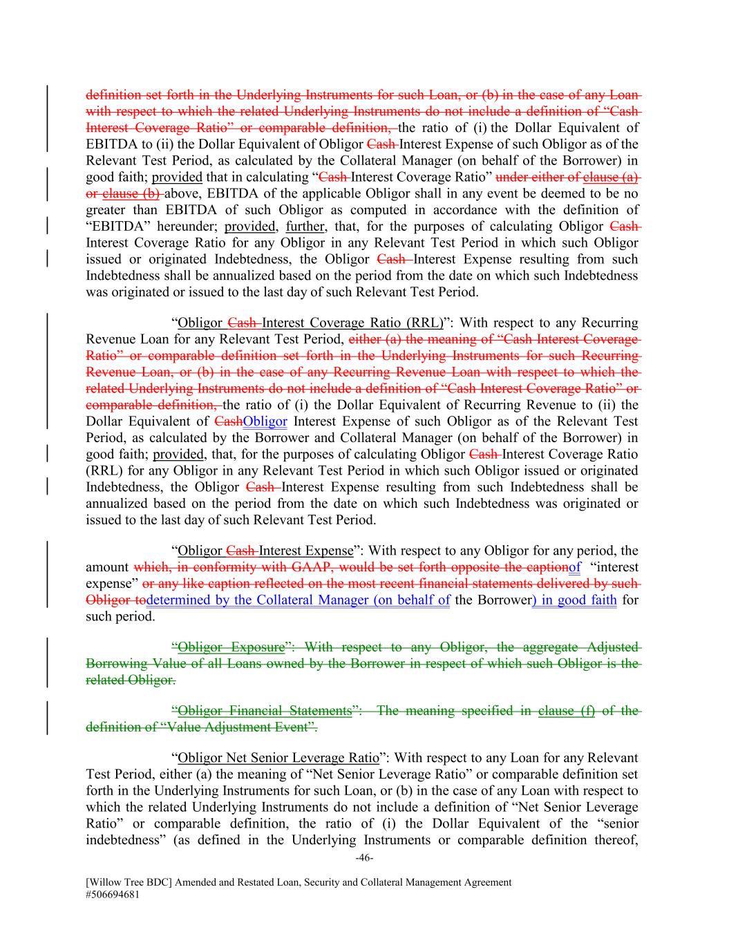 definition set forth in the Underlying Instruments for such Loan, or (b) in the case of any Loan with respect to which the related Underlying Instruments do not include a definition of “Cash Interest Coverage Ratio” or comparable definition, the ratio of (i) the Dollar Equivalent of EBITDA to (ii) the Dollar Equivalent of Obligor Cash Interest Expense of such Obligor as of the Relevant Test Period, as calculated by the Collateral Manager (on behalf of the Borrower) in good faith; provided that in calculating “Cash Interest Coverage Ratio” under either of clause (a) or clause (b) above, EBITDA of the applicable Obligor shall in any event be deemed to be no greater than EBITDA of such Obligor as computed in accordance with the definition of “EBITDA” hereunder; provided, further, that, for the purposes of calculating Obligor Cash Interest Coverage Ratio for any Obligor in any Relevant Test Period in which such Obligor issued or originated Indebtedness, the Obligor Cash Interest Expense resulting from such Indebtedness shall be annualized based on the period from the date on which such Indebtedness was originated or issued to the last day of such Relevant Test Period. “Obligor Cash Interest Coverage Ratio (RRL)”: With respect to any Recurring Revenue Loan for any Relevant Test Period, either (a) the meaning of “Cash Interest Coverage Ratio” or comparable definition set forth in the Underlying Instruments for such Recurring Revenue Loan, or (b) in the case of any Recurring Revenue Loan with respect to which the related Underlying Instruments do not include a definition of “Cash Interest Coverage Ratio” or comparable definition, the ratio of (i) the Dollar Equivalent of Recurring Revenue to (ii) the Dollar Equivalent of CashObligor Interest Expense of such Obligor as of the Relevant Test Period, as calculated by the Borrower and Collateral Manager (on behalf of the Borrower) in good faith; provided, that, for the purposes of calculating Obligor Cash Interest Coverage Ratio (RRL) for any Obligor in any Relevant Test Period in which such Obligor issued or originated Indebtedness, the Obligor Cash Interest Expense resulting from such Indebtedness shall be annualized based on the period from the date on which such Indebtedness was originated or issued to the last day of such Relevant Test Period. “Obligor Cash Interest Expense”: With respect to any Obligor for any period, the amount which, in conformity with GAAP, would be set forth opposite the captionof “interest expense” or any like caption reflected on the most recent financial statements delivered by such Obligor todetermined by the Collateral Manager (on behalf of the Borrower) in good faith for such period. “Obligor Exposure”: With respect to any Obligor, the aggregate Adjusted Borrowing Value of all Loans owned by the Borrower in respect of which such Obligor is the related Obligor. “Obligor Financial Statements”: The meaning specified in clause (f) of the definition of “Value Adjustment Event”. “Obligor Net Senior Leverage Ratio”: With respect to any Loan for any Relevant Test Period, either (a) the meaning of “Net Senior Leverage Ratio” or comparable definition set forth in the Underlying Instruments for such Loan, or (b) in the case of any Loan with respect to which the related Underlying Instruments do not include a definition of “Net Senior Leverage Ratio” or comparable definition, the ratio of (i) the Dollar Equivalent of the “senior indebtedness” (as defined in the Underlying Instruments or comparable definition thereof, -46- [Willow Tree BDC] Amended and Restated Loan, Security and Collateral Management Agreement #506694681