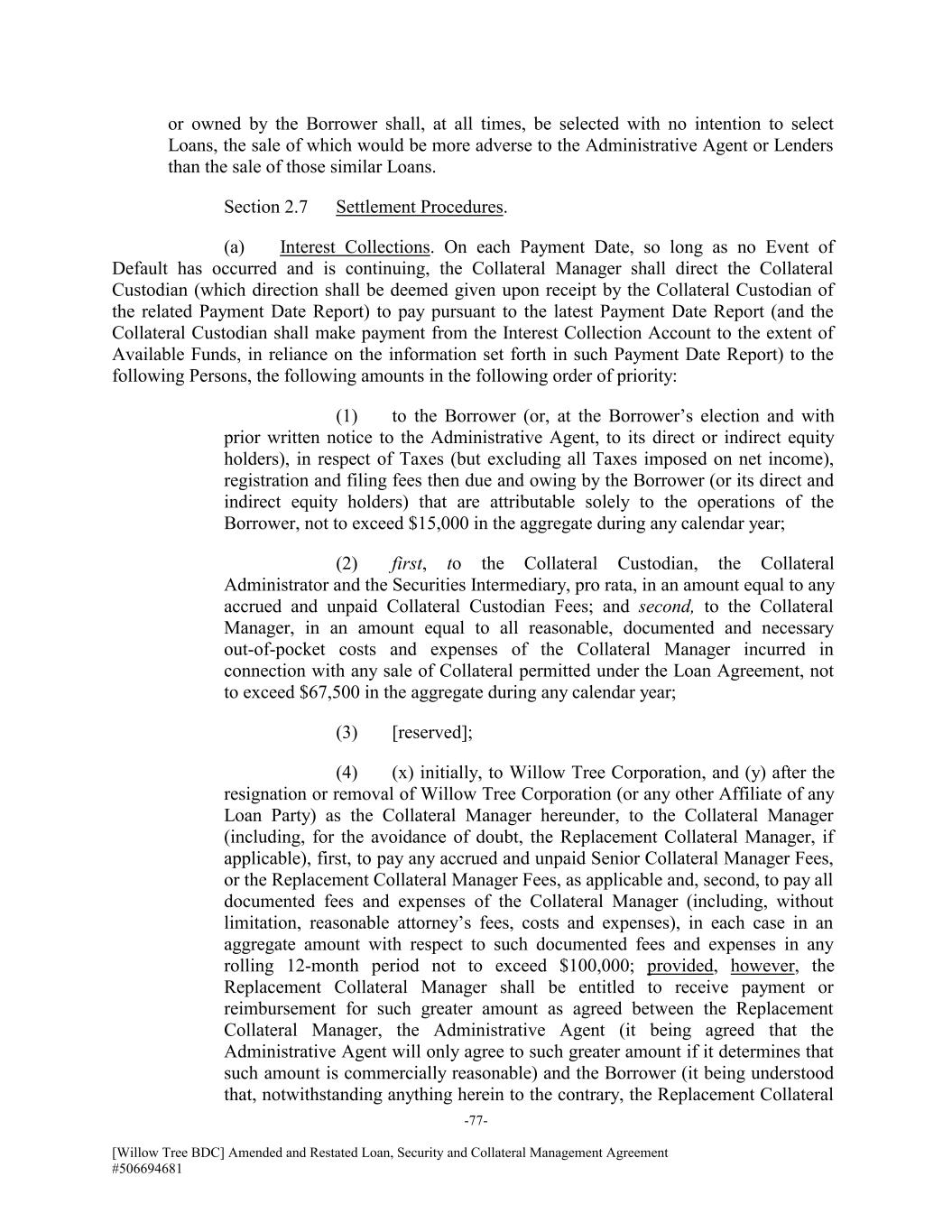 or owned by the Borrower shall, at all times, be selected with no intention to select Loans, the sale of which would be more adverse to the Administrative Agent or Lenders than the sale of those similar Loans. Section 2.7 Settlement Procedures. (a) Interest Collections. On each Payment Date, so long as no Event of Default has occurred and is continuing, the Collateral Manager shall direct the Collateral Custodian (which direction shall be deemed given upon receipt by the Collateral Custodian of the related Payment Date Report) to pay pursuant to the latest Payment Date Report (and the Collateral Custodian shall make payment from the Interest Collection Account to the extent of Available Funds, in reliance on the information set forth in such Payment Date Report) to the following Persons, the following amounts in the following order of priority: (1) to the Borrower (or, at the Borrower’s election and with prior written notice to the Administrative Agent, to its direct or indirect equity holders), in respect of Taxes (but excluding all Taxes imposed on net income), registration and filing fees then due and owing by the Borrower (or its direct and indirect equity holders) that are attributable solely to the operations of the Borrower, not to exceed $15,000 in the aggregate during any calendar year; (2) first, to the Collateral Custodian, the Collateral Administrator and the Securities Intermediary, pro rata, in an amount equal to any accrued and unpaid Collateral Custodian Fees; and second, to the Collateral Manager, in an amount equal to all reasonable, documented and necessary out-of-pocket costs and expenses of the Collateral Manager incurred in connection with any sale of Collateral permitted under the Loan Agreement, not to exceed $67,500 in the aggregate during any calendar year; (3) [reserved]; (4) (x) initially, to Willow Tree Corporation, and (y) after the resignation or removal of Willow Tree Corporation (or any other Affiliate of any Loan Party) as the Collateral Manager hereunder, to the Collateral Manager (including, for the avoidance of doubt, the Replacement Collateral Manager, if applicable), first, to pay any accrued and unpaid Senior Collateral Manager Fees, or the Replacement Collateral Manager Fees, as applicable and, second, to pay all documented fees and expenses of the Collateral Manager (including, without limitation, reasonable attorney’s fees, costs and expenses), in each case in an aggregate amount with respect to such documented fees and expenses in any rolling 12-month period not to exceed $100,000; provided, however, the Replacement Collateral Manager shall be entitled to receive payment or reimbursement for such greater amount as agreed between the Replacement Collateral Manager, the Administrative Agent (it being agreed that the Administrative Agent will only agree to such greater amount if it determines that such amount is commercially reasonable) and the Borrower (it being understood that, notwithstanding anything herein to the contrary, the Replacement Collateral -77- [Willow Tree BDC] Amended and Restated Loan, Security and Collateral Management Agreement #506694681