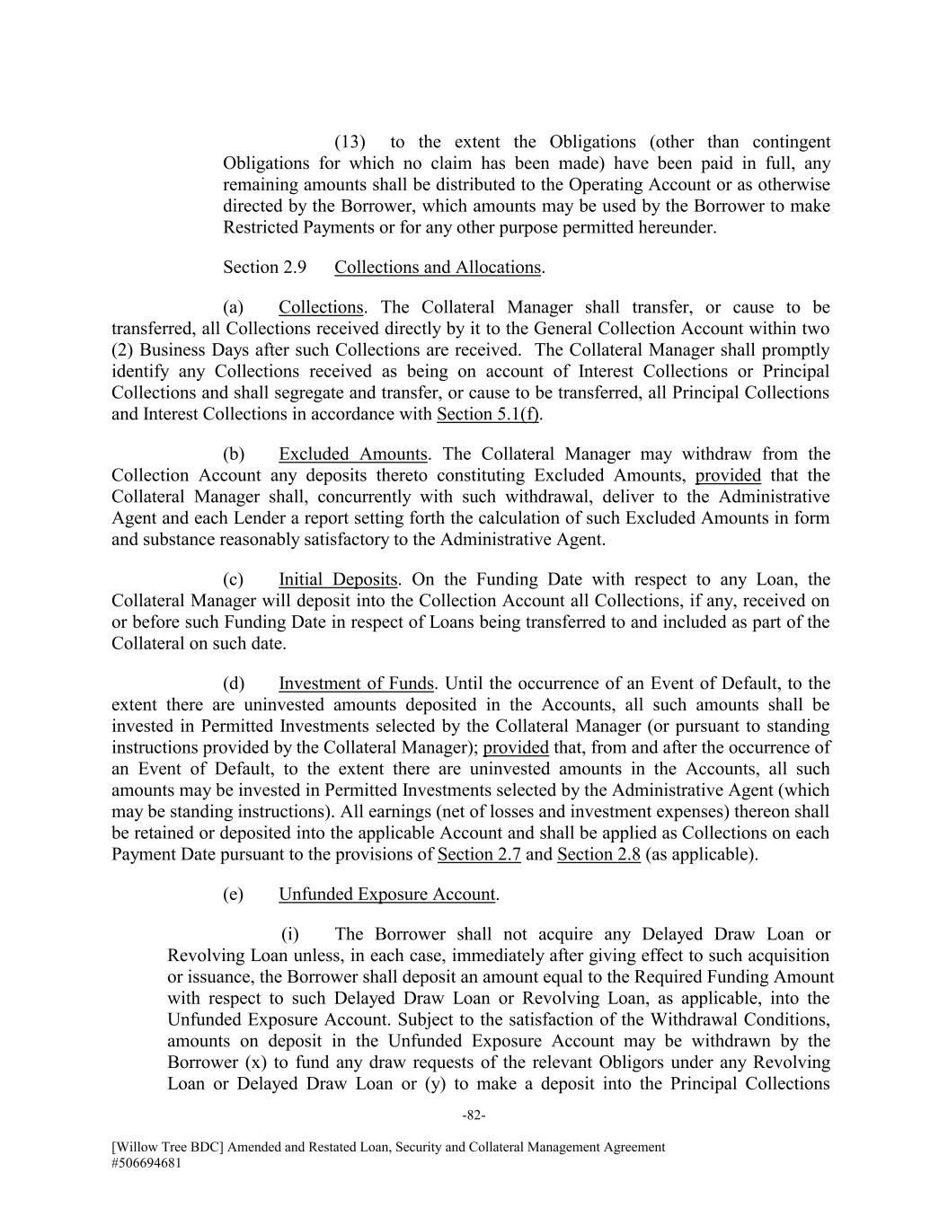 (13) to the extent the Obligations (other than contingent Obligations for which no claim has been made) have been paid in full, any remaining amounts shall be distributed to the Operating Account or as otherwise directed by the Borrower, which amounts may be used by the Borrower to make Restricted Payments or for any other purpose permitted hereunder. Section 2.9 Collections and Allocations. (a) Collections. The Collateral Manager shall transfer, or cause to be transferred, all Collections received directly by it to the General Collection Account within two (2) Business Days after such Collections are received. The Collateral Manager shall promptly identify any Collections received as being on account of Interest Collections or Principal Collections and shall segregate and transfer, or cause to be transferred, all Principal Collections and Interest Collections in accordance with Section 5.1(f). (b) Excluded Amounts. The Collateral Manager may withdraw from the Collection Account any deposits thereto constituting Excluded Amounts, provided that the Collateral Manager shall, concurrently with such withdrawal, deliver to the Administrative Agent and each Lender a report setting forth the calculation of such Excluded Amounts in form and substance reasonably satisfactory to the Administrative Agent. (c) Initial Deposits. On the Funding Date with respect to any Loan, the Collateral Manager will deposit into the Collection Account all Collections, if any, received on or before such Funding Date in respect of Loans being transferred to and included as part of the Collateral on such date. (d) Investment of Funds. Until the occurrence of an Event of Default, to the extent there are uninvested amounts deposited in the Accounts, all such amounts shall be invested in Permitted Investments selected by the Collateral Manager (or pursuant to standing instructions provided by the Collateral Manager); provided that, from and after the occurrence of an Event of Default, to the extent there are uninvested amounts in the Accounts, all such amounts may be invested in Permitted Investments selected by the Administrative Agent (which may be standing instructions). All earnings (net of losses and investment expenses) thereon shall be retained or deposited into the applicable Account and shall be applied as Collections on each Payment Date pursuant to the provisions of Section 2.7 and Section 2.8 (as applicable). (e) Unfunded Exposure Account. (i) The Borrower shall not acquire any Delayed Draw Loan or Revolving Loan unless, in each case, immediately after giving effect to such acquisition or issuance, the Borrower shall deposit an amount equal to the Required Funding Amount with respect to such Delayed Draw Loan or Revolving Loan, as applicable, into the Unfunded Exposure Account. Subject to the satisfaction of the Withdrawal Conditions, amounts on deposit in the Unfunded Exposure Account may be withdrawn by the Borrower (x) to fund any draw requests of the relevant Obligors under any Revolving Loan or Delayed Draw Loan or (y) to make a deposit into the Principal Collections -82- [Willow Tree BDC] Amended and Restated Loan, Security and Collateral Management Agreement #506694681