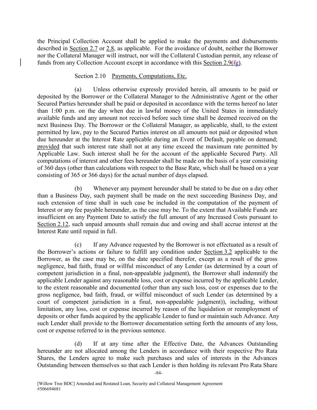the Principal Collection Account shall be applied to make the payments and disbursements described in Section 2.7 or 2.8, as applicable. For the avoidance of doubt, neither the Borrower nor the Collateral Manager will instruct, nor will the Collateral Custodian permit, any release of funds from any Collection Account except in accordance with this Section 2.9(fg). Section 2.10 Payments, Computations, Etc. (a) Unless otherwise expressly provided herein, all amounts to be paid or deposited by the Borrower or the Collateral Manager to the Administrative Agent or the other Secured Parties hereunder shall be paid or deposited in accordance with the terms hereof no later than 1:00 p.m. on the day when due in lawful money of the United States in immediately available funds and any amount not received before such time shall be deemed received on the next Business Day. The Borrower or the Collateral Manager, as applicable, shall, to the extent permitted by law, pay to the Secured Parties interest on all amounts not paid or deposited when due hereunder at the Interest Rate applicable during an Event of Default, payable on demand; provided that such interest rate shall not at any time exceed the maximum rate permitted by Applicable Law. Such interest shall be for the account of the applicable Secured Party. All computations of interest and other fees hereunder shall be made on the basis of a year consisting of 360 days (other than calculations with respect to the Base Rate, which shall be based on a year consisting of 365 or 366 days) for the actual number of days elapsed. (b) Whenever any payment hereunder shall be stated to be due on a day other than a Business Day, such payment shall be made on the next succeeding Business Day, and such extension of time shall in such case be included in the computation of the payment of Interest or any fee payable hereunder, as the case may be. To the extent that Available Funds are insufficient on any Payment Date to satisfy the full amount of any Increased Costs pursuant to Section 2.12, such unpaid amounts shall remain due and owing and shall accrue interest at the Interest Rate until repaid in full. (c) If any Advance requested by the Borrower is not effectuated as a result of the Borrower’s actions or failure to fulfill any condition under Section 3.2 applicable to the Borrower, as the case may be, on the date specified therefor, except as a result of the gross negligence, bad faith, fraud or willful misconduct of any Lender (as determined by a court of competent jurisdiction in a final, non-appealable judgment), the Borrower shall indemnify the applicable Lender against any reasonable loss, cost or expense incurred by the applicable Lender, to the extent reasonable and documented (other than any such loss, cost or expenses due to the gross negligence, bad faith, fraud, or willful misconduct of such Lender (as determined by a court of competent jurisdiction in a final, non-appealable judgment)), including, without limitation, any loss, cost or expense incurred by reason of the liquidation or reemployment of deposits or other funds acquired by the applicable Lender to fund or maintain such Advance. Any such Lender shall provide to the Borrower documentation setting forth the amounts of any loss, cost or expense referred to in the previous sentence. (d) If at any time after the Effective Date, the Advances Outstanding hereunder are not allocated among the Lenders in accordance with their respective Pro Rata Shares, the Lenders agree to make such purchases and sales of interests in the Advances Outstanding between themselves so that each Lender is then holding its relevant Pro Rata Share -84- [Willow Tree BDC] Amended and Restated Loan, Security and Collateral Management Agreement #506694681