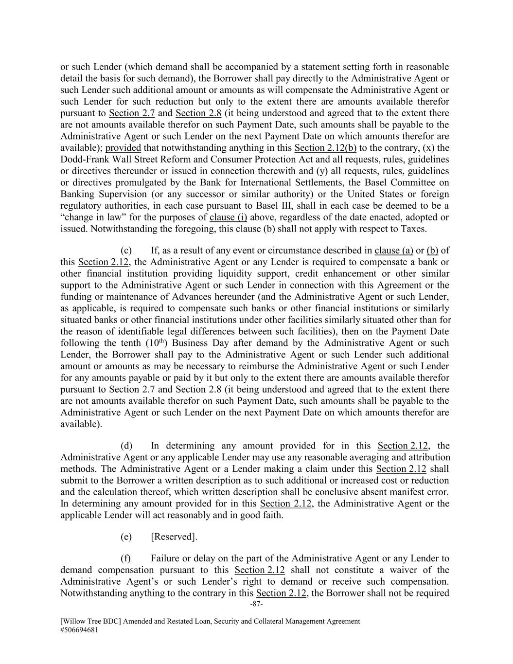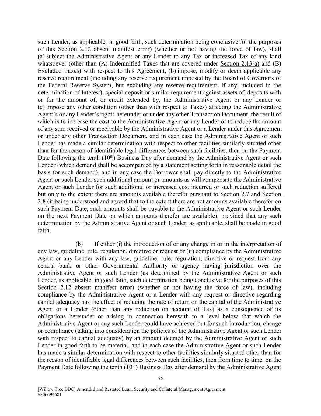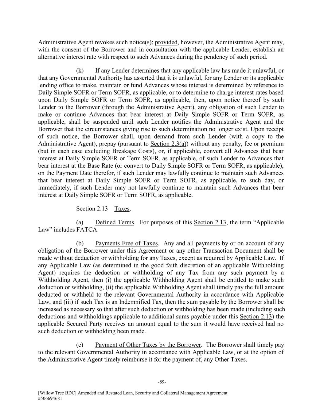 of Advances Outstanding based on their Commitments at such time (such purchases and sales shall be arranged through the Administrative Agent and each Lender hereby agrees to execute such further instruments and documents, if any, as the Administrative Agent may reasonably request in connection therewith), with all subsequent extensions of credit under this Agreement to be made in accordance with the respective Pro Rata Shares, of the Lenders from time to time party to this Agreement as provided herein. (e) The Borrower shall have the option to (i) request that any Advance bear interest at Term SOFR or (ii) continue any Advance that bears interest at Term SOFR as an Advance that bears interest at Term SOFR upon the expiration of the applicable Interest Period and the succeeding Interest Period of that continued Advance shall commence on the last day of the Interest Period of the Advance to be continued. Any such election must be made by no later than 12:00 p.m. on the third (3rd) U.S. Government Securities Business Day prior to (1) the Interest Period of any proposed Advance that bears interest at Term SOFR, or (2) the end of the Interest Period with respect to any Advance that bears interest at Term SOFR to be continued as such. If no election is received with respect to an Advance that bears interest at Term SOFR by 12:00 p.m. on the third (3rd) U.S. Government Securities Business Day prior to the end of the Interest Period with respect thereto, such Loan shall be converted to a Loan that bears interest at Daily Simple SOFR at the end of its Interest Period. Borrower must make such election by notice to the Administrative Agent in writing. In the case of any continuation, such election must be made pursuant to a Notice of Continuation, to the Administrative Agent (with a copy to the Collateral Custodian). Notwithstanding the foregoing, at no time shall there be more than six (6) Advances that bear interest at Term SOFR outstanding. (f) In the event the Collateral Custodian receives instructions from the Collateral Manager or the Borrower which conflict with any instruction received by the Administrative Agent with respect to dispositions of the Collateral, the Collateral Custodian shall rely on and follow the instructions given by the Administrative Agent. Section 2.11 Fees. (a) The Collateral Custodian, the Collateral Administrator and the Securities Intermediary shall be entitled to receive the Collateral Custodian Fees in accordance with Sections 2.7 and 2.8, as applicable. (b) On each Payment Date during the Revolving Period and, if applicable, the Payment Date immediately after the end of the Revolving Period, the Borrower shall pay to the Administrative Agent, for the benefit of the Lenders, the allocated portion (based on the unused Commitment of each Lender) of the Non-Usage Fee. Section 2.12 Increased Costs; Capital Adequacy; Illegality. (a) If either (i) the introduction of or any change (including any change by way of imposition or increase of reserve requirements) in or in the interpretation of any Applicable Law or (ii) the compliance by the Administrative Agent or any Lender with any guideline or request from any central bank or other Governmental Authority having jurisdiction over the Administrative Agent or such Lender (as determined by the Administrative Agent or -85- [Willow Tree BDC] Amended and Restated Loan, Security and Collateral Management Agreement #506694681