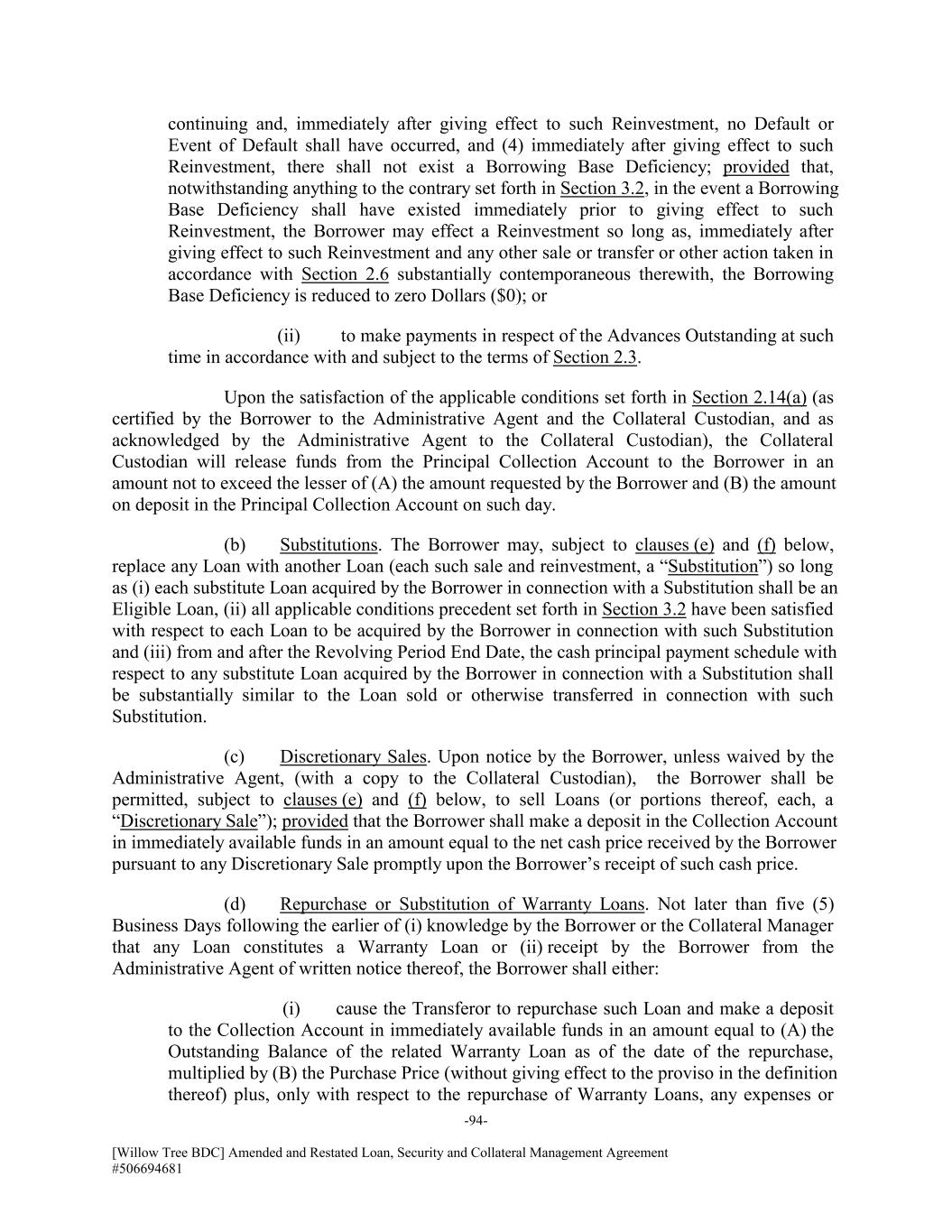 other than the principal of Advances Outstanding, then due under this Agreement, including, without limitation, any other Obligations; (14) [reserved]; (15) to be distributed at the discretion of the Collateral Manager (i) during the Revolving Period, to the Principal Collection Account to be used (on such Payment Date or maintained in the Principal Collection Account for such use) with respect to any Reinvestment of Principal Collections and the acquisition of Loans as permitted by this Agreement, (ii) to repay the Advances Outstanding or (iii) to reimburse the Collateral Manager for any unreimbursed amounts paid by the Collateral Manager on the Borrower’s behalf pursuant to this Agreement, to the extent not otherwise reimbursed hereunder; provided that any Available Funds in the Interest Collection Account not distributed or maintained pursuant to this clause (15) shall, on such Payment Date, be distributed in accordance with the remainder of this Section 2.7(a); and (16) any remaining amounts shall be distributed (i) if a Default (about which notice has been given to the Borrower or the Borrower otherwise has knowledge thereof) has occurred and is continuing, to the Interest Collection Account, or (ii) otherwise, to the Operating Account or as otherwise directed by the Borrower, which amounts may be used by the Borrower to make Restricted Payments or for any other purpose permitted hereunder. (b) Principal Collections. On each Payment Date, so long as no Event of Default has occurred and is continuing, the Collateral Manager shall direct (which direction shall be deemed given upon receipt by the Collateral Custodian of the related Payment Date Report) the Collateral Custodian to pay pursuant to the latest Payment Date Report (and the Collateral Custodian shall make payment from the Principal Collection Account to the extent of Available Funds, in reliance on the information set forth in such Payment Date Report) to the following Persons, the following amounts in the following order of priority: (1) to the extent not paid pursuant to Section 2.7(a), to the applicable Person, in the order of priority set forth in Section 2.7(a), such amounts payable pursuant to clauses (1) through (8) thereof; (2) during the Revolving Period, to be distributed at the discretion of the Collateral Manager (i) to be used (on such Payment Date or maintained in the Principal Collection Account for such use) with respect to any Reinvestment of Principal Collections and the acquisition of Loans as permitted by this Agreement or (ii) to repay the Advances Outstanding; provided that any Available Funds in the Principal Collection Account not distributed or maintained pursuant to this clause (2) shall, on such Payment Date, be distributed in accordance with the remainder of this Section 2.7(b); (3) to the extent not paid pursuant to Section 2.7(a), to the applicable Person, in the order of priority set forth in Section 2.7(a), such amounts payable pursuant to clause (9) thereof; -79- [Willow Tree BDC] Amended and Restated Loan, Security and Collateral Management Agreement #506694681