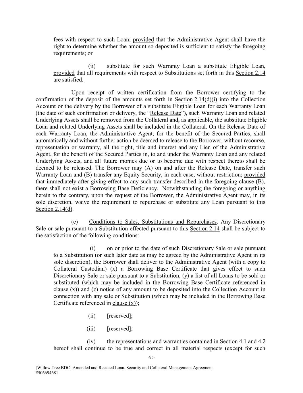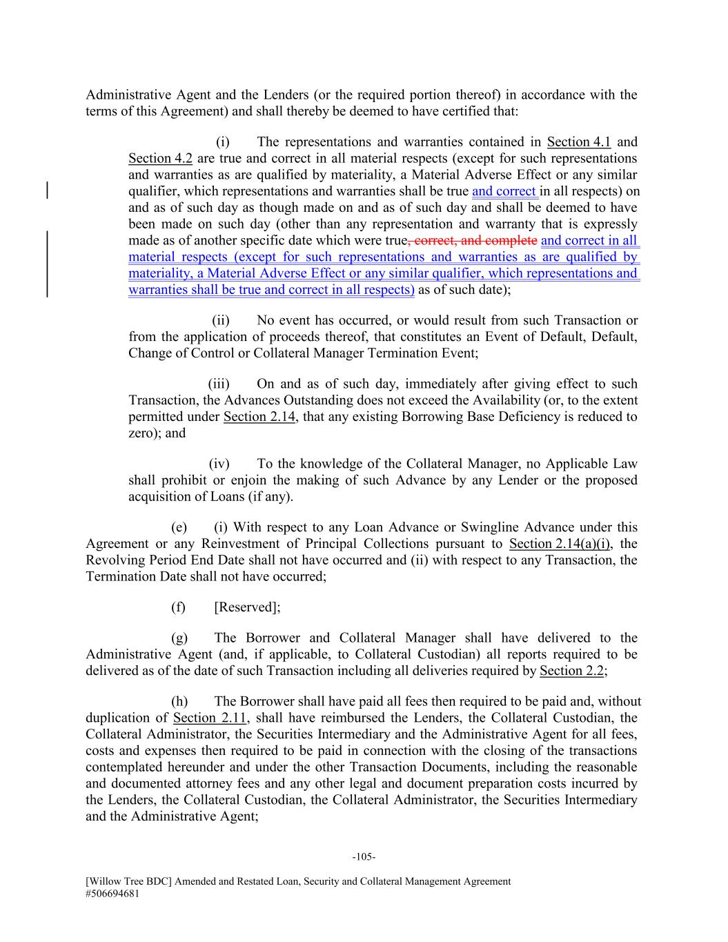 Administrative Agent and the Lenders (or the required portion thereof) in accordance with the terms of this Agreement) and shall thereby be deemed to have certified that: (i) The representations and warranties contained in Section 4.1 and Section 4.2 are true and correct in all material respects (except for such representations and warranties as are qualified by materiality, a Material Adverse Effect or any similar qualifier, which representations and warranties shall be true and correct in all respects) on and as of such day as though made on and as of such day and shall be deemed to have been made on such day (other than any representation and warranty that is expressly made as of another specific date which were true, correct, and complete and correct in all material respects (except for such representations and warranties as are qualified by materiality, a Material Adverse Effect or any similar qualifier, which representations and warranties shall be true and correct in all respects) as of such date); (ii) No event has occurred, or would result from such Transaction or from the application of proceeds thereof, that constitutes an Event of Default, Default, Change of Control or Collateral Manager Termination Event; (iii) On and as of such day, immediately after giving effect to such Transaction, the Advances Outstanding does not exceed the Availability (or, to the extent permitted under Section 2.14, that any existing Borrowing Base Deficiency is reduced to zero); and (iv) To the knowledge of the Collateral Manager, no Applicable Law shall prohibit or enjoin the making of such Advance by any Lender or the proposed acquisition of Loans (if any). (e) (i) With respect to any Loan Advance or Swingline Advance under this Agreement or any Reinvestment of Principal Collections pursuant to Section 2.14(a)(i), the Revolving Period End Date shall not have occurred and (ii) with respect to any Transaction, the Termination Date shall not have occurred; (f) [Reserved]; (g) The Borrower and Collateral Manager shall have delivered to the Administrative Agent (and, if applicable, to Collateral Custodian) all reports required to be delivered as of the date of such Transaction including all deliveries required by Section 2.2; (h) The Borrower shall have paid all fees then required to be paid and, without duplication of Section 2.11, shall have reimbursed the Lenders, the Collateral Custodian, the Collateral Administrator, the Securities Intermediary and the Administrative Agent for all fees, costs and expenses then required to be paid in connection with the closing of the transactions contemplated hereunder and under the other Transaction Documents, including the reasonable and documented attorney fees and any other legal and document preparation costs incurred by the Lenders, the Collateral Custodian, the Collateral Administrator, the Securities Intermediary and the Administrative Agent; -105- [Willow Tree BDC] Amended and Restated Loan, Security and Collateral Management Agreement #506694681