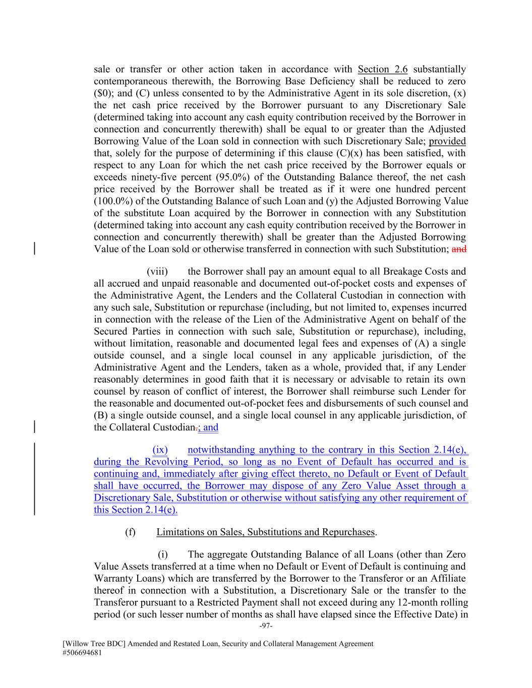 liquidation of all or any portion of the Collateral (after deducting the reasonable expenses of such sale or liquidation) would be sufficient to discharge in full the Obligations (or in the case of a sale of less than all of the Collateral, an amount sufficient to discharge the amount of the Obligations attributable to such portion of the Collateral); or (ii) the Required Lenders direct such sale and liquidation; provided further that, notwithstanding anything to the contrary set forth herein, the Administrative Agent will not cause or direct the sale of any Loans or other Collateral if, at the time of such sale, the only Event of Default that has occurred and is then continuing is (A) an Event of Default resulting from the occurrence of a Collateral Manager Termination Event which resulted solely under clause (c) or clause (i) of the definition thereof and/or (B) an Event of Default pursuant to Section 9.1(j) or Section 9.1(k), in either case, resulting from judgments, decrees or orders against the Collateral Manager or the Transferor. The Borrower agrees that, to the extent notice of sale shall be required by law, ten (10) days’ notice to the Borrower of any sale hereunder shall constitute reasonable notification. All cash Proceeds received by the Administrative Agent in respect of any sale of, collection from, or other realization upon, all or any part of the Loans (after payment of any amounts incurred in connection with such sale) shall be deposited into the Collection Account and to be applied pursuant to Section 2.8. The occurrence of a Termination Date as defined in clauses (a) and (b), inclusive, of the definition of “Termination Date” shall constitute a Termination Date for the purposes of this Section 9.2. (c) (i) If the Administrative Agent or the Replacement Collateral Manager elects to sell the Collateral, in whole, or in part, at a public or private sale, in one or more transactions, the Borrower and/or any Affiliate designated by the Borrower or the Transferor may purchase the Collateral, in whole but not in part, prior to such sale at a purchase price that is not less than the amount of the Obligations as of the date of such proposed sale. The Borrower’s and the Transferor’s right to purchase the Collateral pursuant to this clause (i) and any related limitation on the Administrative Agent’s or the Replacement Collateral Manager’s right to sell any or all of the Collateral shall terminate at 4:00 p.m. on the tenth (10th) Business Day following the Business Day on which the Borrower receives notice of the Administrative Agent’s or the Replacement Collateral Manager’s election to sell all or any portion of such Collateral. Notwithstanding anything herein to the contrary, neither the Administrative Agent nor any Replacement Collateral Manager shall have any right to sell any or all of the Collateral during the time that the Borrower and/or the Transferor is entitled to exercise its right to purchase the Collateral pursuant to this Section 9.2(c), and any sale of any or all of the Collateral by the Administrative Agent or any Replacement Collateral Manager shall be subject to this Section 9.2(c). (ii) In addition to the Borrower’s and the Transferor’s rights set forth in clause (c)(i) above, in connection with any sale or disposition of Collateral: (1) It is understood that the Borrower and/or any Affiliate of the Borrower may purchase the Collateral at a price not less than the amount of the Obligations as of the date of such proposed sale. (2) It is understood that each of the Borrower and the Transferor may submit its bid for the Collateral as a combined bid with the bids of -163- [Willow Tree BDC] Amended and Restated Loan, Security and Collateral Management Agreement #506694681