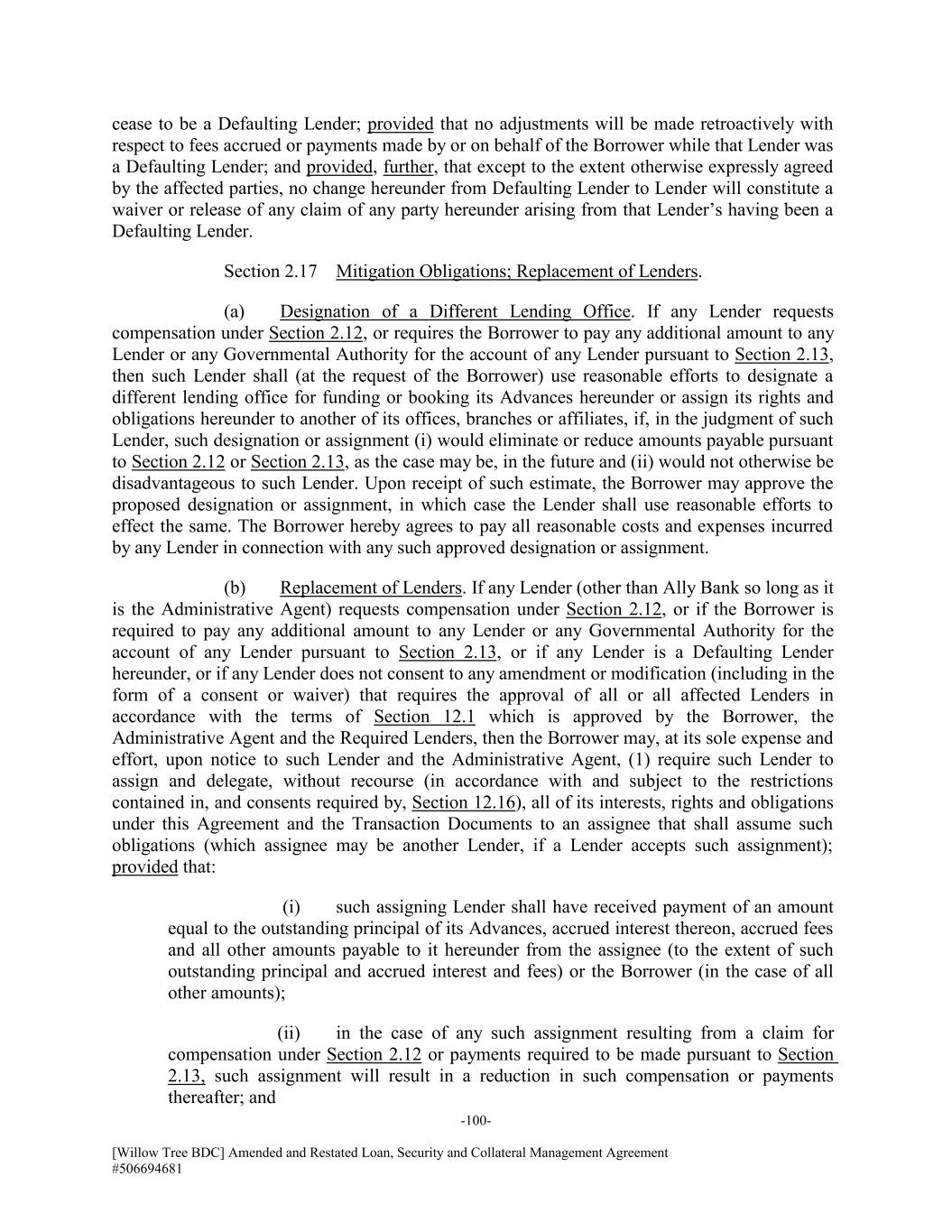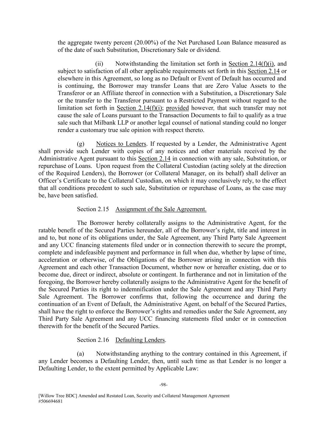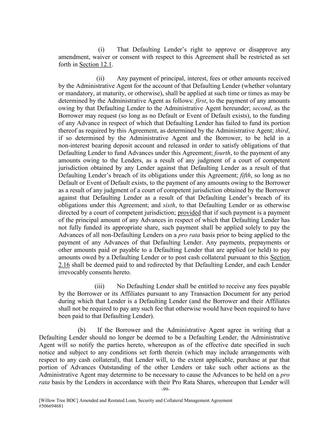 Defaulting Lender pursuant to Section 2.16(b), then the Administrative Agent shall have the right to cause such Person to assign its entire interest in the Advances and Commitments and this Agreement to a transferee selected by the Administrative Agent and, except during the continuance of an Event of Default, with the consent of the Borrower, in an assignment which satisfies the conditions set forth in the first sentence of this Section 12.16(a). Assignments and participations shall be subject to the following additional conditions, as applicable: (1) no assignments or participations shall be made to (x) the Borrower or any of the Borrower’s Affiliates or Subsidiaries or (y) any Defaulting Lender or any of its Subsidiaries, or any Person who, upon becoming a Lender hereunder, would constitute any of the foregoing Persons described in this clause (y); (2) no assignments or participations shall be made to a natural person; (3) except in the case of an assignment to a Lender or an Affiliate of a Lender or an Approved Fund or an assignment of the entire remaining amount of the assigning Lender’s Commitment or Loan Advances of any class, the amount of the Commitment or Loan Advances of the assigning Lender subject to each such assignment (determined as of the date the Assignment and Assumption with respect to such assignment is delivered to the Administrative Agent) shall not be less than $1,000,000 unless each of the Borrower and the Administrative Agent otherwise consent, provided that no such consent of the Borrower shall be required if an Event of Default has occurred and is continuing; (4) each partial assignment shall be made as an assignment of a proportionate part of all the assigning Lender’s rights and obligations under this Agreement; (5) the parties to each assignment shall execute and deliver to the Administrative Agent an Assignment and Assumption, together with a processing and recordation fee of $3,500, such fee to be paid by either the assigning Lender or the assignee Lender or shared between such Lenders; and (6) the assignee, if it shall not be a Lender, shall deliver to the Administrative Agent an Administrative Questionnaire in which the assignee designates one or more credit contacts to whom all syndicate-level information (which may contain material non-public information about the Borrower and its affiliates and their Related Parties or their respective securities) will be made available and who may receive such information in accordance with the assignee’s compliance procedures and applicable laws, including federal and state securities laws, and containing payment instruction for such assignee. (b) The Administrative Agent, acting solely for this purpose as an agent of the Borrower, shall maintain at one of its lending offices, a copy of each transfer pursuant to -190- [Willow Tree BDC] Amended and Restated Loan, Security and Collateral Management Agreement #506694681