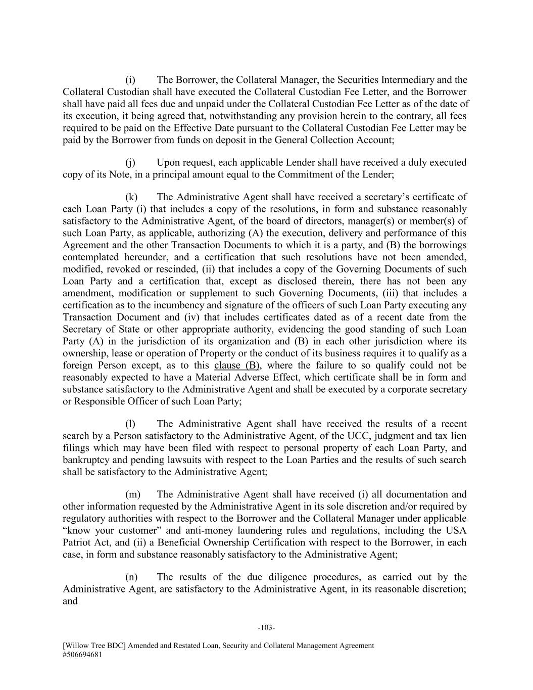 (i) The Borrower, the Collateral Manager, the Securities Intermediary and the Collateral Custodian shall have executed the Collateral Custodian Fee Letter, and the Borrower shall have paid all fees due and unpaid under the Collateral Custodian Fee Letter as of the date of its execution, it being agreed that, notwithstanding any provision herein to the contrary, all fees required to be paid on the Effective Date pursuant to the Collateral Custodian Fee Letter may be paid by the Borrower from funds on deposit in the General Collection Account; (j) Upon request, each applicable Lender shall have received a duly executed copy of its Note, in a principal amount equal to the Commitment of the Lender; (k) The Administrative Agent shall have received a secretary’s certificate of each Loan Party (i) that includes a copy of the resolutions, in form and substance reasonably satisfactory to the Administrative Agent, of the board of directors, manager(s) or member(s) of such Loan Party, as applicable, authorizing (A) the execution, delivery and performance of this Agreement and the other Transaction Documents to which it is a party, and (B) the borrowings contemplated hereunder, and a certification that such resolutions have not been amended, modified, revoked or rescinded, (ii) that includes a copy of the Governing Documents of such Loan Party and a certification that, except as disclosed therein, there has not been any amendment, modification or supplement to such Governing Documents, (iii) that includes a certification as to the incumbency and signature of the officers of such Loan Party executing any Transaction Document and (iv) that includes certificates dated as of a recent date from the Secretary of State or other appropriate authority, evidencing the good standing of such Loan Party (A) in the jurisdiction of its organization and (B) in each other jurisdiction where its ownership, lease or operation of Property or the conduct of its business requires it to qualify as a foreign Person except, as to this clause (B), where the failure to so qualify could not be reasonably expected to have a Material Adverse Effect, which certificate shall be in form and substance satisfactory to the Administrative Agent and shall be executed by a corporate secretary or Responsible Officer of such Loan Party; (l) The Administrative Agent shall have received the results of a recent search by a Person satisfactory to the Administrative Agent, of the UCC, judgment and tax lien filings which may have been filed with respect to personal property of each Loan Party, and bankruptcy and pending lawsuits with respect to the Loan Parties and the results of such search shall be satisfactory to the Administrative Agent; (m) The Administrative Agent shall have received (i) all documentation and other information requested by the Administrative Agent in its sole discretion and/or required by regulatory authorities with respect to the Borrower and the Collateral Manager under applicable “know your customer” and anti-money laundering rules and regulations, including the USA Patriot Act, and (ii) a Beneficial Ownership Certification with respect to the Borrower, in each case, in form and substance reasonably satisfactory to the Administrative Agent; (n) The results of the due diligence procedures, as carried out by the Administrative Agent, are satisfactory to the Administrative Agent, in its reasonable discretion; and -103- [Willow Tree BDC] Amended and Restated Loan, Security and Collateral Management Agreement #506694681