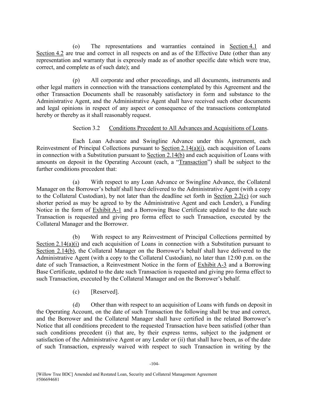(o) The representations and warranties contained in Section 4.1 and Section 4.2 are true and correct in all respects on and as of the Effective Date (other than any representation and warranty that is expressly made as of another specific date which were true, correct, and complete as of such date); and (p) All corporate and other proceedings, and all documents, instruments and other legal matters in connection with the transactions contemplated by this Agreement and the other Transaction Documents shall be reasonably satisfactory in form and substance to the Administrative Agent, and the Administrative Agent shall have received such other documents and legal opinions in respect of any aspect or consequence of the transactions contemplated hereby or thereby as it shall reasonably request. Section 3.2 Conditions Precedent to All Advances and Acquisitions of Loans. Each Loan Advance and Swingline Advance under this Agreement, each Reinvestment of Principal Collections pursuant to Section 2.14(a)(i), each acquisition of Loans in connection with a Substitution pursuant to Section 2.14(b) and each acquisition of Loans with amounts on deposit in the Operating Account (each, a “Transaction”) shall be subject to the further conditions precedent that: (a) With respect to any Loan Advance or Swingline Advance, the Collateral Manager on the Borrower’s behalf shall have delivered to the Administrative Agent (with a copy to the Collateral Custodian), by not later than the deadline set forth in Section 2.2(c) (or such shorter period as may be agreed to by the Administrative Agent and each Lender), a Funding Notice in the form of Exhibit A-1 and a Borrowing Base Certificate updated to the date such Transaction is requested and giving pro forma effect to such Transaction, executed by the Collateral Manager and the Borrower. (b) With respect to any Reinvestment of Principal Collections permitted by Section 2.14(a)(i) and each acquisition of Loans in connection with a Substitution pursuant to Section 2.14(b), the Collateral Manager on the Borrower’s behalf shall have delivered to the Administrative Agent (with a copy to the Collateral Custodian), no later than 12:00 p.m. on the date of such Transaction, a Reinvestment Notice in the form of Exhibit A-3 and a Borrowing Base Certificate, updated to the date such Transaction is requested and giving pro forma effect to such Transaction, executed by the Collateral Manager and on the Borrower’s behalf. (c) [Reserved]. (d) Other than with respect to an acquisition of Loans with funds on deposit in the Operating Account, on the date of such Transaction the following shall be true and correct, and the Borrower and the Collateral Manager shall have certified in the related Borrower’s Notice that all conditions precedent to the requested Transaction have been satisfied (other than such conditions precedent (i) that are, by their express terms, subject to the judgment or satisfaction of the Administrative Agent or any Lender or (ii) that shall have been, as of the date of such Transaction, expressly waived with respect to such Transaction in writing by the -104- [Willow Tree BDC] Amended and Restated Loan, Security and Collateral Management Agreement #506694681