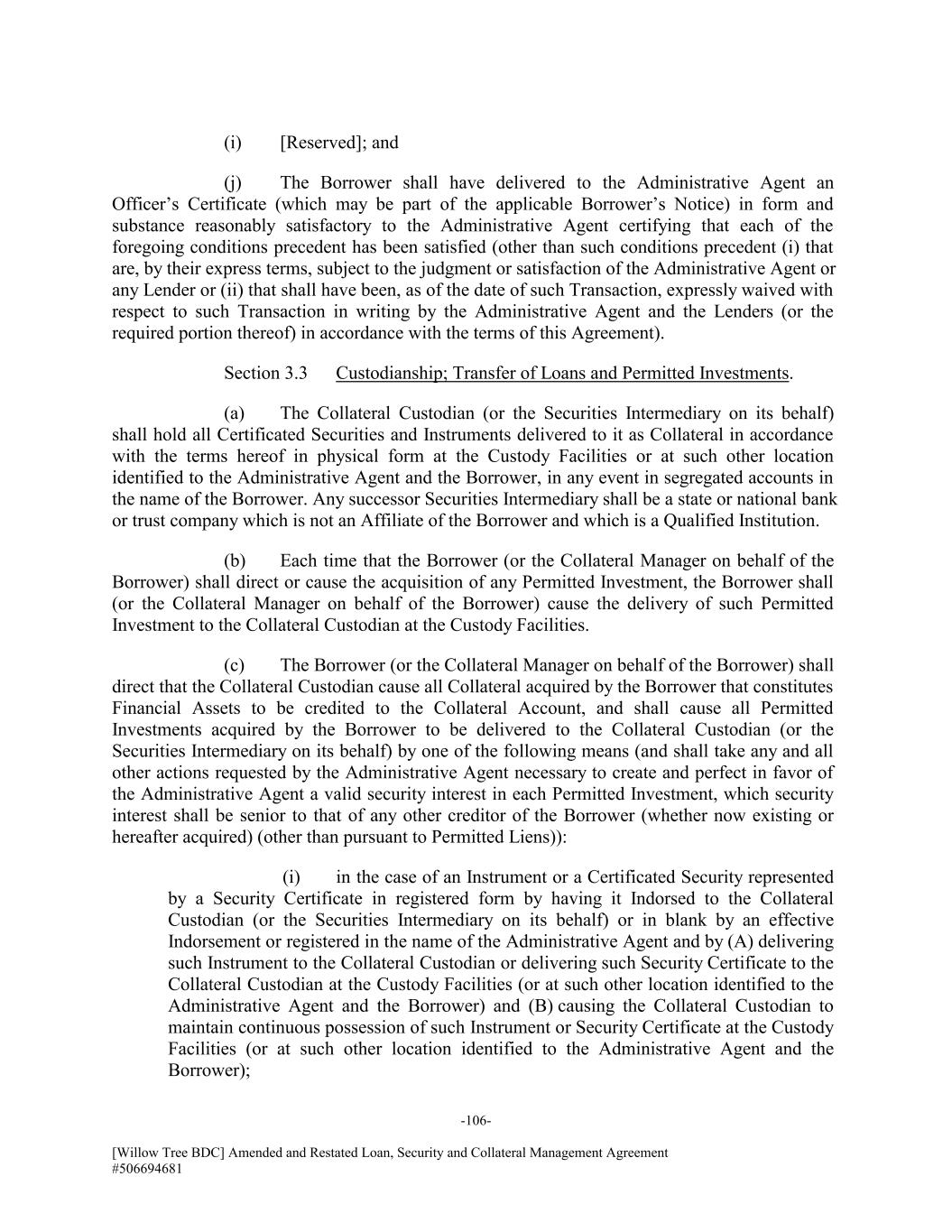 (i) [Reserved]; and (j) The Borrower shall have delivered to the Administrative Agent an Officer’s Certificate (which may be part of the applicable Borrower’s Notice) in form and substance reasonably satisfactory to the Administrative Agent certifying that each of the foregoing conditions precedent has been satisfied (other than such conditions precedent (i) that are, by their express terms, subject to the judgment or satisfaction of the Administrative Agent or any Lender or (ii) that shall have been, as of the date of such Transaction, expressly waived with respect to such Transaction in writing by the Administrative Agent and the Lenders (or the required portion thereof) in accordance with the terms of this Agreement). Section 3.3 Custodianship; Transfer of Loans and Permitted Investments. (a) The Collateral Custodian (or the Securities Intermediary on its behalf) shall hold all Certificated Securities and Instruments delivered to it as Collateral in accordance with the terms hereof in physical form at the Custody Facilities or at such other location identified to the Administrative Agent and the Borrower, in any event in segregated accounts in the name of the Borrower. Any successor Securities Intermediary shall be a state or national bank or trust company which is not an Affiliate of the Borrower and which is a Qualified Institution. (b) Each time that the Borrower (or the Collateral Manager on behalf of the Borrower) shall direct or cause the acquisition of any Permitted Investment, the Borrower shall (or the Collateral Manager on behalf of the Borrower) cause the delivery of such Permitted Investment to the Collateral Custodian at the Custody Facilities. (c) The Borrower (or the Collateral Manager on behalf of the Borrower) shall direct that the Collateral Custodian cause all Collateral acquired by the Borrower that constitutes Financial Assets to be credited to the Collateral Account, and shall cause all Permitted Investments acquired by the Borrower to be delivered to the Collateral Custodian (or the Securities Intermediary on its behalf) by one of the following means (and shall take any and all other actions requested by the Administrative Agent necessary to create and perfect in favor of the Administrative Agent a valid security interest in each Permitted Investment, which security interest shall be senior to that of any other creditor of the Borrower (whether now existing or hereafter acquired) (other than pursuant to Permitted Liens)): (i) in the case of an Instrument or a Certificated Security represented by a Security Certificate in registered form by having it Indorsed to the Collateral Custodian (or the Securities Intermediary on its behalf) or in blank by an effective Indorsement or registered in the name of the Administrative Agent and by (A) delivering such Instrument to the Collateral Custodian or delivering such Security Certificate to the Collateral Custodian at the Custody Facilities (or at such other location identified to the Administrative Agent and the Borrower) and (B) causing the Collateral Custodian to maintain continuous possession of such Instrument or Security Certificate at the Custody Facilities (or at such other location identified to the Administrative Agent and the Borrower); -106- [Willow Tree BDC] Amended and Restated Loan, Security and Collateral Management Agreement #506694681