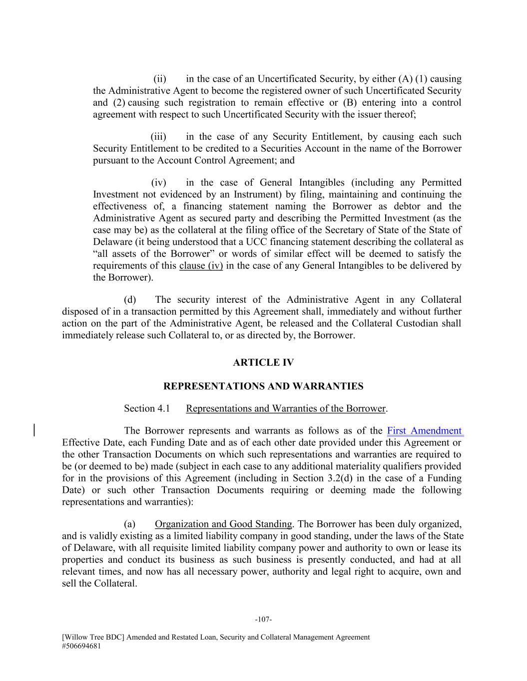 (ii) in the case of an Uncertificated Security, by either (A) (1) causing the Administrative Agent to become the registered owner of such Uncertificated Security and (2) causing such registration to remain effective or (B) entering into a control agreement with respect to such Uncertificated Security with the issuer thereof; (iii) in the case of any Security Entitlement, by causing each such Security Entitlement to be credited to a Securities Account in the name of the Borrower pursuant to the Account Control Agreement; and (iv) in the case of General Intangibles (including any Permitted Investment not evidenced by an Instrument) by filing, maintaining and continuing the effectiveness of, a financing statement naming the Borrower as debtor and the Administrative Agent as secured party and describing the Permitted Investment (as the case may be) as the collateral at the filing office of the Secretary of State of the State of Delaware (it being understood that a UCC financing statement describing the collateral as “all assets of the Borrower” or words of similar effect will be deemed to satisfy the requirements of this clause (iv) in the case of any General Intangibles to be delivered by the Borrower). (d) The security interest of the Administrative Agent in any Collateral disposed of in a transaction permitted by this Agreement shall, immediately and without further action on the part of the Administrative Agent, be released and the Collateral Custodian shall immediately release such Collateral to, or as directed by, the Borrower. ARTICLE IV REPRESENTATIONS AND WARRANTIES Section 4.1 Representations and Warranties of the Borrower. The Borrower represents and warrants as follows as of the First Amendment Effective Date, each Funding Date and as of each other date provided under this Agreement or the other Transaction Documents on which such representations and warranties are required to be (or deemed to be) made (subject in each case to any additional materiality qualifiers provided for in the provisions of this Agreement (including in Section 3.2(d) in the case of a Funding Date) or such other Transaction Documents requiring or deeming made the following representations and warranties): (a) Organization and Good Standing. The Borrower has been duly organized, and is validly existing as a limited liability company in good standing, under the laws of the State of Delaware, with all requisite limited liability company power and authority to own or lease its properties and conduct its business as such business is presently conducted, and had at all relevant times, and now has all necessary power, authority and legal right to acquire, own and sell the Collateral. -107- [Willow Tree BDC] Amended and Restated Loan, Security and Collateral Management Agreement #506694681
