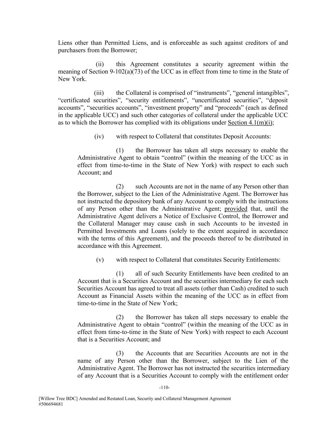 Liens other than Permitted Liens, and is enforceable as such against creditors of and purchasers from the Borrower; (ii) this Agreement constitutes a security agreement within the meaning of Section 9-102(a)(73) of the UCC as in effect from time to time in the State of New York. (iii) the Collateral is comprised of “instruments”, “general intangibles”, “certificated securities”, “security entitlements”, “uncertificated securities”, “deposit accounts”, “securities accounts”, “investment property” and “proceeds” (each as defined in the applicable UCC) and such other categories of collateral under the applicable UCC as to which the Borrower has complied with its obligations under Section 4.1(m)(i); (iv) with respect to Collateral that constitutes Deposit Accounts: (1) the Borrower has taken all steps necessary to enable the Administrative Agent to obtain “control” (within the meaning of the UCC as in effect from time-to-time in the State of New York) with respect to each such Account; and (2) such Accounts are not in the name of any Person other than the Borrower, subject to the Lien of the Administrative Agent. The Borrower has not instructed the depository bank of any Account to comply with the instructions of any Person other than the Administrative Agent; provided that, until the Administrative Agent delivers a Notice of Exclusive Control, the Borrower and the Collateral Manager may cause cash in such Accounts to be invested in Permitted Investments and Loans (solely to the extent acquired in accordance with the terms of this Agreement), and the proceeds thereof to be distributed in accordance with this Agreement. (v) with respect to Collateral that constitutes Security Entitlements: (1) all of such Security Entitlements have been credited to an Account that is a Securities Account and the securities intermediary for each such Securities Account has agreed to treat all assets (other than Cash) credited to such Account as Financial Assets within the meaning of the UCC as in effect from time-to-time in the State of New York; (2) the Borrower has taken all steps necessary to enable the Administrative Agent to obtain “control” (within the meaning of the UCC as in effect from time-to-time in the State of New York) with respect to each Account that is a Securities Account; and (3) the Accounts that are Securities Accounts are not in the name of any Person other than the Borrower, subject to the Lien of the Administrative Agent. The Borrower has not instructed the securities intermediary of any Account that is a Securities Account to comply with the entitlement order -110- [Willow Tree BDC] Amended and Restated Loan, Security and Collateral Management Agreement #506694681