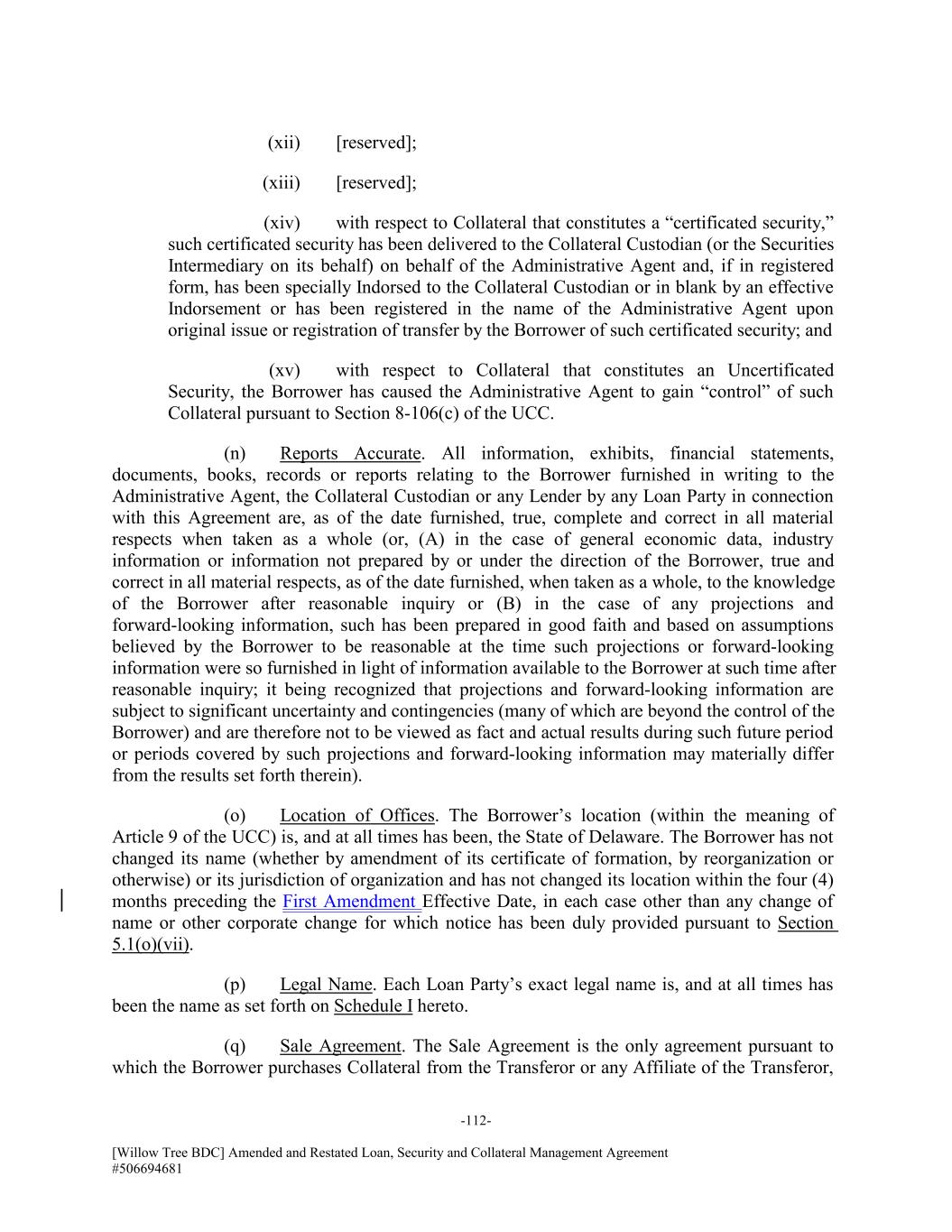(xii) [reserved]; (xiii) [reserved]; (xiv) with respect to Collateral that constitutes a “certificated security,” such certificated security has been delivered to the Collateral Custodian (or the Securities Intermediary on its behalf) on behalf of the Administrative Agent and, if in registered form, has been specially Indorsed to the Collateral Custodian or in blank by an effective Indorsement or has been registered in the name of the Administrative Agent upon original issue or registration of transfer by the Borrower of such certificated security; and (xv) with respect to Collateral that constitutes an Uncertificated Security, the Borrower has caused the Administrative Agent to gain “control” of such Collateral pursuant to Section 8-106(c) of the UCC. (n) Reports Accurate. All information, exhibits, financial statements, documents, books, records or reports relating to the Borrower furnished in writing to the Administrative Agent, the Collateral Custodian or any Lender by any Loan Party in connection with this Agreement are, as of the date furnished, true, complete and correct in all material respects when taken as a whole (or, (A) in the case of general economic data, industry information or information not prepared by or under the direction of the Borrower, true and correct in all material respects, as of the date furnished, when taken as a whole, to the knowledge of the Borrower after reasonable inquiry or (B) in the case of any projections and forward-looking information, such has been prepared in good faith and based on assumptions believed by the Borrower to be reasonable at the time such projections or forward-looking information were so furnished in light of information available to the Borrower at such time after reasonable inquiry; it being recognized that projections and forward-looking information are subject to significant uncertainty and contingencies (many of which are beyond the control of the Borrower) and are therefore not to be viewed as fact and actual results during such future period or periods covered by such projections and forward-looking information may materially differ from the results set forth therein). (o) Location of Offices. The Borrower’s location (within the meaning of Article 9 of the UCC) is, and at all times has been, the State of Delaware. The Borrower has not changed its name (whether by amendment of its certificate of formation, by reorganization or otherwise) or its jurisdiction of organization and has not changed its location within the four (4) months preceding the First Amendment Effective Date, in each case other than any change of name or other corporate change for which notice has been duly provided pursuant to Section 5.1(o)(vii). (p) Legal Name. Each Loan Party’s exact legal name is, and at all times has been the name as set forth on Schedule I hereto. (q) Sale Agreement. The Sale Agreement is the only agreement pursuant to which the Borrower purchases Collateral from the Transferor or any Affiliate of the Transferor, -112- [Willow Tree BDC] Amended and Restated Loan, Security and Collateral Management Agreement #506694681