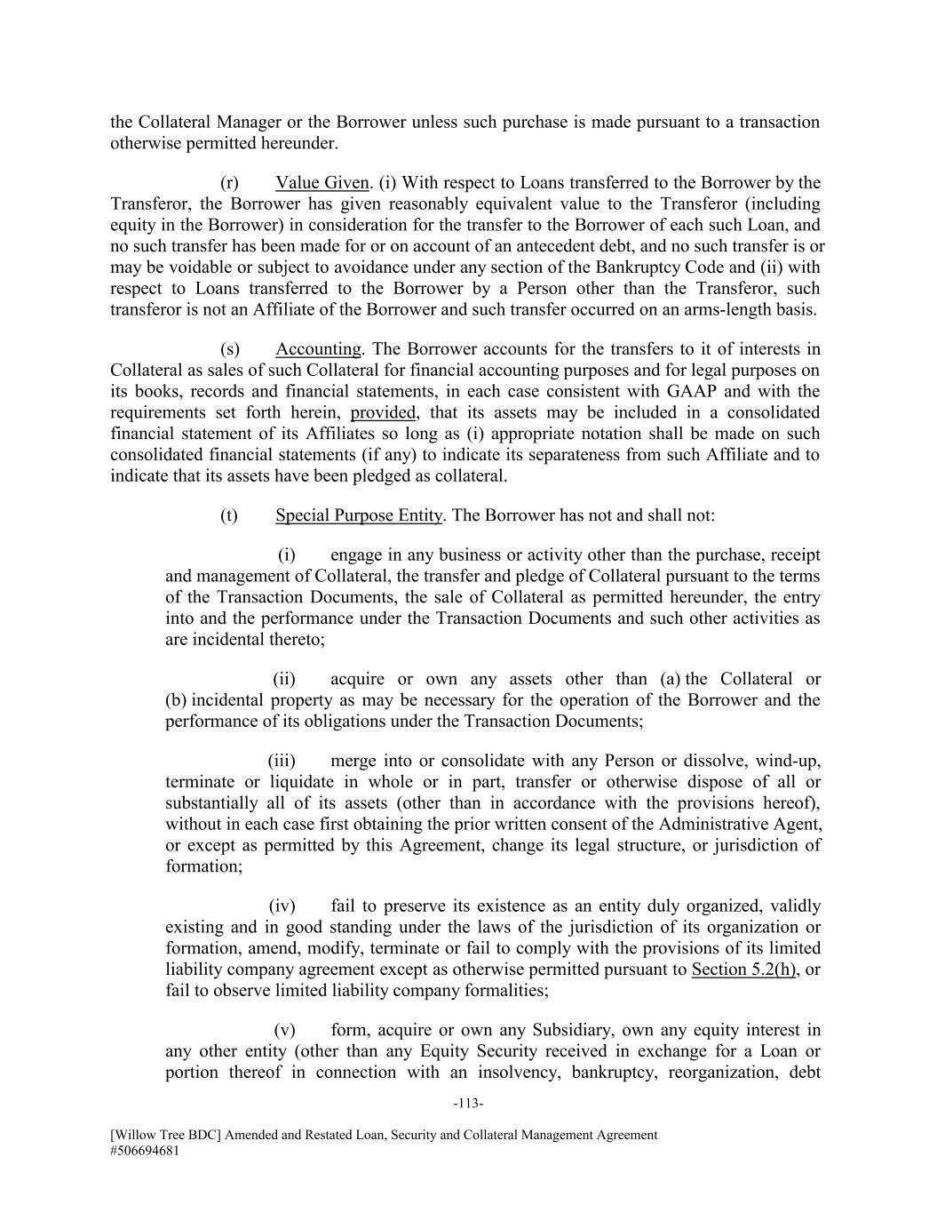 the Collateral Manager or the Borrower unless such purchase is made pursuant to a transaction otherwise permitted hereunder. (r) Value Given. (i) With respect to Loans transferred to the Borrower by the Transferor, the Borrower has given reasonably equivalent value to the Transferor (including equity in the Borrower) in consideration for the transfer to the Borrower of each such Loan, and no such transfer has been made for or on account of an antecedent debt, and no such transfer is or may be voidable or subject to avoidance under any section of the Bankruptcy Code and (ii) with respect to Loans transferred to the Borrower by a Person other than the Transferor, such transferor is not an Affiliate of the Borrower and such transfer occurred on an arms-length basis. (s) Accounting. The Borrower accounts for the transfers to it of interests in Collateral as sales of such Collateral for financial accounting purposes and for legal purposes on its books, records and financial statements, in each case consistent with GAAP and with the requirements set forth herein, provided, that its assets may be included in a consolidated financial statement of its Affiliates so long as (i) appropriate notation shall be made on such consolidated financial statements (if any) to indicate its separateness from such Affiliate and to indicate that its assets have been pledged as collateral. (t) Special Purpose Entity. The Borrower has not and shall not: (i) engage in any business or activity other than the purchase, receipt and management of Collateral, the transfer and pledge of Collateral pursuant to the terms of the Transaction Documents, the sale of Collateral as permitted hereunder, the entry into and the performance under the Transaction Documents and such other activities as are incidental thereto; (ii) acquire or own any assets other than (a) the Collateral or (b) incidental property as may be necessary for the operation of the Borrower and the performance of its obligations under the Transaction Documents; (iii) merge into or consolidate with any Person or dissolve, wind-up, terminate or liquidate in whole or in part, transfer or otherwise dispose of all or substantially all of its assets (other than in accordance with the provisions hereof), without in each case first obtaining the prior written consent of the Administrative Agent, or except as permitted by this Agreement, change its legal structure, or jurisdiction of formation; (iv) fail to preserve its existence as an entity duly organized, validly existing and in good standing under the laws of the jurisdiction of its organization or formation, amend, modify, terminate or fail to comply with the provisions of its limited liability company agreement except as otherwise permitted pursuant to Section 5.2(h), or fail to observe limited liability company formalities; (v) form, acquire or own any Subsidiary, own any equity interest in any other entity (other than any Equity Security received in exchange for a Loan or portion thereof in connection with an insolvency, bankruptcy, reorganization, debt -113- [Willow Tree BDC] Amended and Restated Loan, Security and Collateral Management Agreement #506694681