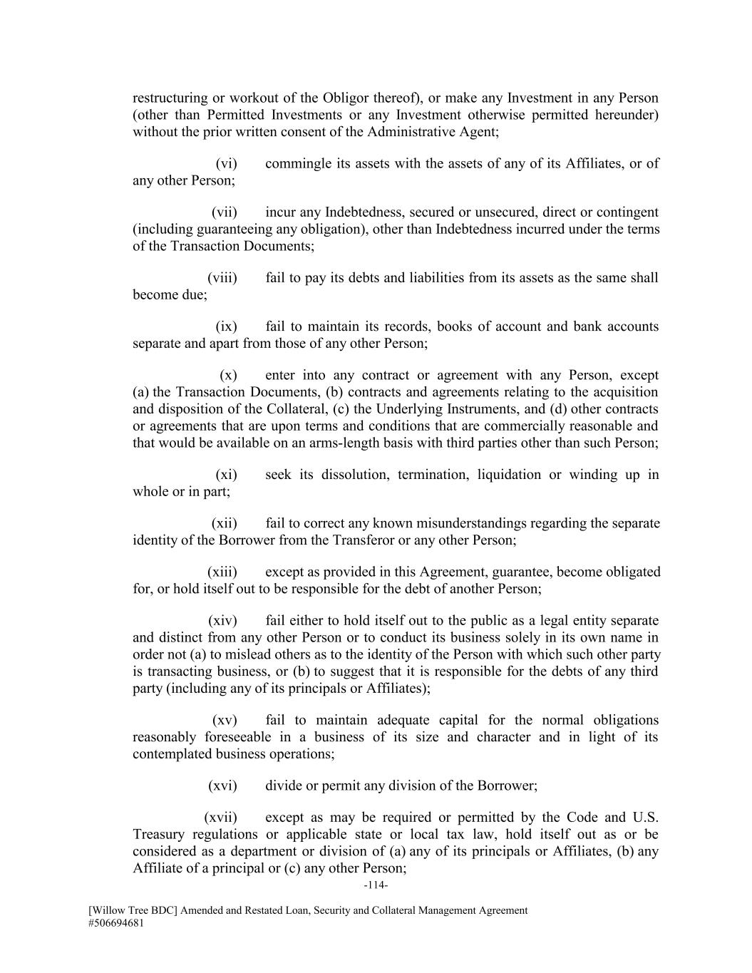 restructuring or workout of the Obligor thereof), or make any Investment in any Person (other than Permitted Investments or any Investment otherwise permitted hereunder) without the prior written consent of the Administrative Agent; (vi) commingle its assets with the assets of any of its Affiliates, or of any other Person; (vii) incur any Indebtedness, secured or unsecured, direct or contingent (including guaranteeing any obligation), other than Indebtedness incurred under the terms of the Transaction Documents; (viii) fail to pay its debts and liabilities from its assets as the same shall become due; (ix) fail to maintain its records, books of account and bank accounts separate and apart from those of any other Person; (x) enter into any contract or agreement with any Person, except (a) the Transaction Documents, (b) contracts and agreements relating to the acquisition and disposition of the Collateral, (c) the Underlying Instruments, and (d) other contracts or agreements that are upon terms and conditions that are commercially reasonable and that would be available on an arms-length basis with third parties other than such Person; (xi) seek its dissolution, termination, liquidation or winding up in whole or in part; (xii) fail to correct any known misunderstandings regarding the separate identity of the Borrower from the Transferor or any other Person; (xiii) except as provided in this Agreement, guarantee, become obligated for, or hold itself out to be responsible for the debt of another Person; (xiv) fail either to hold itself out to the public as a legal entity separate and distinct from any other Person or to conduct its business solely in its own name in order not (a) to mislead others as to the identity of the Person with which such other party is transacting business, or (b) to suggest that it is responsible for the debts of any third party (including any of its principals or Affiliates); (xv) fail to maintain adequate capital for the normal obligations reasonably foreseeable in a business of its size and character and in light of its contemplated business operations; (xvi) divide or permit any division of the Borrower; (xvii) except as may be required or permitted by the Code and U.S. Treasury regulations or applicable state or local tax law, hold itself out as or be considered as a department or division of (a) any of its principals or Affiliates, (b) any Affiliate of a principal or (c) any other Person; -114- [Willow Tree BDC] Amended and Restated Loan, Security and Collateral Management Agreement #506694681