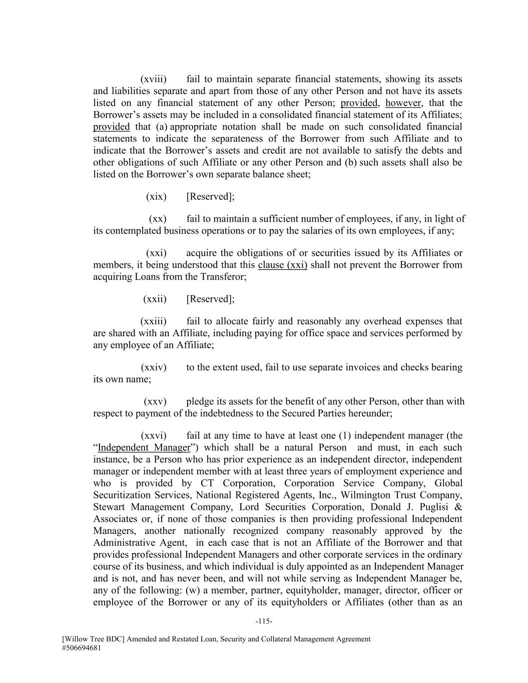 (xviii) fail to maintain separate financial statements, showing its assets and liabilities separate and apart from those of any other Person and not have its assets listed on any financial statement of any other Person; provided, however, that the Borrower’s assets may be included in a consolidated financial statement of its Affiliates; provided that (a) appropriate notation shall be made on such consolidated financial statements to indicate the separateness of the Borrower from such Affiliate and to indicate that the Borrower’s assets and credit are not available to satisfy the debts and other obligations of such Affiliate or any other Person and (b) such assets shall also be listed on the Borrower’s own separate balance sheet; (xix) [Reserved]; (xx) fail to maintain a sufficient number of employees, if any, in light of its contemplated business operations or to pay the salaries of its own employees, if any; (xxi) acquire the obligations of or securities issued by its Affiliates or members, it being understood that this clause (xxi) shall not prevent the Borrower from acquiring Loans from the Transferor; (xxii) [Reserved]; (xxiii) fail to allocate fairly and reasonably any overhead expenses that are shared with an Affiliate, including paying for office space and services performed by any employee of an Affiliate; (xxiv) to the extent used, fail to use separate invoices and checks bearing its own name; (xxv) pledge its assets for the benefit of any other Person, other than with respect to payment of the indebtedness to the Secured Parties hereunder; (xxvi) fail at any time to have at least one (1) independent manager (the “Independent Manager”) which shall be a natural Person and must, in each such instance, be a Person who has prior experience as an independent director, independent manager or independent member with at least three years of employment experience and who is provided by CT Corporation, Corporation Service Company, Global Securitization Services, National Registered Agents, Inc., Wilmington Trust Company, Stewart Management Company, Lord Securities Corporation, Donald J. Puglisi & Associates or, if none of those companies is then providing professional Independent Managers, another nationally recognized company reasonably approved by the Administrative Agent, in each case that is not an Affiliate of the Borrower and that provides professional Independent Managers and other corporate services in the ordinary course of its business, and which individual is duly appointed as an Independent Manager and is not, and has never been, and will not while serving as Independent Manager be, any of the following: (w) a member, partner, equityholder, manager, director, officer or employee of the Borrower or any of its equityholders or Affiliates (other than as an -115- [Willow Tree BDC] Amended and Restated Loan, Security and Collateral Management Agreement #506694681