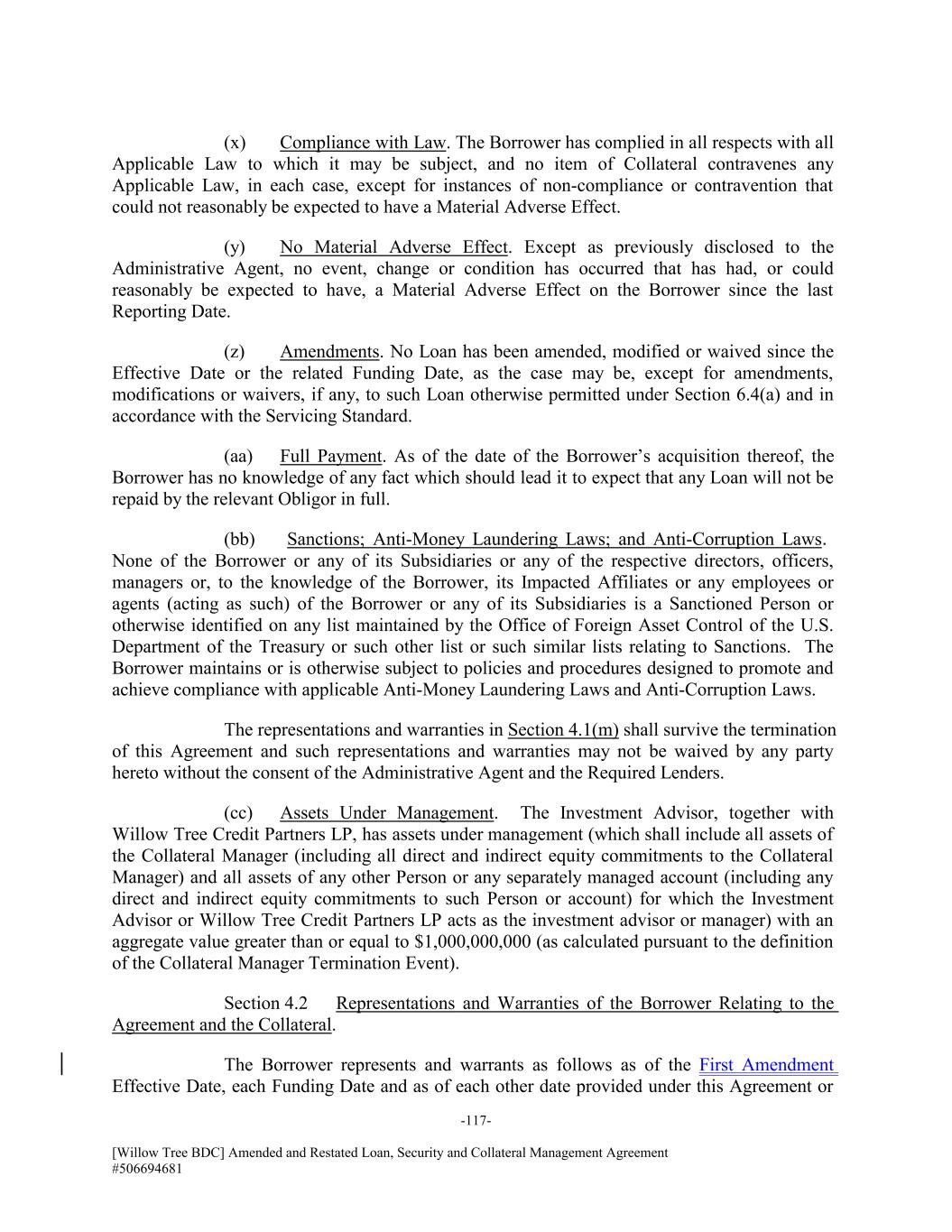 (x) Compliance with Law. The Borrower has complied in all respects with all Applicable Law to which it may be subject, and no item of Collateral contravenes any Applicable Law, in each case, except for instances of non-compliance or contravention that could not reasonably be expected to have a Material Adverse Effect. (y) No Material Adverse Effect. Except as previously disclosed to the Administrative Agent, no event, change or condition has occurred that has had, or could reasonably be expected to have, a Material Adverse Effect on the Borrower since the last Reporting Date. (z) Amendments. No Loan has been amended, modified or waived since the Effective Date or the related Funding Date, as the case may be, except for amendments, modifications or waivers, if any, to such Loan otherwise permitted under Section 6.4(a) and in accordance with the Servicing Standard. (aa) Full Payment. As of the date of the Borrower’s acquisition thereof, the Borrower has no knowledge of any fact which should lead it to expect that any Loan will not be repaid by the relevant Obligor in full. (bb) Sanctions; Anti-Money Laundering Laws; and Anti-Corruption Laws. None of the Borrower or any of its Subsidiaries or any of the respective directors, officers, managers or, to the knowledge of the Borrower, its Impacted Affiliates or any employees or agents (acting as such) of the Borrower or any of its Subsidiaries is a Sanctioned Person or otherwise identified on any list maintained by the Office of Foreign Asset Control of the U.S. Department of the Treasury or such other list or such similar lists relating to Sanctions. The Borrower maintains or is otherwise subject to policies and procedures designed to promote and achieve compliance with applicable Anti-Money Laundering Laws and Anti-Corruption Laws. The representations and warranties in Section 4.1(m) shall survive the termination of this Agreement and such representations and warranties may not be waived by any party hereto without the consent of the Administrative Agent and the Required Lenders. (cc) Assets Under Management. The Investment Advisor, together with Willow Tree Credit Partners LP, has assets under management (which shall include all assets of the Collateral Manager (including all direct and indirect equity commitments to the Collateral Manager) and all assets of any other Person or any separately managed account (including any direct and indirect equity commitments to such Person or account) for which the Investment Advisor or Willow Tree Credit Partners LP acts as the investment advisor or manager) with an aggregate value greater than or equal to $1,000,000,000 (as calculated pursuant to the definition of the Collateral Manager Termination Event). Section 4.2 Representations and Warranties of the Borrower Relating to the Agreement and the Collateral. The Borrower represents and warrants as follows as of the First Amendment Effective Date, each Funding Date and as of each other date provided under this Agreement or -117- [Willow Tree BDC] Amended and Restated Loan, Security and Collateral Management Agreement #506694681