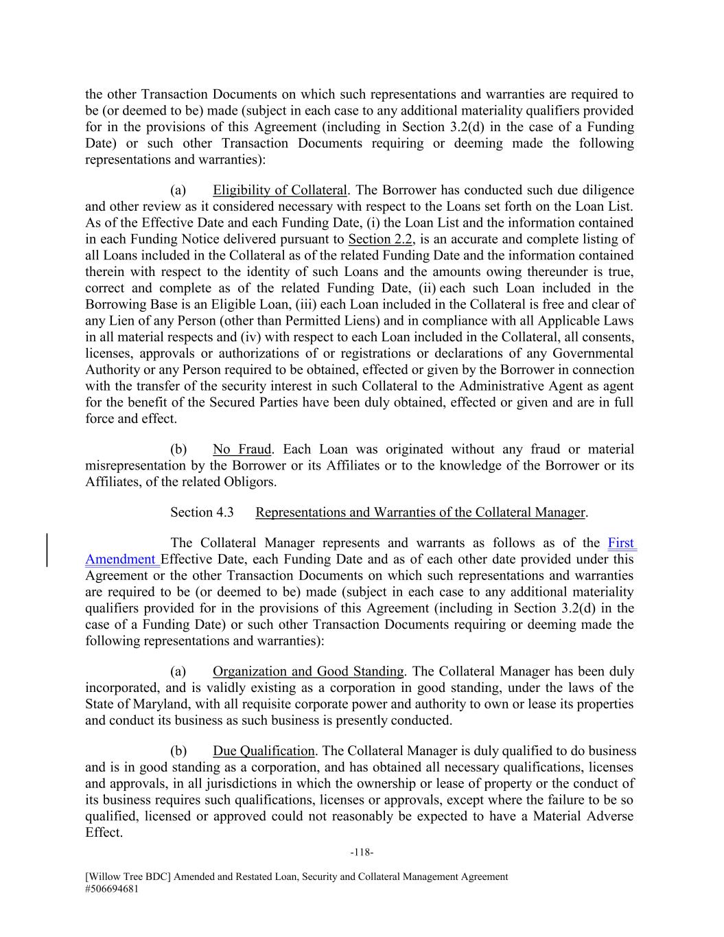 the other Transaction Documents on which such representations and warranties are required to be (or deemed to be) made (subject in each case to any additional materiality qualifiers provided for in the provisions of this Agreement (including in Section 3.2(d) in the case of a Funding Date) or such other Transaction Documents requiring or deeming made the following representations and warranties): (a) Eligibility of Collateral. The Borrower has conducted such due diligence and other review as it considered necessary with respect to the Loans set forth on the Loan List. As of the Effective Date and each Funding Date, (i) the Loan List and the information contained in each Funding Notice delivered pursuant to Section 2.2, is an accurate and complete listing of all Loans included in the Collateral as of the related Funding Date and the information contained therein with respect to the identity of such Loans and the amounts owing thereunder is true, correct and complete as of the related Funding Date, (ii) each such Loan included in the Borrowing Base is an Eligible Loan, (iii) each Loan included in the Collateral is free and clear of any Lien of any Person (other than Permitted Liens) and in compliance with all Applicable Laws in all material respects and (iv) with respect to each Loan included in the Collateral, all consents, licenses, approvals or authorizations of or registrations or declarations of any Governmental Authority or any Person required to be obtained, effected or given by the Borrower in connection with the transfer of the security interest in such Collateral to the Administrative Agent as agent for the benefit of the Secured Parties have been duly obtained, effected or given and are in full force and effect. (b) No Fraud. Each Loan was originated without any fraud or material misrepresentation by the Borrower or its Affiliates or to the knowledge of the Borrower or its Affiliates, of the related Obligors. Section 4.3 Representations and Warranties of the Collateral Manager. The Collateral Manager represents and warrants as follows as of the First Amendment Effective Date, each Funding Date and as of each other date provided under this Agreement or the other Transaction Documents on which such representations and warranties are required to be (or deemed to be) made (subject in each case to any additional materiality qualifiers provided for in the provisions of this Agreement (including in Section 3.2(d) in the case of a Funding Date) or such other Transaction Documents requiring or deeming made the following representations and warranties): (a) Organization and Good Standing. The Collateral Manager has been duly incorporated, and is validly existing as a corporation in good standing, under the laws of the State of Maryland, with all requisite corporate power and authority to own or lease its properties and conduct its business as such business is presently conducted. (b) Due Qualification. The Collateral Manager is duly qualified to do business and is in good standing as a corporation, and has obtained all necessary qualifications, licenses and approvals, in all jurisdictions in which the ownership or lease of property or the conduct of its business requires such qualifications, licenses or approvals, except where the failure to be so qualified, licensed or approved could not reasonably be expected to have a Material Adverse Effect. -118- [Willow Tree BDC] Amended and Restated Loan, Security and Collateral Management Agreement #506694681