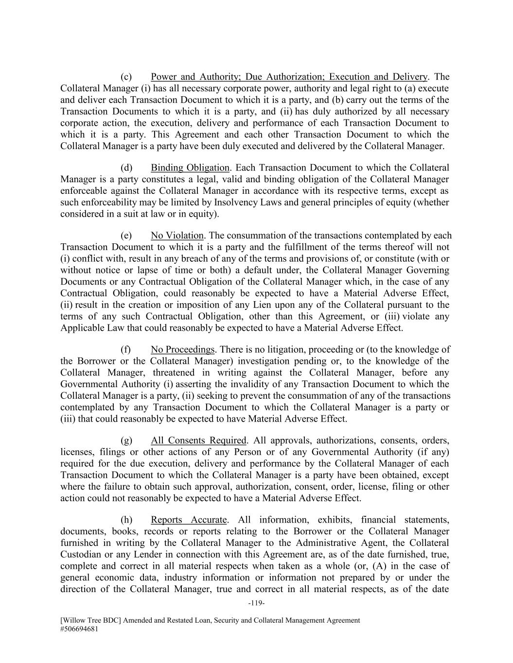 (c) Power and Authority; Due Authorization; Execution and Delivery. The Collateral Manager (i) has all necessary corporate power, authority and legal right to (a) execute and deliver each Transaction Document to which it is a party, and (b) carry out the terms of the Transaction Documents to which it is a party, and (ii) has duly authorized by all necessary corporate action, the execution, delivery and performance of each Transaction Document to which it is a party. This Agreement and each other Transaction Document to which the Collateral Manager is a party have been duly executed and delivered by the Collateral Manager. (d) Binding Obligation. Each Transaction Document to which the Collateral Manager is a party constitutes a legal, valid and binding obligation of the Collateral Manager enforceable against the Collateral Manager in accordance with its respective terms, except as such enforceability may be limited by Insolvency Laws and general principles of equity (whether considered in a suit at law or in equity). (e) No Violation. The consummation of the transactions contemplated by each Transaction Document to which it is a party and the fulfillment of the terms thereof will not (i) conflict with, result in any breach of any of the terms and provisions of, or constitute (with or without notice or lapse of time or both) a default under, the Collateral Manager Governing Documents or any Contractual Obligation of the Collateral Manager which, in the case of any Contractual Obligation, could reasonably be expected to have a Material Adverse Effect, (ii) result in the creation or imposition of any Lien upon any of the Collateral pursuant to the terms of any such Contractual Obligation, other than this Agreement, or (iii) violate any Applicable Law that could reasonably be expected to have a Material Adverse Effect. (f) No Proceedings. There is no litigation, proceeding or (to the knowledge of the Borrower or the Collateral Manager) investigation pending or, to the knowledge of the Collateral Manager, threatened in writing against the Collateral Manager, before any Governmental Authority (i) asserting the invalidity of any Transaction Document to which the Collateral Manager is a party, (ii) seeking to prevent the consummation of any of the transactions contemplated by any Transaction Document to which the Collateral Manager is a party or (iii) that could reasonably be expected to have Material Adverse Effect. (g) All Consents Required. All approvals, authorizations, consents, orders, licenses, filings or other actions of any Person or of any Governmental Authority (if any) required for the due execution, delivery and performance by the Collateral Manager of each Transaction Document to which the Collateral Manager is a party have been obtained, except where the failure to obtain such approval, authorization, consent, order, license, filing or other action could not reasonably be expected to have a Material Adverse Effect. (h) Reports Accurate. All information, exhibits, financial statements, documents, books, records or reports relating to the Borrower or the Collateral Manager furnished in writing by the Collateral Manager to the Administrative Agent, the Collateral Custodian or any Lender in connection with this Agreement are, as of the date furnished, true, complete and correct in all material respects when taken as a whole (or, (A) in the case of general economic data, industry information or information not prepared by or under the direction of the Collateral Manager, true and correct in all material respects, as of the date -119- [Willow Tree BDC] Amended and Restated Loan, Security and Collateral Management Agreement #506694681
