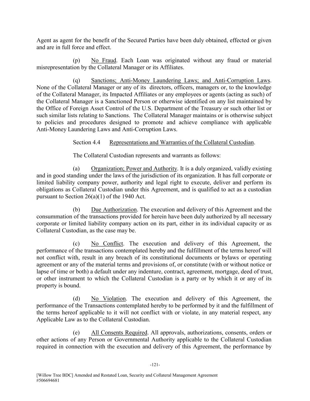 Agent as agent for the benefit of the Secured Parties have been duly obtained, effected or given and are in full force and effect. (p) No Fraud. Each Loan was originated without any fraud or material misrepresentation by the Collateral Manager or its Affiliates. (q) Sanctions; Anti-Money Laundering Laws; and Anti-Corruption Laws. None of the Collateral Manager or any of its directors, officers, managers or, to the knowledge of the Collateral Manager, its Impacted Affiliates or any employees or agents (acting as such) of the Collateral Manager is a Sanctioned Person or otherwise identified on any list maintained by the Office of Foreign Asset Control of the U.S. Department of the Treasury or such other list or such similar lists relating to Sanctions. The Collateral Manager maintains or is otherwise subject to policies and procedures designed to promote and achieve compliance with applicable Anti-Money Laundering Laws and Anti-Corruption Laws. Section 4.4 Representations and Warranties of the Collateral Custodian. The Collateral Custodian represents and warrants as follows: (a) Organization; Power and Authority. It is a duly organized, validly existing and in good standing under the laws of the jurisdiction of its organization. It has full corporate or limited liability company power, authority and legal right to execute, deliver and perform its obligations as Collateral Custodian under this Agreement, and is qualified to act as a custodian pursuant to Section 26(a)(1) of the 1940 Act. (b) Due Authorization. The execution and delivery of this Agreement and the consummation of the transactions provided for herein have been duly authorized by all necessary corporate or limited liability company action on its part, either in its individual capacity or as Collateral Custodian, as the case may be. (c) No Conflict. The execution and delivery of this Agreement, the performance of the transactions contemplated hereby and the fulfillment of the terms hereof will not conflict with, result in any breach of its constitutional documents or bylaws or operating agreement or any of the material terms and provisions of, or constitute (with or without notice or lapse of time or both) a default under any indenture, contract, agreement, mortgage, deed of trust, or other instrument to which the Collateral Custodian is a party or by which it or any of its property is bound. (d) No Violation. The execution and delivery of this Agreement, the performance of the Transactions contemplated hereby to be performed by it and the fulfillment of the terms hereof applicable to it will not conflict with or violate, in any material respect, any Applicable Law as to the Collateral Custodian. (e) All Consents Required. All approvals, authorizations, consents, orders or other actions of any Person or Governmental Authority applicable to the Collateral Custodian required in connection with the execution and delivery of this Agreement, the performance by -121- [Willow Tree BDC] Amended and Restated Loan, Security and Collateral Management Agreement #506694681