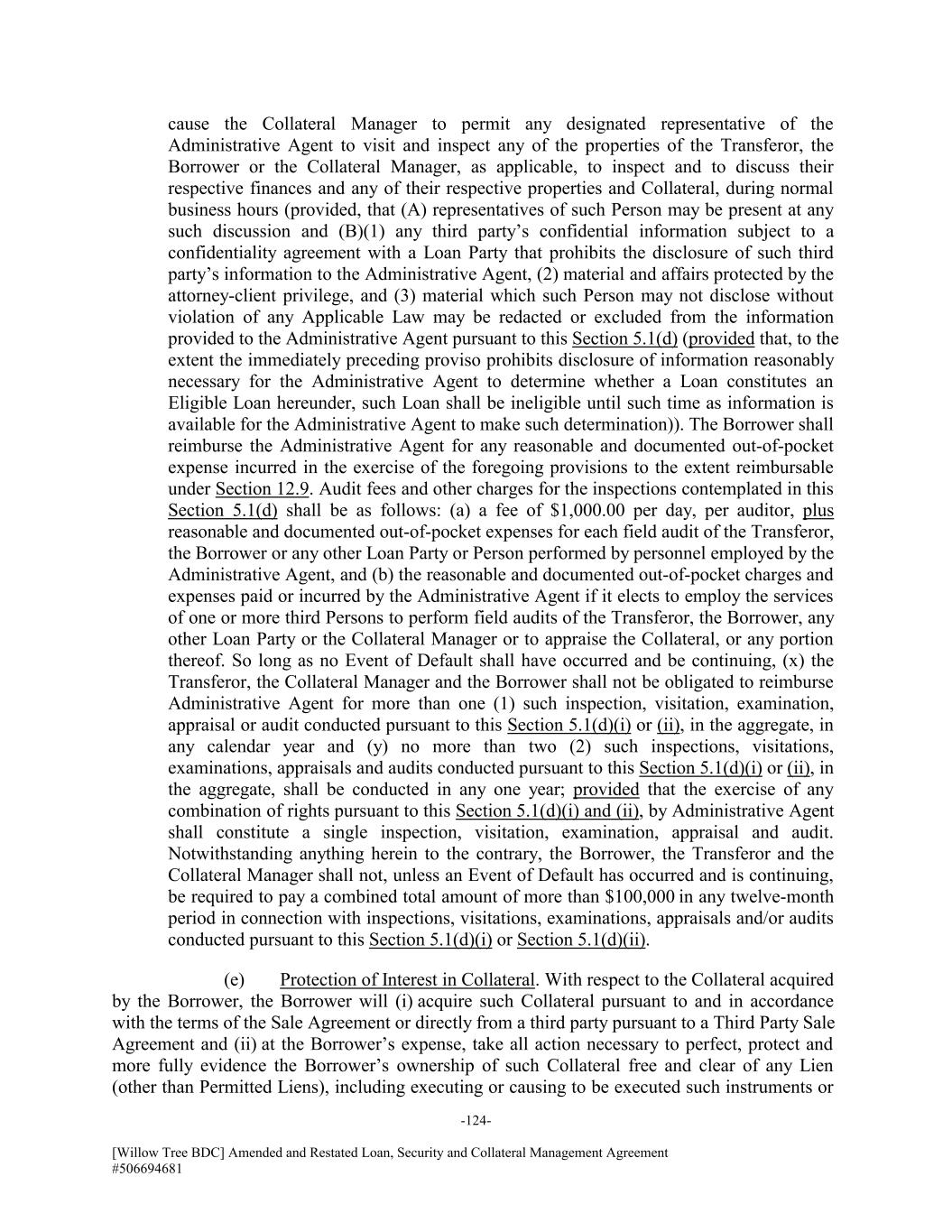 cause the Collateral Manager to permit any designated representative of the Administrative Agent to visit and inspect any of the properties of the Transferor, the Borrower or the Collateral Manager, as applicable, to inspect and to discuss their respective finances and any of their respective properties and Collateral, during normal business hours (provided, that (A) representatives of such Person may be present at any such discussion and (B)(1) any third party’s confidential information subject to a confidentiality agreement with a Loan Party that prohibits the disclosure of such third party’s information to the Administrative Agent, (2) material and affairs protected by the attorney-client privilege, and (3) material which such Person may not disclose without violation of any Applicable Law may be redacted or excluded from the information provided to the Administrative Agent pursuant to this Section 5.1(d) (provided that, to the extent the immediately preceding proviso prohibits disclosure of information reasonably necessary for the Administrative Agent to determine whether a Loan constitutes an Eligible Loan hereunder, such Loan shall be ineligible until such time as information is available for the Administrative Agent to make such determination)). The Borrower shall reimburse the Administrative Agent for any reasonable and documented out-of-pocket expense incurred in the exercise of the foregoing provisions to the extent reimbursable under Section 12.9. Audit fees and other charges for the inspections contemplated in this Section 5.1(d) shall be as follows: (a) a fee of $1,000.00 per day, per auditor, plus reasonable and documented out-of-pocket expenses for each field audit of the Transferor, the Borrower or any other Loan Party or Person performed by personnel employed by the Administrative Agent, and (b) the reasonable and documented out-of-pocket charges and expenses paid or incurred by the Administrative Agent if it elects to employ the services of one or more third Persons to perform field audits of the Transferor, the Borrower, any other Loan Party or the Collateral Manager or to appraise the Collateral, or any portion thereof. So long as no Event of Default shall have occurred and be continuing, (x) the Transferor, the Collateral Manager and the Borrower shall not be obligated to reimburse Administrative Agent for more than one (1) such inspection, visitation, examination, appraisal or audit conducted pursuant to this Section 5.1(d)(i) or (ii), in the aggregate, in any calendar year and (y) no more than two (2) such inspections, visitations, examinations, appraisals and audits conducted pursuant to this Section 5.1(d)(i) or (ii), in the aggregate, shall be conducted in any one year; provided that the exercise of any combination of rights pursuant to this Section 5.1(d)(i) and (ii), by Administrative Agent shall constitute a single inspection, visitation, examination, appraisal and audit. Notwithstanding anything herein to the contrary, the Borrower, the Transferor and the Collateral Manager shall not, unless an Event of Default has occurred and is continuing, be required to pay a combined total amount of more than $100,000 in any twelve-month period in connection with inspections, visitations, examinations, appraisals and/or audits conducted pursuant to this Section 5.1(d)(i) or Section 5.1(d)(ii). (e) Protection of Interest in Collateral. With respect to the Collateral acquired by the Borrower, the Borrower will (i) acquire such Collateral pursuant to and in accordance with the terms of the Sale Agreement or directly from a third party pursuant to a Third Party Sale Agreement and (ii) at the Borrower’s expense, take all action necessary to perfect, protect and more fully evidence the Borrower’s ownership of such Collateral free and clear of any Lien (other than Permitted Liens), including executing or causing to be executed such instruments or -124- [Willow Tree BDC] Amended and Restated Loan, Security and Collateral Management Agreement #506694681