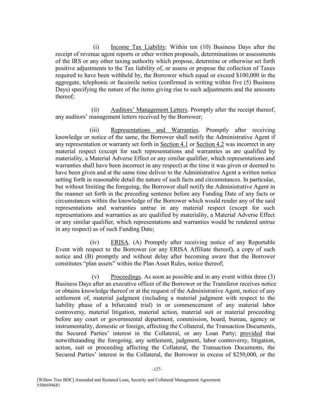 (i) Income Tax Liability. Within ten (10) Business Days after the receipt of revenue agent reports or other written proposals, determinations or assessments of the IRS or any other taxing authority which propose, determine or otherwise set forth positive adjustments to the Tax liability of, or assess or propose the collection of Taxes required to have been withheld by, the Borrower which equal or exceed $100,000 in the aggregate, telephonic or facsimile notice (confirmed in writing within five (5) Business Days) specifying the nature of the items giving rise to such adjustments and the amounts thereof; (ii) Auditors’ Management Letters. Promptly after the receipt thereof, any auditors’ management letters received by the Borrower; (iii) Representations and Warranties. Promptly after receiving knowledge or notice of the same, the Borrower shall notify the Administrative Agent if any representation or warranty set forth in Section 4.1 or Section 4.2 was incorrect in any material respect (except for such representations and warranties as are qualified by materiality, a Material Adverse Effect or any similar qualifier, which representations and warranties shall have been incorrect in any respect) at the time it was given or deemed to have been given and at the same time deliver to the Administrative Agent a written notice setting forth in reasonable detail the nature of such facts and circumstances. In particular, but without limiting the foregoing, the Borrower shall notify the Administrative Agent in the manner set forth in the preceding sentence before any Funding Date of any facts or circumstances within the knowledge of the Borrower which would render any of the said representations and warranties untrue in any material respect (except for such representations and warranties as are qualified by materiality, a Material Adverse Effect or any similar qualifier, which representations and warranties would be rendered untrue in any respect) as of such Funding Date; (iv) ERISA. (A) Promptly after receiving notice of any Reportable Event with respect to the Borrower (or any ERISA Affiliate thereof), a copy of such notice and (B) promptly and without delay after becoming aware that the Borrower constitutes “plan assets” within the Plan Asset Rules, notice thereof; (v) Proceedings. As soon as possible and in any event within three (3) Business Days after an executive officer of the Borrower or the Transferor receives notice or obtains knowledge thereof or at the request of the Administrative Agent, notice of any settlement of, material judgment (including a material judgment with respect to the liability phase of a bifurcated trial) in or commencement of any material labor controversy, material litigation, material action, material suit or material proceeding before any court or governmental department, commission, board, bureau, agency or instrumentality, domestic or foreign, affecting the Collateral, the Transaction Documents, the Secured Parties’ interest in the Collateral, or any Loan Party; provided that notwithstanding the foregoing, any settlement, judgment, labor controversy, litigation, action, suit or proceeding affecting the Collateral, the Transaction Documents, the Secured Parties’ interest in the Collateral, the Borrower in excess of $250,000, or the -127- [Willow Tree BDC] Amended and Restated Loan, Security and Collateral Management Agreement #506694681