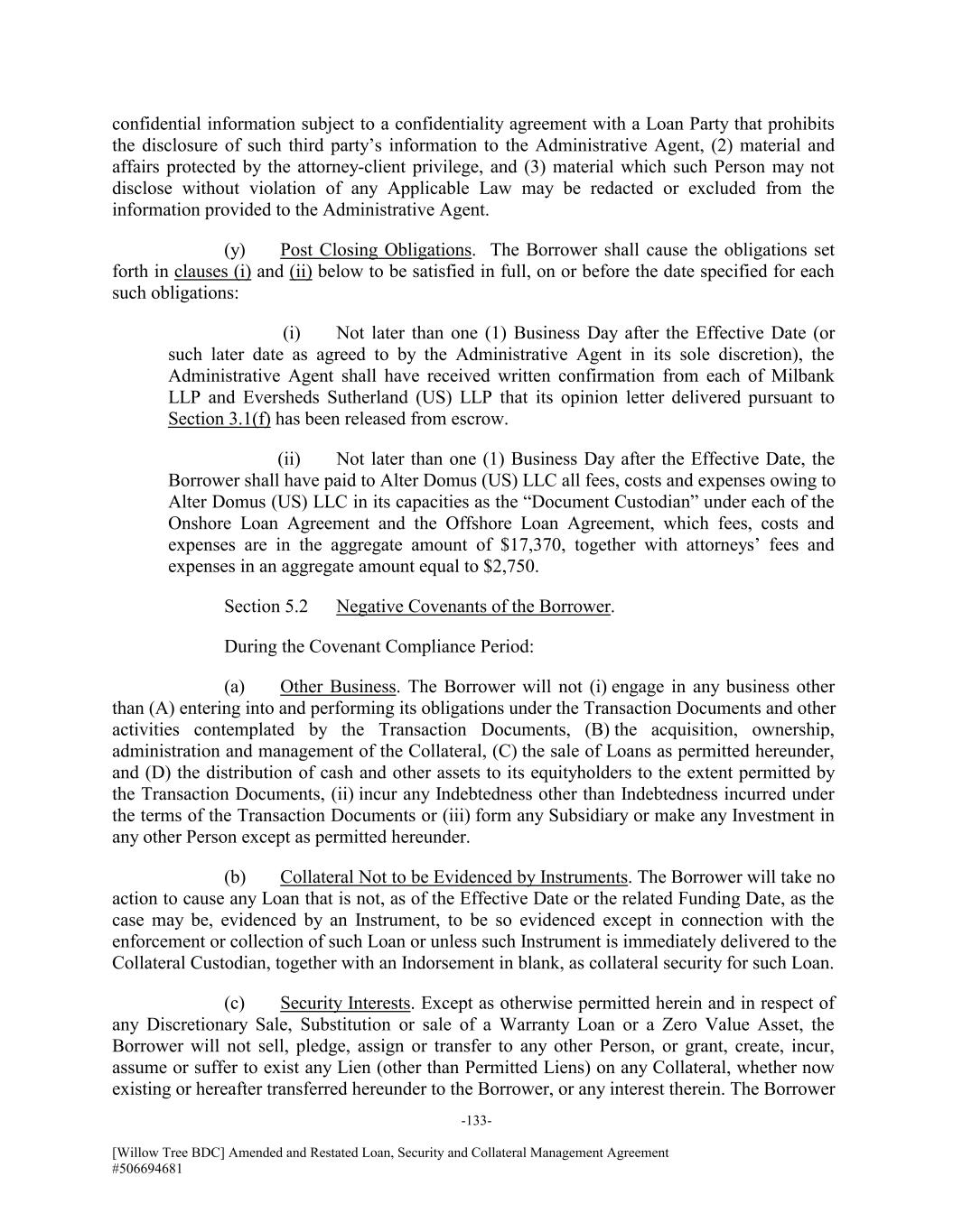 confidential information subject to a confidentiality agreement with a Loan Party that prohibits the disclosure of such third party’s information to the Administrative Agent, (2) material and affairs protected by the attorney-client privilege, and (3) material which such Person may not disclose without violation of any Applicable Law may be redacted or excluded from the information provided to the Administrative Agent. (y) Post Closing Obligations. The Borrower shall cause the obligations set forth in clauses (i) and (ii) below to be satisfied in full, on or before the date specified for each such obligations: (i) Not later than one (1) Business Day after the Effective Date (or such later date as agreed to by the Administrative Agent in its sole discretion), the Administrative Agent shall have received written confirmation from each of Milbank LLP and Eversheds Sutherland (US) LLP that its opinion letter delivered pursuant to Section 3.1(f) has been released from escrow. (ii) Not later than one (1) Business Day after the Effective Date, the Borrower shall have paid to Alter Domus (US) LLC all fees, costs and expenses owing to Alter Domus (US) LLC in its capacities as the “Document Custodian” under each of the Onshore Loan Agreement and the Offshore Loan Agreement, which fees, costs and expenses are in the aggregate amount of $17,370, together with attorneys’ fees and expenses in an aggregate amount equal to $2,750. Section 5.2 Negative Covenants of the Borrower. During the Covenant Compliance Period: (a) Other Business. The Borrower will not (i) engage in any business other than (A) entering into and performing its obligations under the Transaction Documents and other activities contemplated by the Transaction Documents, (B) the acquisition, ownership, administration and management of the Collateral, (C) the sale of Loans as permitted hereunder, and (D) the distribution of cash and other assets to its equityholders to the extent permitted by the Transaction Documents, (ii) incur any Indebtedness other than Indebtedness incurred under the terms of the Transaction Documents or (iii) form any Subsidiary or make any Investment in any other Person except as permitted hereunder. (b) Collateral Not to be Evidenced by Instruments. The Borrower will take no action to cause any Loan that is not, as of the Effective Date or the related Funding Date, as the case may be, evidenced by an Instrument, to be so evidenced except in connection with the enforcement or collection of such Loan or unless such Instrument is immediately delivered to the Collateral Custodian, together with an Indorsement in blank, as collateral security for such Loan. (c) Security Interests. Except as otherwise permitted herein and in respect of any Discretionary Sale, Substitution or sale of a Warranty Loan or a Zero Value Asset, the Borrower will not sell, pledge, assign or transfer to any other Person, or grant, create, incur, assume or suffer to exist any Lien (other than Permitted Liens) on any Collateral, whether now existing or hereafter transferred hereunder to the Borrower, or any interest therein. The Borrower -133- [Willow Tree BDC] Amended and Restated Loan, Security and Collateral Management Agreement #506694681