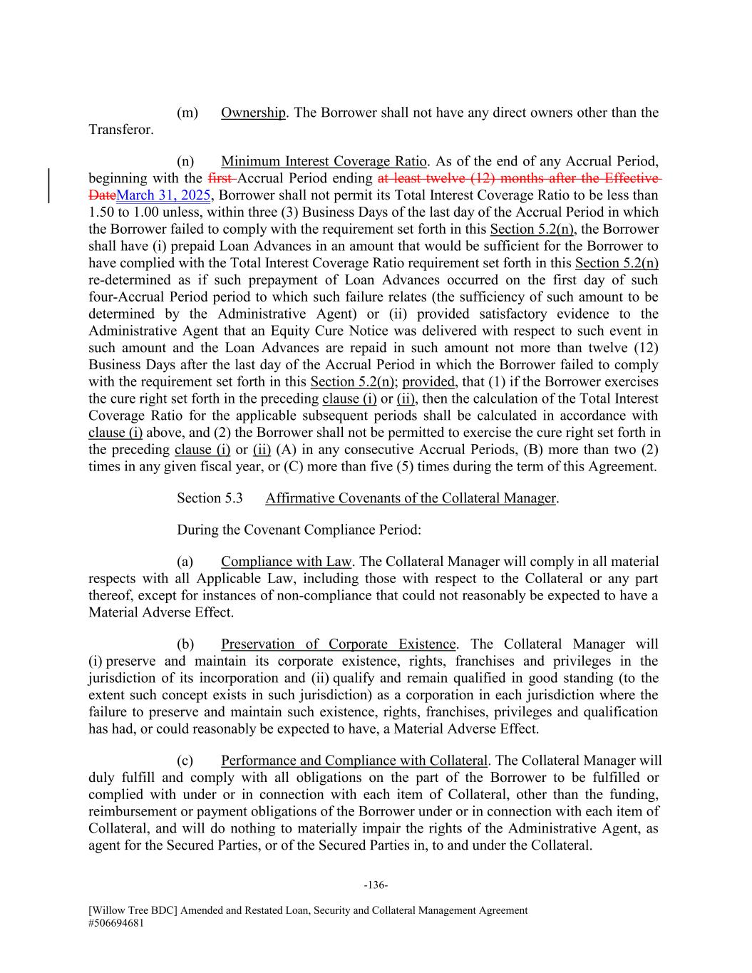 (m) Ownership. The Borrower shall not have any direct owners other than the Transferor. (n) Minimum Interest Coverage Ratio. As of the end of any Accrual Period, beginning with the first Accrual Period ending at least twelve (12) months after the Effective DateMarch 31, 2025, Borrower shall not permit its Total Interest Coverage Ratio to be less than 1.50 to 1.00 unless, within three (3) Business Days of the last day of the Accrual Period in which the Borrower failed to comply with the requirement set forth in this Section 5.2(n), the Borrower shall have (i) prepaid Loan Advances in an amount that would be sufficient for the Borrower to have complied with the Total Interest Coverage Ratio requirement set forth in this Section 5.2(n) re-determined as if such prepayment of Loan Advances occurred on the first day of such four-Accrual Period period to which such failure relates (the sufficiency of such amount to be determined by the Administrative Agent) or (ii) provided satisfactory evidence to the Administrative Agent that an Equity Cure Notice was delivered with respect to such event in such amount and the Loan Advances are repaid in such amount not more than twelve (12) Business Days after the last day of the Accrual Period in which the Borrower failed to comply with the requirement set forth in this Section 5.2(n); provided, that (1) if the Borrower exercises the cure right set forth in the preceding clause (i) or (ii), then the calculation of the Total Interest Coverage Ratio for the applicable subsequent periods shall be calculated in accordance with clause (i) above, and (2) the Borrower shall not be permitted to exercise the cure right set forth in the preceding clause (i) or (ii) (A) in any consecutive Accrual Periods, (B) more than two (2) times in any given fiscal year, or (C) more than five (5) times during the term of this Agreement. Section 5.3 Affirmative Covenants of the Collateral Manager. During the Covenant Compliance Period: (a) Compliance with Law. The Collateral Manager will comply in all material respects with all Applicable Law, including those with respect to the Collateral or any part thereof, except for instances of non-compliance that could not reasonably be expected to have a Material Adverse Effect. (b) Preservation of Corporate Existence. The Collateral Manager will (i) preserve and maintain its corporate existence, rights, franchises and privileges in the jurisdiction of its incorporation and (ii) qualify and remain qualified in good standing (to the extent such concept exists in such jurisdiction) as a corporation in each jurisdiction where the failure to preserve and maintain such existence, rights, franchises, privileges and qualification has had, or could reasonably be expected to have, a Material Adverse Effect. (c) Performance and Compliance with Collateral. The Collateral Manager will duly fulfill and comply with all obligations on the part of the Borrower to be fulfilled or complied with under or in connection with each item of Collateral, other than the funding, reimbursement or payment obligations of the Borrower under or in connection with each item of Collateral, and will do nothing to materially impair the rights of the Administrative Agent, as agent for the Secured Parties, or of the Secured Parties in, to and under the Collateral. -136- [Willow Tree BDC] Amended and Restated Loan, Security and Collateral Management Agreement #506694681