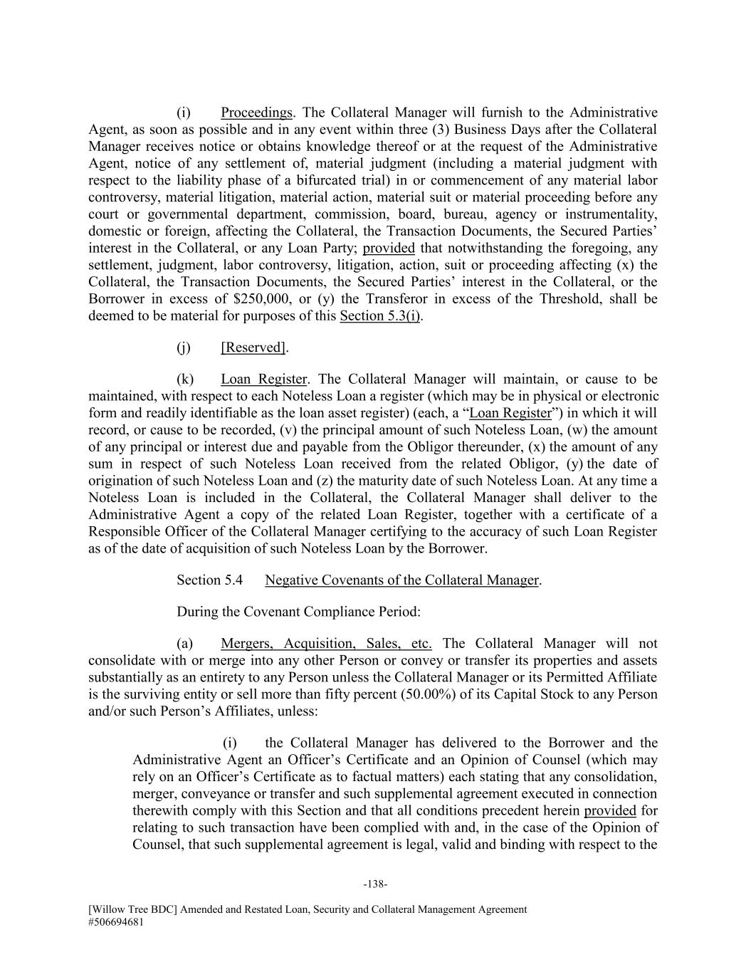 (i) Proceedings. The Collateral Manager will furnish to the Administrative Agent, as soon as possible and in any event within three (3) Business Days after the Collateral Manager receives notice or obtains knowledge thereof or at the request of the Administrative Agent, notice of any settlement of, material judgment (including a material judgment with respect to the liability phase of a bifurcated trial) in or commencement of any material labor controversy, material litigation, material action, material suit or material proceeding before any court or governmental department, commission, board, bureau, agency or instrumentality, domestic or foreign, affecting the Collateral, the Transaction Documents, the Secured Parties’ interest in the Collateral, or any Loan Party; provided that notwithstanding the foregoing, any settlement, judgment, labor controversy, litigation, action, suit or proceeding affecting (x) the Collateral, the Transaction Documents, the Secured Parties’ interest in the Collateral, or the Borrower in excess of $250,000, or (y) the Transferor in excess of the Threshold, shall be deemed to be material for purposes of this Section 5.3(i). (j) [Reserved]. (k) Loan Register. The Collateral Manager will maintain, or cause to be maintained, with respect to each Noteless Loan a register (which may be in physical or electronic form and readily identifiable as the loan asset register) (each, a “Loan Register”) in which it will record, or cause to be recorded, (v) the principal amount of such Noteless Loan, (w) the amount of any principal or interest due and payable from the Obligor thereunder, (x) the amount of any sum in respect of such Noteless Loan received from the related Obligor, (y) the date of origination of such Noteless Loan and (z) the maturity date of such Noteless Loan. At any time a Noteless Loan is included in the Collateral, the Collateral Manager shall deliver to the Administrative Agent a copy of the related Loan Register, together with a certificate of a Responsible Officer of the Collateral Manager certifying to the accuracy of such Loan Register as of the date of acquisition of such Noteless Loan by the Borrower. Section 5.4 Negative Covenants of the Collateral Manager. During the Covenant Compliance Period: (a) Mergers, Acquisition, Sales, etc. The Collateral Manager will not consolidate with or merge into any other Person or convey or transfer its properties and assets substantially as an entirety to any Person unless the Collateral Manager or its Permitted Affiliate is the surviving entity or sell more than fifty percent (50.00%) of its Capital Stock to any Person and/or such Person’s Affiliates, unless: (i) the Collateral Manager has delivered to the Borrower and the Administrative Agent an Officer’s Certificate and an Opinion of Counsel (which may rely on an Officer’s Certificate as to factual matters) each stating that any consolidation, merger, conveyance or transfer and such supplemental agreement executed in connection therewith comply with this Section and that all conditions precedent herein provided for relating to such transaction have been complied with and, in the case of the Opinion of Counsel, that such supplemental agreement is legal, valid and binding with respect to the -138- [Willow Tree BDC] Amended and Restated Loan, Security and Collateral Management Agreement #506694681