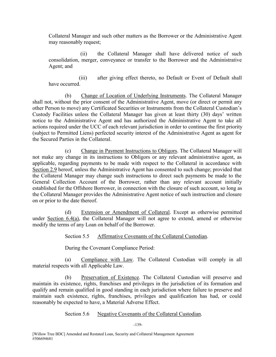 Collateral Manager and such other matters as the Borrower or the Administrative Agent may reasonably request; (ii) the Collateral Manager shall have delivered notice of such consolidation, merger, conveyance or transfer to the Borrower and the Administrative Agent; and (iii) after giving effect thereto, no Default or Event of Default shall have occurred. (b) Change of Location of Underlying Instruments. The Collateral Manager shall not, without the prior consent of the Administrative Agent, move (or direct or permit any other Person to move) any Certificated Securities or Instruments from the Collateral Custodian’s Custody Facilities unless the Collateral Manager has given at least thirty (30) days’ written notice to the Administrative Agent and has authorized the Administrative Agent to take all actions required under the UCC of each relevant jurisdiction in order to continue the first priority (subject to Permitted Liens) perfected security interest of the Administrative Agent as agent for the Secured Parties in the Collateral. (c) Change in Payment Instructions to Obligors. The Collateral Manager will not make any change in its instructions to Obligors or any relevant administrative agent, as applicable, regarding payments to be made with respect to the Collateral in accordance with Section 2.9 hereof, unless the Administrative Agent has consented to such change; provided that the Collateral Manager may change such instructions to direct such payments be made to the General Collection Account of the Borrower, rather than any relevant account initially established for the Offshore Borrower, in connection with the closure of such account, so long as the Collateral Manager provides the Administrative Agent notice of such instruction and closure on or prior to the date thereof. (d) Extension or Amendment of Collateral. Except as otherwise permitted under Section 6.4(a), the Collateral Manager will not agree to extend, amend or otherwise modify the terms of any Loan on behalf of the Borrower. Section 5.5 Affirmative Covenants of the Collateral Custodian. During the Covenant Compliance Period: (a) Compliance with Law. The Collateral Custodian will comply in all material respects with all Applicable Law. (b) Preservation of Existence. The Collateral Custodian will preserve and maintain its existence, rights, franchises and privileges in the jurisdiction of its formation and qualify and remain qualified in good standing in each jurisdiction where failure to preserve and maintain such existence, rights, franchises, privileges and qualification has had, or could reasonably be expected to have, a Material Adverse Effect. Section 5.6 Negative Covenants of the Collateral Custodian. -139- [Willow Tree BDC] Amended and Restated Loan, Security and Collateral Management Agreement #506694681
