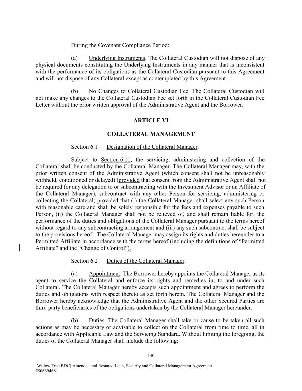 During the Covenant Compliance Period: (a) Underlying Instruments. The Collateral Custodian will not dispose of any physical documents constituting the Underlying Instruments in any manner that is inconsistent with the performance of its obligations as the Collateral Custodian pursuant to this Agreement and will not dispose of any Collateral except as contemplated by this Agreement. (b) No Changes to Collateral Custodian Fee. The Collateral Custodian will not make any changes to the Collateral Custodian Fee set forth in the Collateral Custodian Fee Letter without the prior written approval of the Administrative Agent and the Borrower. ARTICLE VI COLLATERAL MANAGEMENT Section 6.1 Designation of the Collateral Manager. Subject to Section 6.11, the servicing, administering and collection of the Collateral shall be conducted by the Collateral Manager. The Collateral Manager may, with the prior written consent of the Administrative Agent (which consent shall not be unreasonably withheld, conditioned or delayed) (provided that consent from the Administrative Agent shall not be required for any delegation to or subcontracting with the Investment Advisor or an Affiliate of the Collateral Manager), subcontract with any other Person for servicing, administering or collecting the Collateral; provided that (i) the Collateral Manager shall select any such Person with reasonable care and shall be solely responsible for the fees and expenses payable to such Person, (ii) the Collateral Manager shall not be relieved of, and shall remain liable for, the performance of the duties and obligations of the Collateral Manager pursuant to the terms hereof without regard to any subcontracting arrangement and (iii) any such subcontract shall be subject to the provisions hereof. The Collateral Manager may assign its rights and duties hereunder to a Permitted Affiliate in accordance with the terms hereof (including the definitions of “Permitted Affiliate” and the “Change of Control”). Section 6.2 Duties of the Collateral Manager. (a) Appointment. The Borrower hereby appoints the Collateral Manager as its agent to service the Collateral and enforce its rights and remedies in, to and under such Collateral. The Collateral Manager hereby accepts such appointment and agrees to perform the duties and obligations with respect thereto as set forth herein. The Collateral Manager and the Borrower hereby acknowledge that the Administrative Agent and the other Secured Parties are third party beneficiaries of the obligations undertaken by the Collateral Manager hereunder. (b) Duties. The Collateral Manager shall take or cause to be taken all such actions as may be necessary or advisable to collect on the Collateral from time to time, all in accordance with Applicable Law and the Servicing Standard. Without limiting the foregoing, the duties of the Collateral Manager shall include the following: -140- [Willow Tree BDC] Amended and Restated Loan, Security and Collateral Management Agreement #506694681