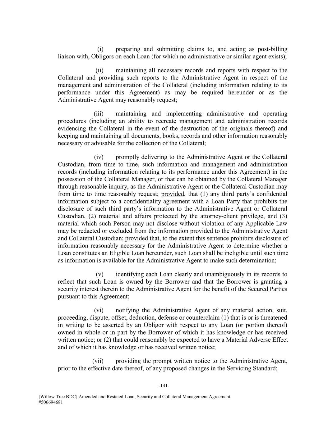 (i) preparing and submitting claims to, and acting as post-billing liaison with, Obligors on each Loan (for which no administrative or similar agent exists); (ii) maintaining all necessary records and reports with respect to the Collateral and providing such reports to the Administrative Agent in respect of the management and administration of the Collateral (including information relating to its performance under this Agreement) as may be required hereunder or as the Administrative Agent may reasonably request; (iii) maintaining and implementing administrative and operating procedures (including an ability to recreate management and administration records evidencing the Collateral in the event of the destruction of the originals thereof) and keeping and maintaining all documents, books, records and other information reasonably necessary or advisable for the collection of the Collateral; (iv) promptly delivering to the Administrative Agent or the Collateral Custodian, from time to time, such information and management and administration records (including information relating to its performance under this Agreement) in the possession of the Collateral Manager, or that can be obtained by the Collateral Manager through reasonable inquiry, as the Administrative Agent or the Collateral Custodian may from time to time reasonably request; provided, that (1) any third party’s confidential information subject to a confidentiality agreement with a Loan Party that prohibits the disclosure of such third party’s information to the Administrative Agent or Collateral Custodian, (2) material and affairs protected by the attorney-client privilege, and (3) material which such Person may not disclose without violation of any Applicable Law may be redacted or excluded from the information provided to the Administrative Agent and Collateral Custodian; provided that, to the extent this sentence prohibits disclosure of information reasonably necessary for the Administrative Agent to determine whether a Loan constitutes an Eligible Loan hereunder, such Loan shall be ineligible until such time as information is available for the Administrative Agent to make such determination; (v) identifying each Loan clearly and unambiguously in its records to reflect that such Loan is owned by the Borrower and that the Borrower is granting a security interest therein to the Administrative Agent for the benefit of the Secured Parties pursuant to this Agreement; (vi) notifying the Administrative Agent of any material action, suit, proceeding, dispute, offset, deduction, defense or counterclaim (1) that is or is threatened in writing to be asserted by an Obligor with respect to any Loan (or portion thereof) owned in whole or in part by the Borrower of which it has knowledge or has received written notice; or (2) that could reasonably be expected to have a Material Adverse Effect and of which it has knowledge or has received written notice; (vii) providing the prompt written notice to the Administrative Agent, prior to the effective date thereof, of any proposed changes in the Servicing Standard; -141- [Willow Tree BDC] Amended and Restated Loan, Security and Collateral Management Agreement #506694681