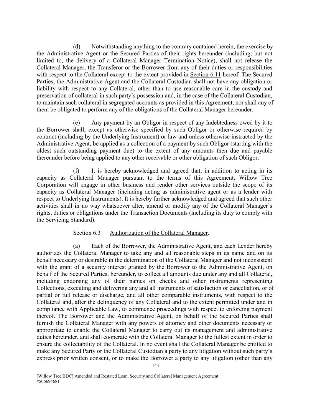 (d) Notwithstanding anything to the contrary contained herein, the exercise by the Administrative Agent or the Secured Parties of their rights hereunder (including, but not limited to, the delivery of a Collateral Manager Termination Notice), shall not release the Collateral Manager, the Transferor or the Borrower from any of their duties or responsibilities with respect to the Collateral except to the extent provided in Section 6.11 hereof. The Secured Parties, the Administrative Agent and the Collateral Custodian shall not have any obligation or liability with respect to any Collateral, other than to use reasonable care in the custody and preservation of collateral in such party’s possession and, in the case of the Collateral Custodian, to maintain such collateral in segregated accounts as provided in this Agreement, nor shall any of them be obligated to perform any of the obligations of the Collateral Manager hereunder. (e) Any payment by an Obligor in respect of any Indebtedness owed by it to the Borrower shall, except as otherwise specified by such Obligor or otherwise required by contract (including by the Underlying Instrument) or law and unless otherwise instructed by the Administrative Agent, be applied as a collection of a payment by such Obligor (starting with the oldest such outstanding payment due) to the extent of any amounts then due and payable thereunder before being applied to any other receivable or other obligation of such Obligor. (f) It is hereby acknowledged and agreed that, in addition to acting in its capacity as Collateral Manager pursuant to the terms of this Agreement, Willow Tree Corporation will engage in other business and render other services outside the scope of its capacity as Collateral Manager (including acting as administrative agent or as a lender with respect to Underlying Instruments). It is hereby further acknowledged and agreed that such other activities shall in no way whatsoever alter, amend or modify any of the Collateral Manager’s rights, duties or obligations under the Transaction Documents (including its duty to comply with the Servicing Standard). Section 6.3 Authorization of the Collateral Manager. (a) Each of the Borrower, the Administrative Agent, and each Lender hereby authorizes the Collateral Manager to take any and all reasonable steps in its name and on its behalf necessary or desirable in the determination of the Collateral Manager and not inconsistent with the grant of a security interest granted by the Borrower to the Administrative Agent, on behalf of the Secured Parties, hereunder, to collect all amounts due under any and all Collateral, including endorsing any of their names on checks and other instruments representing Collections, executing and delivering any and all instruments of satisfaction or cancellation, or of partial or full release or discharge, and all other comparable instruments, with respect to the Collateral and, after the delinquency of any Collateral and to the extent permitted under and in compliance with Applicable Law, to commence proceedings with respect to enforcing payment thereof. The Borrower and the Administrative Agent, on behalf of the Secured Parties shall furnish the Collateral Manager with any powers of attorney and other documents necessary or appropriate to enable the Collateral Manager to carry out its management and administrative duties hereunder, and shall cooperate with the Collateral Manager to the fullest extent in order to ensure the collectability of the Collateral. In no event shall the Collateral Manager be entitled to make any Secured Party or the Collateral Custodian a party to any litigation without such party’s express prior written consent, or to make the Borrower a party to any litigation (other than any -143- [Willow Tree BDC] Amended and Restated Loan, Security and Collateral Management Agreement #506694681
