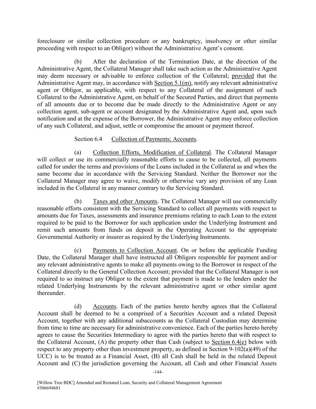 foreclosure or similar collection procedure or any bankruptcy, insolvency or other similar proceeding with respect to an Obligor) without the Administrative Agent’s consent. (b) After the declaration of the Termination Date, at the direction of the Administrative Agent, the Collateral Manager shall take such action as the Administrative Agent may deem necessary or advisable to enforce collection of the Collateral; provided that the Administrative Agent may, in accordance with Section 5.1(m), notify any relevant administrative agent or Obligor, as applicable, with respect to any Collateral of the assignment of such Collateral to the Administrative Agent, on behalf of the Secured Parties, and direct that payments of all amounts due or to become due be made directly to the Administrative Agent or any collection agent, sub-agent or account designated by the Administrative Agent and, upon such notification and at the expense of the Borrower, the Administrative Agent may enforce collection of any such Collateral, and adjust, settle or compromise the amount or payment thereof. Section 6.4 Collection of Payments; Accounts. (a) Collection Efforts, Modification of Collateral. The Collateral Manager will collect or use its commercially reasonable efforts to cause to be collected, all payments called for under the terms and provisions of the Loans included in the Collateral as and when the same become due in accordance with the Servicing Standard. Neither the Borrower nor the Collateral Manager may agree to waive, modify or otherwise vary any provision of any Loan included in the Collateral in any manner contrary to the Servicing Standard. (b) Taxes and other Amounts. The Collateral Manager will use commercially reasonable efforts consistent with the Servicing Standard to collect all payments with respect to amounts due for Taxes, assessments and insurance premiums relating to each Loan to the extent required to be paid to the Borrower for such application under the Underlying Instrument and remit such amounts from funds on deposit in the Operating Account to the appropriate Governmental Authority or insurer as required by the Underlying Instruments. (c) Payments to Collection Account. On or before the applicable Funding Date, the Collateral Manager shall have instructed all Obligors responsible for payment and/or any relevant administrative agents to make all payments owing to the Borrower in respect of the Collateral directly to the General Collection Account; provided that the Collateral Manager is not required to so instruct any Obligor to the extent that payment is made to the lenders under the related Underlying Instruments by the relevant administrative agent or other similar agent thereunder. (d) Accounts. Each of the parties hereto hereby agrees that the Collateral Account shall be deemed to be a comprised of a Securities Account and a related Deposit Account, together with any additional subaccounts as the Collateral Custodian may determine from time to time are necessary for administrative convenience. Each of the parties hereto hereby agrees to cause the Securities Intermediary to agree with the parties hereto that with respect to the Collateral Account, (A) the property other than Cash (subject to Section 6.4(e) below with respect to any property other than investment property, as defined in Section 9-102(a)(49) of the UCC) is to be treated as a Financial Asset, (B) all Cash shall be held in the related Deposit Account and (C) the jurisdiction governing the Account, all Cash and other Financial Assets -144- [Willow Tree BDC] Amended and Restated Loan, Security and Collateral Management Agreement #506694681
