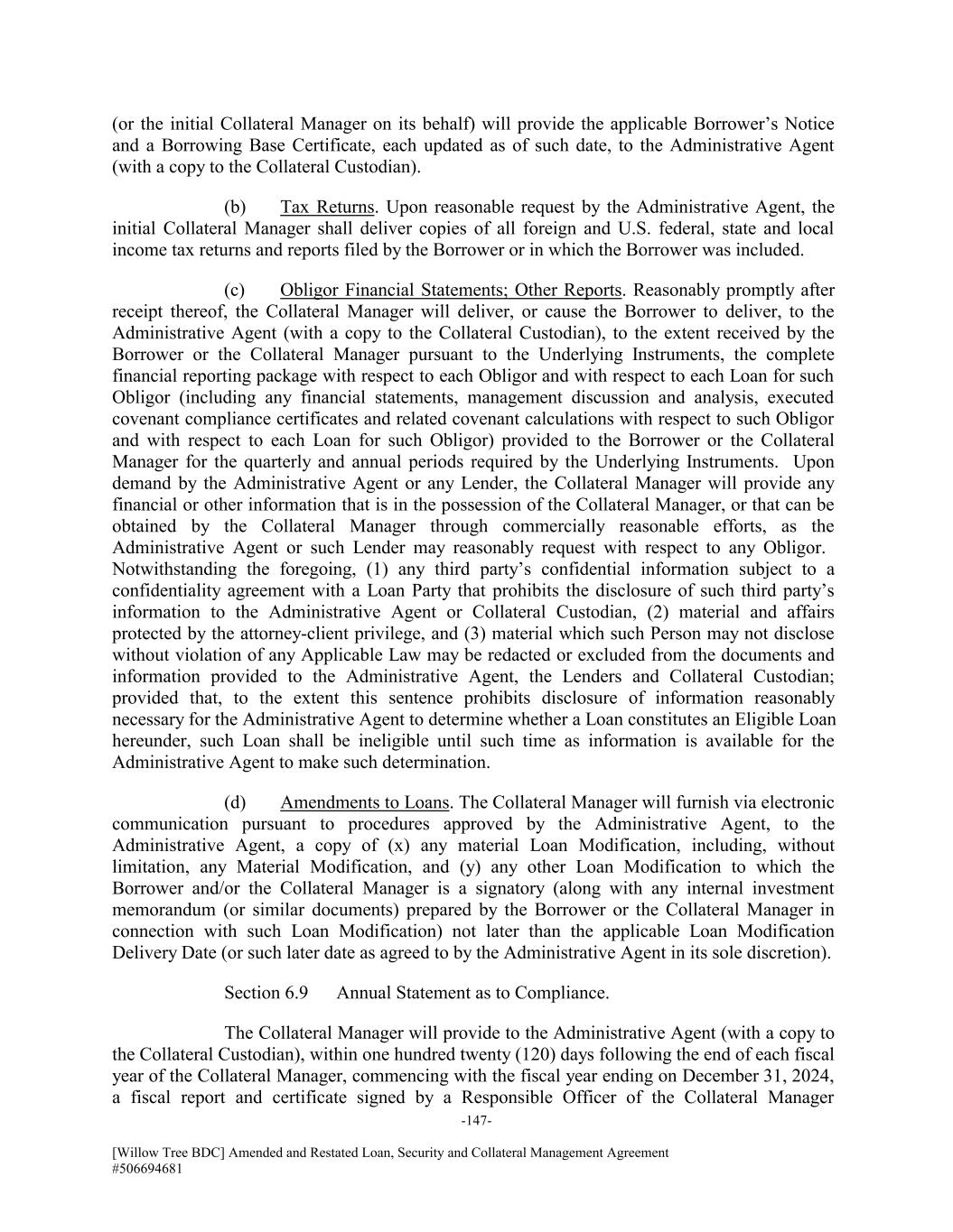 (or the initial Collateral Manager on its behalf) will provide the applicable Borrower’s Notice and a Borrowing Base Certificate, each updated as of such date, to the Administrative Agent (with a copy to the Collateral Custodian). (b) Tax Returns. Upon reasonable request by the Administrative Agent, the initial Collateral Manager shall deliver copies of all foreign and U.S. federal, state and local income tax returns and reports filed by the Borrower or in which the Borrower was included. (c) Obligor Financial Statements; Other Reports. Reasonably promptly after receipt thereof, the Collateral Manager will deliver, or cause the Borrower to deliver, to the Administrative Agent (with a copy to the Collateral Custodian), to the extent received by the Borrower or the Collateral Manager pursuant to the Underlying Instruments, the complete financial reporting package with respect to each Obligor and with respect to each Loan for such Obligor (including any financial statements, management discussion and analysis, executed covenant compliance certificates and related covenant calculations with respect to such Obligor and with respect to each Loan for such Obligor) provided to the Borrower or the Collateral Manager for the quarterly and annual periods required by the Underlying Instruments. Upon demand by the Administrative Agent or any Lender, the Collateral Manager will provide any financial or other information that is in the possession of the Collateral Manager, or that can be obtained by the Collateral Manager through commercially reasonable efforts, as the Administrative Agent or such Lender may reasonably request with respect to any Obligor. Notwithstanding the foregoing, (1) any third party’s confidential information subject to a confidentiality agreement with a Loan Party that prohibits the disclosure of such third party’s information to the Administrative Agent or Collateral Custodian, (2) material and affairs protected by the attorney-client privilege, and (3) material which such Person may not disclose without violation of any Applicable Law may be redacted or excluded from the documents and information provided to the Administrative Agent, the Lenders and Collateral Custodian; provided that, to the extent this sentence prohibits disclosure of information reasonably necessary for the Administrative Agent to determine whether a Loan constitutes an Eligible Loan hereunder, such Loan shall be ineligible until such time as information is available for the Administrative Agent to make such determination. (d) Amendments to Loans. The Collateral Manager will furnish via electronic communication pursuant to procedures approved by the Administrative Agent, to the Administrative Agent, a copy of (x) any material Loan Modification, including, without limitation, any Material Modification, and (y) any other Loan Modification to which the Borrower and/or the Collateral Manager is a signatory (along with any internal investment memorandum (or similar documents) prepared by the Borrower or the Collateral Manager in connection with such Loan Modification) not later than the applicable Loan Modification Delivery Date (or such later date as agreed to by the Administrative Agent in its sole discretion). Section 6.9 Annual Statement as to Compliance. The Collateral Manager will provide to the Administrative Agent (with a copy to the Collateral Custodian), within one hundred twenty (120) days following the end of each fiscal year of the Collateral Manager, commencing with the fiscal year ending on December 31, 2024, a fiscal report and certificate signed by a Responsible Officer of the Collateral Manager -147- [Willow Tree BDC] Amended and Restated Loan, Security and Collateral Management Agreement #506694681