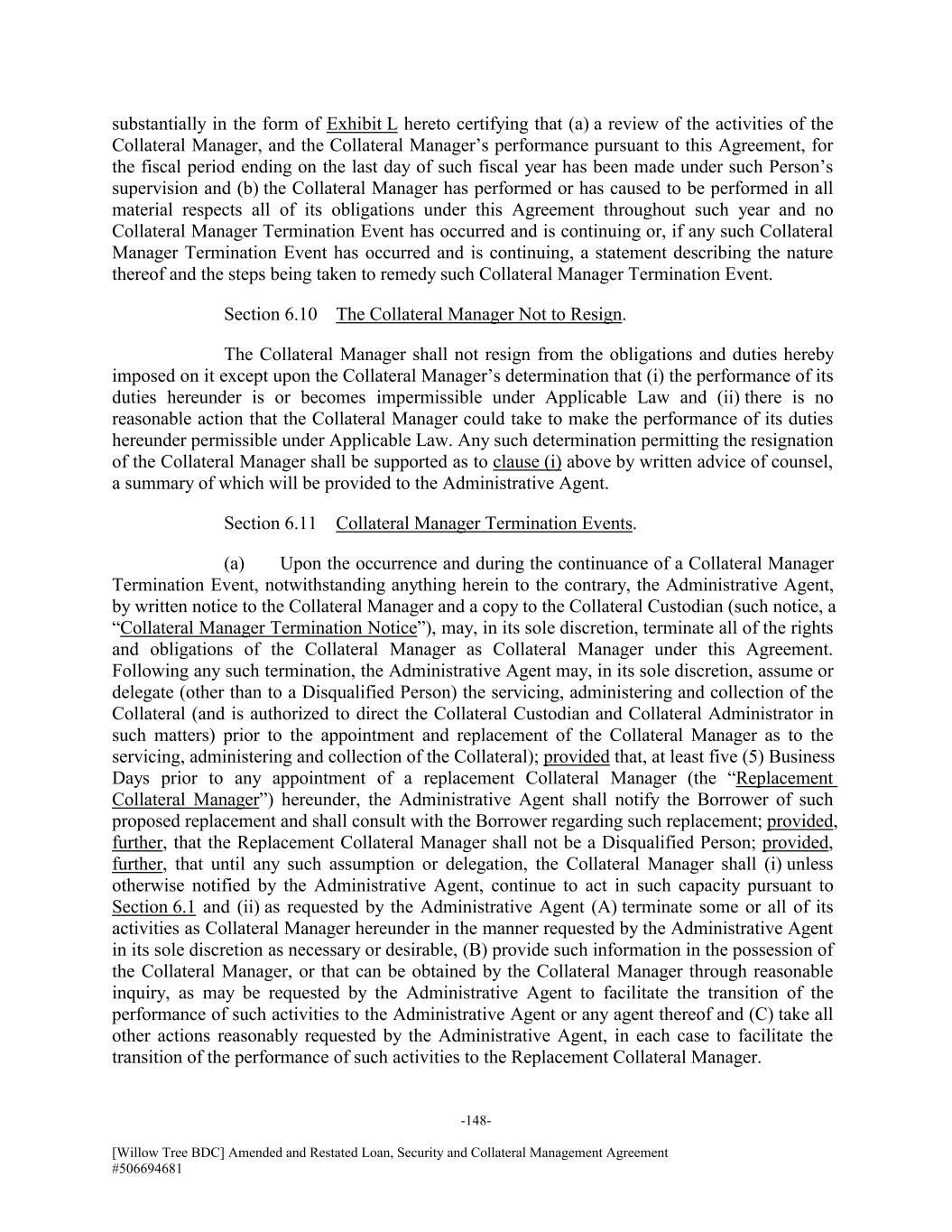 substantially in the form of Exhibit L hereto certifying that (a) a review of the activities of the Collateral Manager, and the Collateral Manager’s performance pursuant to this Agreement, for the fiscal period ending on the last day of such fiscal year has been made under such Person’s supervision and (b) the Collateral Manager has performed or has caused to be performed in all material respects all of its obligations under this Agreement throughout such year and no Collateral Manager Termination Event has occurred and is continuing or, if any such Collateral Manager Termination Event has occurred and is continuing, a statement describing the nature thereof and the steps being taken to remedy such Collateral Manager Termination Event. Section 6.10 The Collateral Manager Not to Resign. The Collateral Manager shall not resign from the obligations and duties hereby imposed on it except upon the Collateral Manager’s determination that (i) the performance of its duties hereunder is or becomes impermissible under Applicable Law and (ii) there is no reasonable action that the Collateral Manager could take to make the performance of its duties hereunder permissible under Applicable Law. Any such determination permitting the resignation of the Collateral Manager shall be supported as to clause (i) above by written advice of counsel, a summary of which will be provided to the Administrative Agent. Section 6.11 Collateral Manager Termination Events. (a) Upon the occurrence and during the continuance of a Collateral Manager Termination Event, notwithstanding anything herein to the contrary, the Administrative Agent, by written notice to the Collateral Manager and a copy to the Collateral Custodian (such notice, a “Collateral Manager Termination Notice”), may, in its sole discretion, terminate all of the rights and obligations of the Collateral Manager as Collateral Manager under this Agreement. Following any such termination, the Administrative Agent may, in its sole discretion, assume or delegate (other than to a Disqualified Person) the servicing, administering and collection of the Collateral (and is authorized to direct the Collateral Custodian and Collateral Administrator in such matters) prior to the appointment and replacement of the Collateral Manager as to the servicing, administering and collection of the Collateral); provided that, at least five (5) Business Days prior to any appointment of a replacement Collateral Manager (the “Replacement Collateral Manager”) hereunder, the Administrative Agent shall notify the Borrower of such proposed replacement and shall consult with the Borrower regarding such replacement; provided, further, that the Replacement Collateral Manager shall not be a Disqualified Person; provided, further, that until any such assumption or delegation, the Collateral Manager shall (i) unless otherwise notified by the Administrative Agent, continue to act in such capacity pursuant to Section 6.1 and (ii) as requested by the Administrative Agent (A) terminate some or all of its activities as Collateral Manager hereunder in the manner requested by the Administrative Agent in its sole discretion as necessary or desirable, (B) provide such information in the possession of the Collateral Manager, or that can be obtained by the Collateral Manager through reasonable inquiry, as may be requested by the Administrative Agent to facilitate the transition of the performance of such activities to the Administrative Agent or any agent thereof and (C) take all other actions reasonably requested by the Administrative Agent, in each case to facilitate the transition of the performance of such activities to the Replacement Collateral Manager. -148- [Willow Tree BDC] Amended and Restated Loan, Security and Collateral Management Agreement #506694681