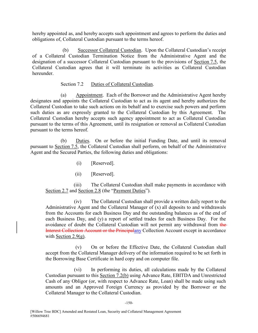 hereby appointed as, and hereby accepts such appointment and agrees to perform the duties and obligations of, Collateral Custodian pursuant to the terms hereof. (b) Successor Collateral Custodian. Upon the Collateral Custodian’s receipt of a Collateral Custodian Termination Notice from the Administrative Agent and the designation of a successor Collateral Custodian pursuant to the provisions of Section 7.5, the Collateral Custodian agrees that it will terminate its activities as Collateral Custodian hereunder. Section 7.2 Duties of Collateral Custodian. (a) Appointment. Each of the Borrower and the Administrative Agent hereby designates and appoints the Collateral Custodian to act as its agent and hereby authorizes the Collateral Custodian to take such actions on its behalf and to exercise such powers and perform such duties as are expressly granted to the Collateral Custodian by this Agreement. The Collateral Custodian hereby accepts such agency appointment to act as Collateral Custodian pursuant to the terms of this Agreement, until its resignation or removal as Collateral Custodian pursuant to the terms hereof. (b) Duties. On or before the initial Funding Date, and until its removal pursuant to Section 7.5, the Collateral Custodian shall perform, on behalf of the Administrative Agent and the Secured Parties, the following duties and obligations: (i) [Reserved]. (ii) [Reserved]. (iii) The Collateral Custodian shall make payments in accordance with Section 2.7 and Section 2.8 (the “Payment Duties”). (iv) The Collateral Custodian shall provide a written daily report to the Administrative Agent and the Collateral Manager of (x) all deposits to and withdrawals from the Accounts for each Business Day and the outstanding balances as of the end of each Business Day, and (y) a report of settled trades for each Business Day. For the avoidance of doubt the Collateral Custodian will not permit any withdrawal from the Interest Collection Account or the Principalany Collection Account except in accordance with Section 2.9(g). (v) On or before the Effective Date, the Collateral Custodian shall accept from the Collateral Manager delivery of the information required to be set forth in the Borrowing Base Certificate in hard copy and on computer file. (vi) In performing its duties, all calculations made by the Collateral Custodian pursuant to this Section 7.2(b) using Advance Rate, EBITDA and Unrestricted Cash of any Obligor (or, with respect to Advance Rate, Loan) shall be made using such amounts and an Approved Foreign Currency as provided by the Borrower or the Collateral Manager to the Collateral Custodian. -150- [Willow Tree BDC] Amended and Restated Loan, Security and Collateral Management Agreement #506694681