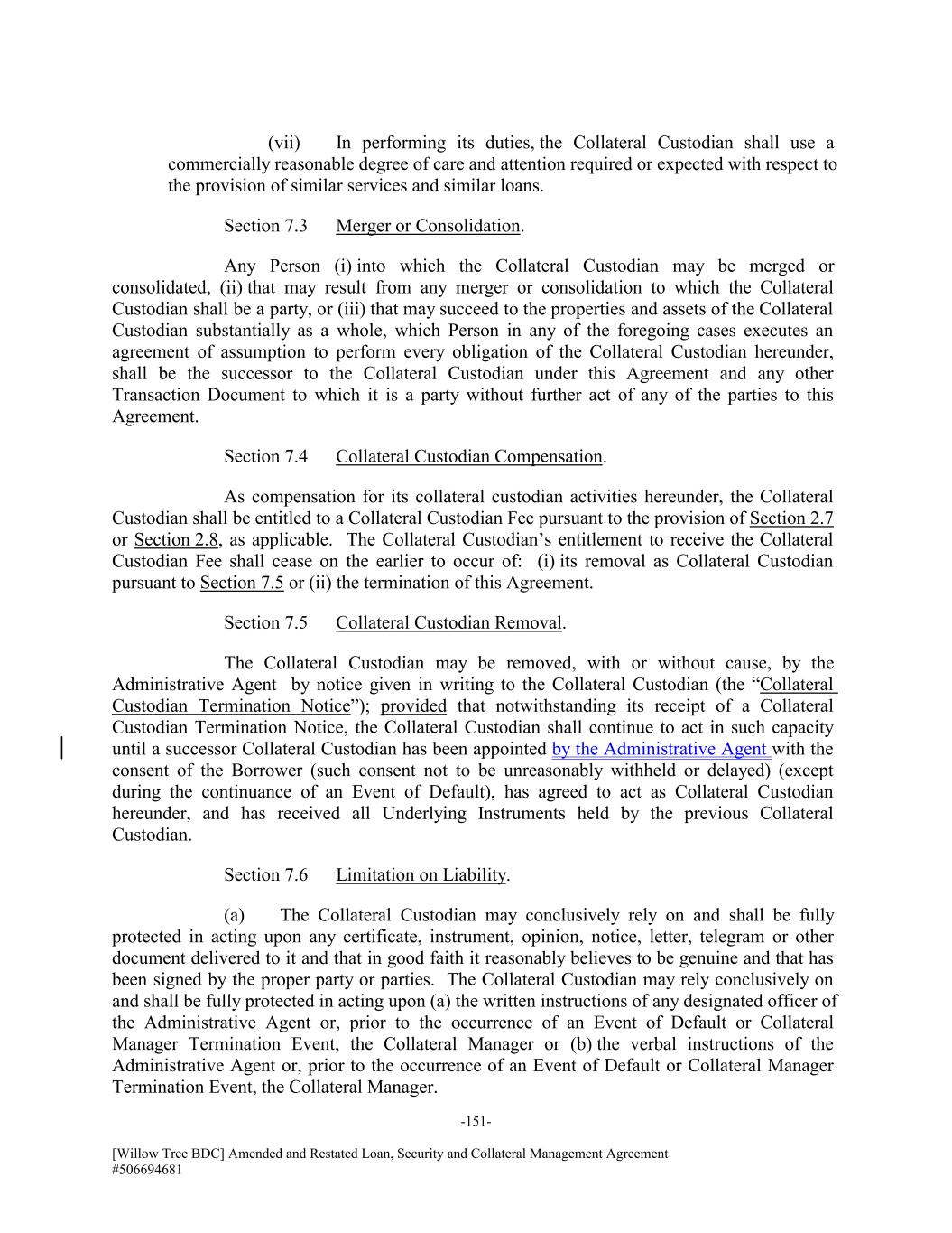 (vii) In performing its duties, the Collateral Custodian shall use a commercially reasonable degree of care and attention required or expected with respect to the provision of similar services and similar loans. Section 7.3 Merger or Consolidation. Any Person (i) into which the Collateral Custodian may be merged or consolidated, (ii) that may result from any merger or consolidation to which the Collateral Custodian shall be a party, or (iii) that may succeed to the properties and assets of the Collateral Custodian substantially as a whole, which Person in any of the foregoing cases executes an agreement of assumption to perform every obligation of the Collateral Custodian hereunder, shall be the successor to the Collateral Custodian under this Agreement and any other Transaction Document to which it is a party without further act of any of the parties to this Agreement. Section 7.4 Collateral Custodian Compensation. As compensation for its collateral custodian activities hereunder, the Collateral Custodian shall be entitled to a Collateral Custodian Fee pursuant to the provision of Section 2.7 or Section 2.8, as applicable. The Collateral Custodian’s entitlement to receive the Collateral Custodian Fee shall cease on the earlier to occur of: (i) its removal as Collateral Custodian pursuant to Section 7.5 or (ii) the termination of this Agreement. Section 7.5 Collateral Custodian Removal. The Collateral Custodian may be removed, with or without cause, by the Administrative Agent by notice given in writing to the Collateral Custodian (the “Collateral Custodian Termination Notice”); provided that notwithstanding its receipt of a Collateral Custodian Termination Notice, the Collateral Custodian shall continue to act in such capacity until a successor Collateral Custodian has been appointed by the Administrative Agent with the consent of the Borrower (such consent not to be unreasonably withheld or delayed) (except during the continuance of an Event of Default), has agreed to act as Collateral Custodian hereunder, and has received all Underlying Instruments held by the previous Collateral Custodian. Section 7.6 Limitation on Liability. (a) The Collateral Custodian may conclusively rely on and shall be fully protected in acting upon any certificate, instrument, opinion, notice, letter, telegram or other document delivered to it and that in good faith it reasonably believes to be genuine and that has been signed by the proper party or parties. The Collateral Custodian may rely conclusively on and shall be fully protected in acting upon (a) the written instructions of any designated officer of the Administrative Agent or, prior to the occurrence of an Event of Default or Collateral Manager Termination Event, the Collateral Manager or (b) the verbal instructions of the Administrative Agent or, prior to the occurrence of an Event of Default or Collateral Manager Termination Event, the Collateral Manager. -151- [Willow Tree BDC] Amended and Restated Loan, Security and Collateral Management Agreement #506694681