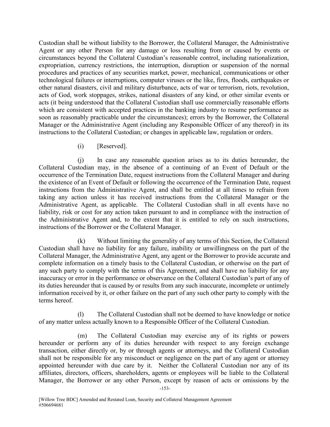 Custodian shall be without liability to the Borrower, the Collateral Manager, the Administrative Agent or any other Person for any damage or loss resulting from or caused by events or circumstances beyond the Collateral Custodian’s reasonable control, including nationalization, expropriation, currency restrictions, the interruption, disruption or suspension of the normal procedures and practices of any securities market, power, mechanical, communications or other technological failures or interruptions, computer viruses or the like, fires, floods, earthquakes or other natural disasters, civil and military disturbance, acts of war or terrorism, riots, revolution, acts of God, work stoppages, strikes, national disasters of any kind, or other similar events or acts (it being understood that the Collateral Custodian shall use commercially reasonable efforts which are consistent with accepted practices in the banking industry to resume performance as soon as reasonably practicable under the circumstances); errors by the Borrower, the Collateral Manager or the Administrative Agent (including any Responsible Officer of any thereof) in its instructions to the Collateral Custodian; or changes in applicable law, regulation or orders. (i) [Reserved]. (j) In case any reasonable question arises as to its duties hereunder, the Collateral Custodian may, in the absence of a continuing of an Event of Default or the occurrence of the Termination Date, request instructions from the Collateral Manager and during the existence of an Event of Default or following the occurrence of the Termination Date, request instructions from the Administrative Agent, and shall be entitled at all times to refrain from taking any action unless it has received instructions from the Collateral Manager or the Administrative Agent, as applicable. The Collateral Custodian shall in all events have no liability, risk or cost for any action taken pursuant to and in compliance with the instruction of the Administrative Agent and, to the extent that it is entitled to rely on such instructions, instructions of the Borrower or the Collateral Manager. (k) Without limiting the generality of any terms of this Section, the Collateral Custodian shall have no liability for any failure, inability or unwillingness on the part of the Collateral Manager, the Administrative Agent, any agent or the Borrower to provide accurate and complete information on a timely basis to the Collateral Custodian, or otherwise on the part of any such party to comply with the terms of this Agreement, and shall have no liability for any inaccuracy or error in the performance or observance on the Collateral Custodian’s part of any of its duties hereunder that is caused by or results from any such inaccurate, incomplete or untimely information received by it, or other failure on the part of any such other party to comply with the terms hereof. (l) The Collateral Custodian shall not be deemed to have knowledge or notice of any matter unless actually known to a Responsible Officer of the Collateral Custodian. (m) The Collateral Custodian may exercise any of its rights or powers hereunder or perform any of its duties hereunder with respect to any foreign exchange transaction, either directly or, by or through agents or attorneys, and the Collateral Custodian shall not be responsible for any misconduct or negligence on the part of any agent or attorney appointed hereunder with due care by it. Neither the Collateral Custodian nor any of its affiliates, directors, officers, shareholders, agents or employees will be liable to the Collateral Manager, the Borrower or any other Person, except by reason of acts or omissions by the -153- [Willow Tree BDC] Amended and Restated Loan, Security and Collateral Management Agreement #506694681