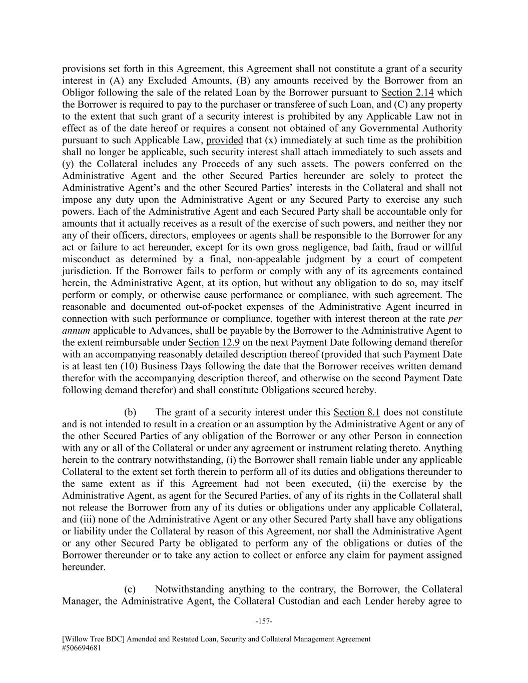provisions set forth in this Agreement, this Agreement shall not constitute a grant of a security interest in (A) any Excluded Amounts, (B) any amounts received by the Borrower from an Obligor following the sale of the related Loan by the Borrower pursuant to Section 2.14 which the Borrower is required to pay to the purchaser or transferee of such Loan, and (C) any property to the extent that such grant of a security interest is prohibited by any Applicable Law not in effect as of the date hereof or requires a consent not obtained of any Governmental Authority pursuant to such Applicable Law, provided that (x) immediately at such time as the prohibition shall no longer be applicable, such security interest shall attach immediately to such assets and (y) the Collateral includes any Proceeds of any such assets. The powers conferred on the Administrative Agent and the other Secured Parties hereunder are solely to protect the Administrative Agent’s and the other Secured Parties’ interests in the Collateral and shall not impose any duty upon the Administrative Agent or any Secured Party to exercise any such powers. Each of the Administrative Agent and each Secured Party shall be accountable only for amounts that it actually receives as a result of the exercise of such powers, and neither they nor any of their officers, directors, employees or agents shall be responsible to the Borrower for any act or failure to act hereunder, except for its own gross negligence, bad faith, fraud or willful misconduct as determined by a final, non-appealable judgment by a court of competent jurisdiction. If the Borrower fails to perform or comply with any of its agreements contained herein, the Administrative Agent, at its option, but without any obligation to do so, may itself perform or comply, or otherwise cause performance or compliance, with such agreement. The reasonable and documented out-of-pocket expenses of the Administrative Agent incurred in connection with such performance or compliance, together with interest thereon at the rate per annum applicable to Advances, shall be payable by the Borrower to the Administrative Agent to the extent reimbursable under Section 12.9 on the next Payment Date following demand therefor with an accompanying reasonably detailed description thereof (provided that such Payment Date is at least ten (10) Business Days following the date that the Borrower receives written demand therefor with the accompanying description thereof, and otherwise on the second Payment Date following demand therefor) and shall constitute Obligations secured hereby. (b) The grant of a security interest under this Section 8.1 does not constitute and is not intended to result in a creation or an assumption by the Administrative Agent or any of the other Secured Parties of any obligation of the Borrower or any other Person in connection with any or all of the Collateral or under any agreement or instrument relating thereto. Anything herein to the contrary notwithstanding, (i) the Borrower shall remain liable under any applicable Collateral to the extent set forth therein to perform all of its duties and obligations thereunder to the same extent as if this Agreement had not been executed, (ii) the exercise by the Administrative Agent, as agent for the Secured Parties, of any of its rights in the Collateral shall not release the Borrower from any of its duties or obligations under any applicable Collateral, and (iii) none of the Administrative Agent or any other Secured Party shall have any obligations or liability under the Collateral by reason of this Agreement, nor shall the Administrative Agent or any other Secured Party be obligated to perform any of the obligations or duties of the Borrower thereunder or to take any action to collect or enforce any claim for payment assigned hereunder. (c) Notwithstanding anything to the contrary, the Borrower, the Collateral Manager, the Administrative Agent, the Collateral Custodian and each Lender hereby agree to -157- [Willow Tree BDC] Amended and Restated Loan, Security and Collateral Management Agreement #506694681