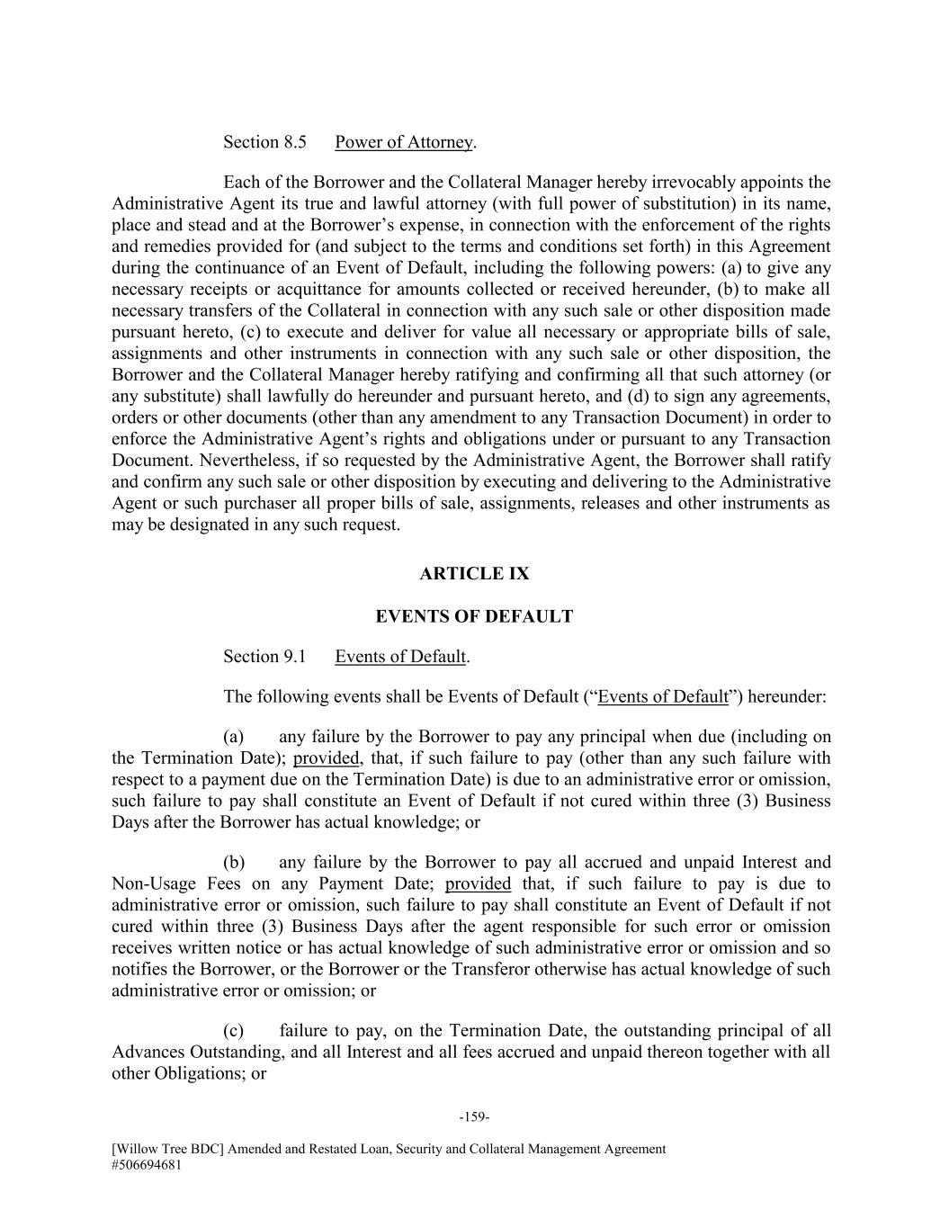 Section 8.5 Power of Attorney. Each of the Borrower and the Collateral Manager hereby irrevocably appoints the Administrative Agent its true and lawful attorney (with full power of substitution) in its name, place and stead and at the Borrower’s expense, in connection with the enforcement of the rights and remedies provided for (and subject to the terms and conditions set forth) in this Agreement during the continuance of an Event of Default, including the following powers: (a) to give any necessary receipts or acquittance for amounts collected or received hereunder, (b) to make all necessary transfers of the Collateral in connection with any such sale or other disposition made pursuant hereto, (c) to execute and deliver for value all necessary or appropriate bills of sale, assignments and other instruments in connection with any such sale or other disposition, the Borrower and the Collateral Manager hereby ratifying and confirming all that such attorney (or any substitute) shall lawfully do hereunder and pursuant hereto, and (d) to sign any agreements, orders or other documents (other than any amendment to any Transaction Document) in order to enforce the Administrative Agent’s rights and obligations under or pursuant to any Transaction Document. Nevertheless, if so requested by the Administrative Agent, the Borrower shall ratify and confirm any such sale or other disposition by executing and delivering to the Administrative Agent or such purchaser all proper bills of sale, assignments, releases and other instruments as may be designated in any such request. ARTICLE IX EVENTS OF DEFAULT Section 9.1 Events of Default. The following events shall be Events of Default (“Events of Default”) hereunder: (a) any failure by the Borrower to pay any principal when due (including on the Termination Date); provided, that, if such failure to pay (other than any such failure with respect to a payment due on the Termination Date) is due to an administrative error or omission, such failure to pay shall constitute an Event of Default if not cured within three (3) Business Days after the Borrower has actual knowledge; or (b) any failure by the Borrower to pay all accrued and unpaid Interest and Non-Usage Fees on any Payment Date; provided that, if such failure to pay is due to administrative error or omission, such failure to pay shall constitute an Event of Default if not cured within three (3) Business Days after the agent responsible for such error or omission receives written notice or has actual knowledge of such administrative error or omission and so notifies the Borrower, or the Borrower or the Transferor otherwise has actual knowledge of such administrative error or omission; or (c) failure to pay, on the Termination Date, the outstanding principal of all Advances Outstanding, and all Interest and all fees accrued and unpaid thereon together with all other Obligations; or -159- [Willow Tree BDC] Amended and Restated Loan, Security and Collateral Management Agreement #506694681