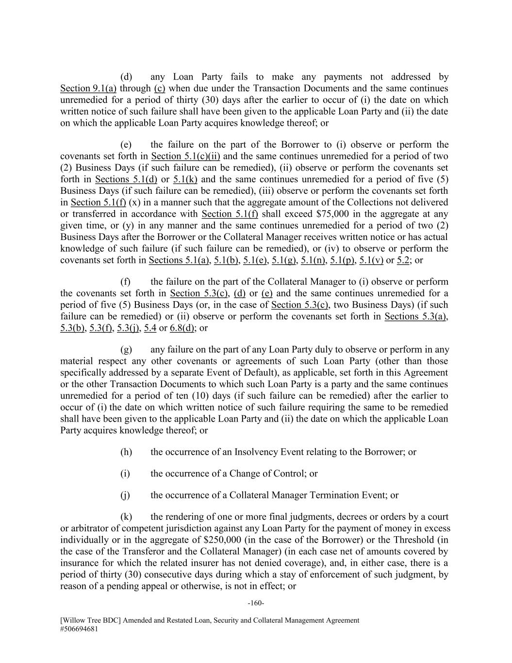 (d) any Loan Party fails to make any payments not addressed by Section 9.1(a) through (c) when due under the Transaction Documents and the same continues unremedied for a period of thirty (30) days after the earlier to occur of (i) the date on which written notice of such failure shall have been given to the applicable Loan Party and (ii) the date on which the applicable Loan Party acquires knowledge thereof; or (e) the failure on the part of the Borrower to (i) observe or perform the covenants set forth in Section 5.1(c)(ii) and the same continues unremedied for a period of two (2) Business Days (if such failure can be remedied), (ii) observe or perform the covenants set forth in Sections 5.1(d) or 5.1(k) and the same continues unremedied for a period of five (5) Business Days (if such failure can be remedied), (iii) observe or perform the covenants set forth in Section 5.1(f) (x) in a manner such that the aggregate amount of the Collections not delivered or transferred in accordance with Section 5.1(f) shall exceed $75,000 in the aggregate at any given time, or (y) in any manner and the same continues unremedied for a period of two (2) Business Days after the Borrower or the Collateral Manager receives written notice or has actual knowledge of such failure (if such failure can be remedied), or (iv) to observe or perform the covenants set forth in Sections 5.1(a), 5.1(b), 5.1(e), 5.1(g), 5.1(n), 5.1(p), 5.1(v) or 5.2; or (f) the failure on the part of the Collateral Manager to (i) observe or perform the covenants set forth in Section 5.3(c), (d) or (e) and the same continues unremedied for a period of five (5) Business Days (or, in the case of Section 5.3(c), two Business Days) (if such failure can be remedied) or (ii) observe or perform the covenants set forth in Sections 5.3(a), 5.3(b), 5.3(f), 5.3(j), 5.4 or 6.8(d); or (g) any failure on the part of any Loan Party duly to observe or perform in any material respect any other covenants or agreements of such Loan Party (other than those specifically addressed by a separate Event of Default), as applicable, set forth in this Agreement or the other Transaction Documents to which such Loan Party is a party and the same continues unremedied for a period of ten (10) days (if such failure can be remedied) after the earlier to occur of (i) the date on which written notice of such failure requiring the same to be remedied shall have been given to the applicable Loan Party and (ii) the date on which the applicable Loan Party acquires knowledge thereof; or (h) the occurrence of an Insolvency Event relating to the Borrower; or (i) the occurrence of a Change of Control; or (j) the occurrence of a Collateral Manager Termination Event; or (k) the rendering of one or more final judgments, decrees or orders by a court or arbitrator of competent jurisdiction against any Loan Party for the payment of money in excess individually or in the aggregate of $250,000 (in the case of the Borrower) or the Threshold (in the case of the Transferor and the Collateral Manager) (in each case net of amounts covered by insurance for which the related insurer has not denied coverage), and, in either case, there is a period of thirty (30) consecutive days during which a stay of enforcement of such judgment, by reason of a pending appeal or otherwise, is not in effect; or -160- [Willow Tree BDC] Amended and Restated Loan, Security and Collateral Management Agreement #506694681