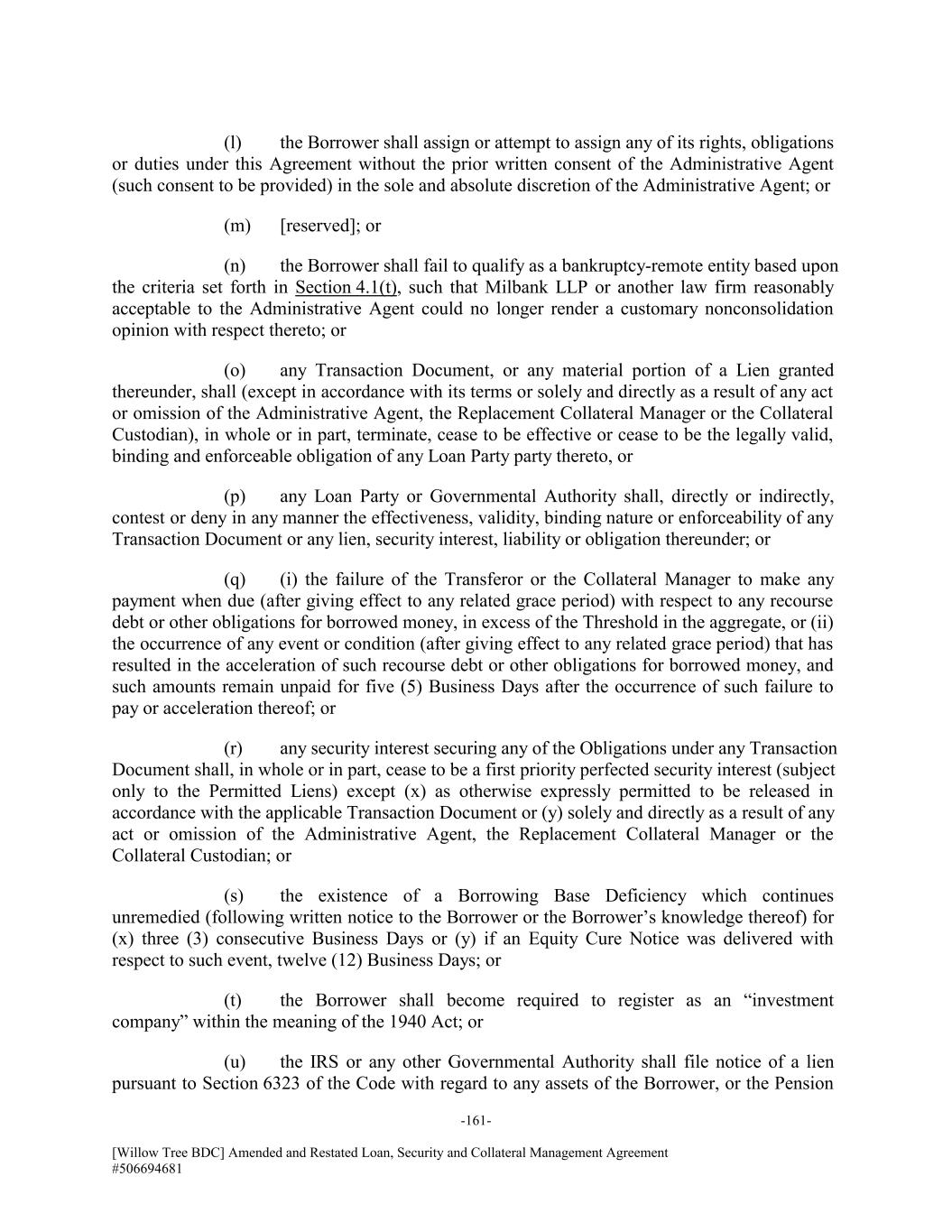 (l) the Borrower shall assign or attempt to assign any of its rights, obligations or duties under this Agreement without the prior written consent of the Administrative Agent (such consent to be provided) in the sole and absolute discretion of the Administrative Agent; or (m) [reserved]; or (n) the Borrower shall fail to qualify as a bankruptcy-remote entity based upon the criteria set forth in Section 4.1(t), such that Milbank LLP or another law firm reasonably acceptable to the Administrative Agent could no longer render a customary nonconsolidation opinion with respect thereto; or (o) any Transaction Document, or any material portion of a Lien granted thereunder, shall (except in accordance with its terms or solely and directly as a result of any act or omission of the Administrative Agent, the Replacement Collateral Manager or the Collateral Custodian), in whole or in part, terminate, cease to be effective or cease to be the legally valid, binding and enforceable obligation of any Loan Party party thereto, or (p) any Loan Party or Governmental Authority shall, directly or indirectly, contest or deny in any manner the effectiveness, validity, binding nature or enforceability of any Transaction Document or any lien, security interest, liability or obligation thereunder; or (q) (i) the failure of the Transferor or the Collateral Manager to make any payment when due (after giving effect to any related grace period) with respect to any recourse debt or other obligations for borrowed money, in excess of the Threshold in the aggregate, or (ii) the occurrence of any event or condition (after giving effect to any related grace period) that has resulted in the acceleration of such recourse debt or other obligations for borrowed money, and such amounts remain unpaid for five (5) Business Days after the occurrence of such failure to pay or acceleration thereof; or (r) any security interest securing any of the Obligations under any Transaction Document shall, in whole or in part, cease to be a first priority perfected security interest (subject only to the Permitted Liens) except (x) as otherwise expressly permitted to be released in accordance with the applicable Transaction Document or (y) solely and directly as a result of any act or omission of the Administrative Agent, the Replacement Collateral Manager or the Collateral Custodian; or (s) the existence of a Borrowing Base Deficiency which continues unremedied (following written notice to the Borrower or the Borrower’s knowledge thereof) for (x) three (3) consecutive Business Days or (y) if an Equity Cure Notice was delivered with respect to such event, twelve (12) Business Days; or (t) the Borrower shall become required to register as an “investment company” within the meaning of the 1940 Act; or (u) the IRS or any other Governmental Authority shall file notice of a lien pursuant to Section 6323 of the Code with regard to any assets of the Borrower, or the Pension -161- [Willow Tree BDC] Amended and Restated Loan, Security and Collateral Management Agreement #506694681