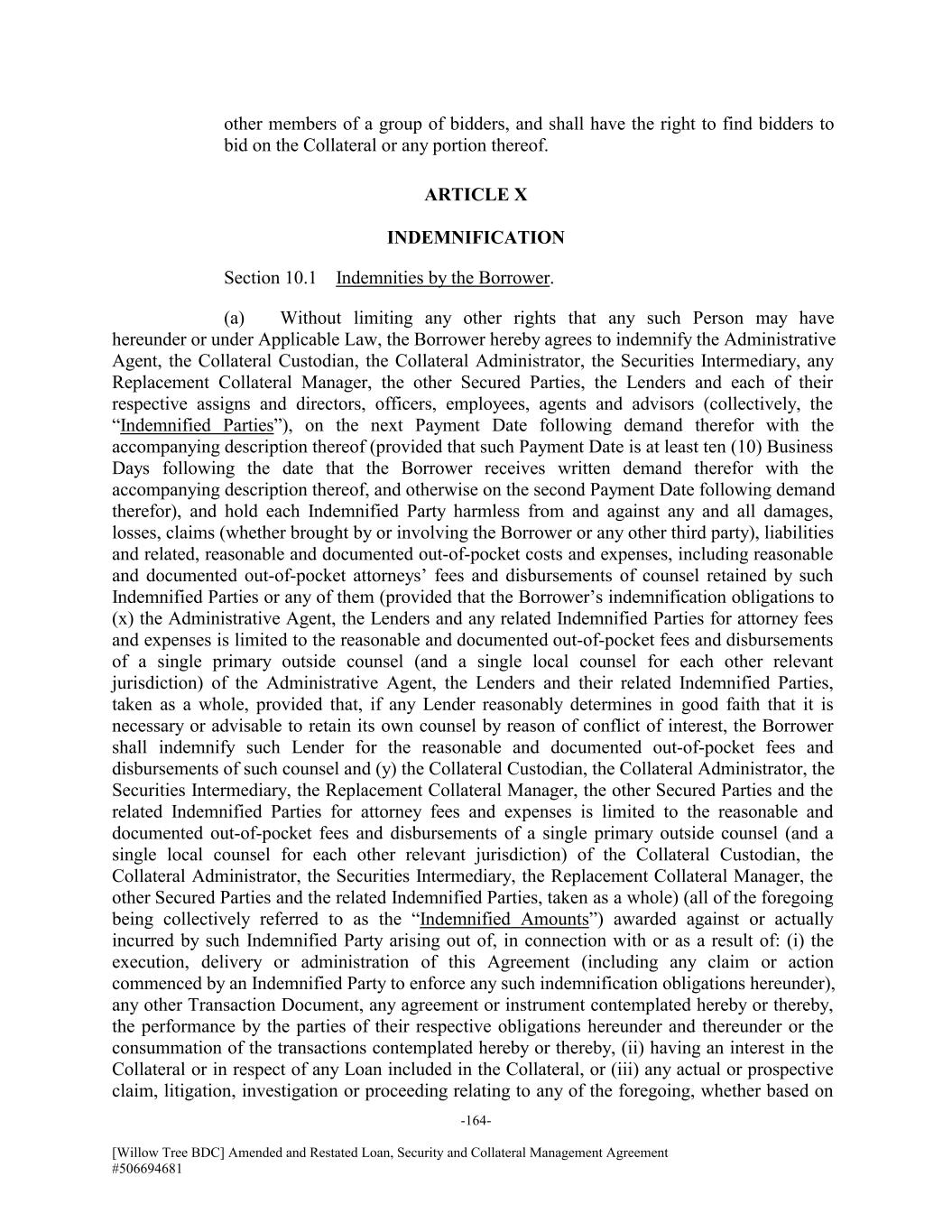 other members of a group of bidders, and shall have the right to find bidders to bid on the Collateral or any portion thereof. ARTICLE X INDEMNIFICATION Section 10.1 Indemnities by the Borrower. (a) Without limiting any other rights that any such Person may have hereunder or under Applicable Law, the Borrower hereby agrees to indemnify the Administrative Agent, the Collateral Custodian, the Collateral Administrator, the Securities Intermediary, any Replacement Collateral Manager, the other Secured Parties, the Lenders and each of their respective assigns and directors, officers, employees, agents and advisors (collectively, the “Indemnified Parties”), on the next Payment Date following demand therefor with the accompanying description thereof (provided that such Payment Date is at least ten (10) Business Days following the date that the Borrower receives written demand therefor with the accompanying description thereof, and otherwise on the second Payment Date following demand therefor), and hold each Indemnified Party harmless from and against any and all damages, losses, claims (whether brought by or involving the Borrower or any other third party), liabilities and related, reasonable and documented out-of-pocket costs and expenses, including reasonable and documented out-of-pocket attorneys’ fees and disbursements of counsel retained by such Indemnified Parties or any of them (provided that the Borrower’s indemnification obligations to (x) the Administrative Agent, the Lenders and any related Indemnified Parties for attorney fees and expenses is limited to the reasonable and documented out-of-pocket fees and disbursements of a single primary outside counsel (and a single local counsel for each other relevant jurisdiction) of the Administrative Agent, the Lenders and their related Indemnified Parties, taken as a whole, provided that, if any Lender reasonably determines in good faith that it is necessary or advisable to retain its own counsel by reason of conflict of interest, the Borrower shall indemnify such Lender for the reasonable and documented out-of-pocket fees and disbursements of such counsel and (y) the Collateral Custodian, the Collateral Administrator, the Securities Intermediary, the Replacement Collateral Manager, the other Secured Parties and the related Indemnified Parties for attorney fees and expenses is limited to the reasonable and documented out-of-pocket fees and disbursements of a single primary outside counsel (and a single local counsel for each other relevant jurisdiction) of the Collateral Custodian, the Collateral Administrator, the Securities Intermediary, the Replacement Collateral Manager, the other Secured Parties and the related Indemnified Parties, taken as a whole) (all of the foregoing being collectively referred to as the “Indemnified Amounts”) awarded against or actually incurred by such Indemnified Party arising out of, in connection with or as a result of: (i) the execution, delivery or administration of this Agreement (including any claim or action commenced by an Indemnified Party to enforce any such indemnification obligations hereunder), any other Transaction Document, any agreement or instrument contemplated hereby or thereby, the performance by the parties of their respective obligations hereunder and thereunder or the consummation of the transactions contemplated hereby or thereby, (ii) having an interest in the Collateral or in respect of any Loan included in the Collateral, or (iii) any actual or prospective claim, litigation, investigation or proceeding relating to any of the foregoing, whether based on -164- [Willow Tree BDC] Amended and Restated Loan, Security and Collateral Management Agreement #506694681