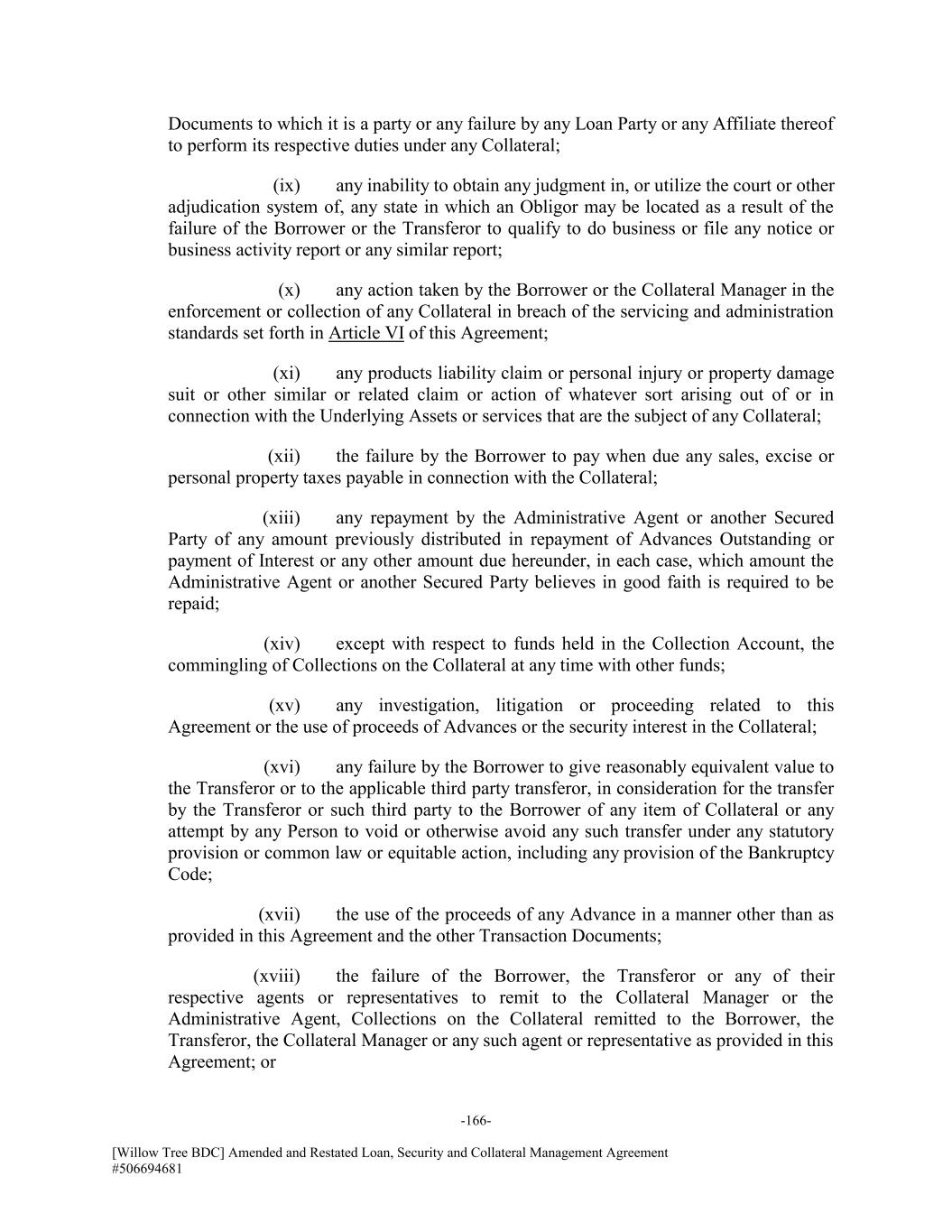 Documents to which it is a party or any failure by any Loan Party or any Affiliate thereof to perform its respective duties under any Collateral; (ix) any inability to obtain any judgment in, or utilize the court or other adjudication system of, any state in which an Obligor may be located as a result of the failure of the Borrower or the Transferor to qualify to do business or file any notice or business activity report or any similar report; (x) any action taken by the Borrower or the Collateral Manager in the enforcement or collection of any Collateral in breach of the servicing and administration standards set forth in Article VI of this Agreement; (xi) any products liability claim or personal injury or property damage suit or other similar or related claim or action of whatever sort arising out of or in connection with the Underlying Assets or services that are the subject of any Collateral; (xii) the failure by the Borrower to pay when due any sales, excise or personal property taxes payable in connection with the Collateral; (xiii) any repayment by the Administrative Agent or another Secured Party of any amount previously distributed in repayment of Advances Outstanding or payment of Interest or any other amount due hereunder, in each case, which amount the Administrative Agent or another Secured Party believes in good faith is required to be repaid; (xiv) except with respect to funds held in the Collection Account, the commingling of Collections on the Collateral at any time with other funds; (xv) any investigation, litigation or proceeding related to this Agreement or the use of proceeds of Advances or the security interest in the Collateral; (xvi) any failure by the Borrower to give reasonably equivalent value to the Transferor or to the applicable third party transferor, in consideration for the transfer by the Transferor or such third party to the Borrower of any item of Collateral or any attempt by any Person to void or otherwise avoid any such transfer under any statutory provision or common law or equitable action, including any provision of the Bankruptcy Code; (xvii) the use of the proceeds of any Advance in a manner other than as provided in this Agreement and the other Transaction Documents; (xviii) the failure of the Borrower, the Transferor or any of their respective agents or representatives to remit to the Collateral Manager or the Administrative Agent, Collections on the Collateral remitted to the Borrower, the Transferor, the Collateral Manager or any such agent or representative as provided in this Agreement; or -166- [Willow Tree BDC] Amended and Restated Loan, Security and Collateral Management Agreement #506694681
