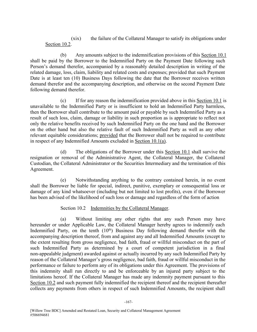 (xix) the failure of the Collateral Manager to satisfy its obligations under Section 10.2. (b) Any amounts subject to the indemnification provisions of this Section 10.1 shall be paid by the Borrower to the Indemnified Party on the Payment Date following such Person’s demand therefor, accompanied by a reasonably detailed description in writing of the related damage, loss, claim, liability and related costs and expenses; provided that such Payment Date is at least ten (10) Business Days following the date that the Borrower receives written demand therefor and the accompanying description, and otherwise on the second Payment Date following demand therefor. (c) If for any reason the indemnification provided above in this Section 10.1 is unavailable to the Indemnified Party or is insufficient to hold an Indemnified Party harmless, then the Borrower shall contribute to the amount paid or payable by such Indemnified Party as a result of such loss, claim, damage or liability in such proportion as is appropriate to reflect not only the relative benefits received by such Indemnified Party on the one hand and the Borrower on the other hand but also the relative fault of such Indemnified Party as well as any other relevant equitable considerations; provided that the Borrower shall not be required to contribute in respect of any Indemnified Amounts excluded in Section 10.1(a). (d) The obligations of the Borrower under this Section 10.1 shall survive the resignation or removal of the Administrative Agent, the Collateral Manager, the Collateral Custodian, the Collateral Administrator or the Securities Intermediary and the termination of this Agreement. (e) Notwithstanding anything to the contrary contained herein, in no event shall the Borrower be liable for special, indirect, punitive, exemplary or consequential loss or damage of any kind whatsoever (including but not limited to lost profits), even if the Borrower has been advised of the likelihood of such loss or damage and regardless of the form of action Section 10.2 Indemnities by the Collateral Manager. (a) Without limiting any other rights that any such Person may have hereunder or under Applicable Law, the Collateral Manager hereby agrees to indemnify each Indemnified Party, on the tenth (10th) Business Day following demand therefor with the accompanying description thereof, from and against any and all Indemnified Amounts (except to the extent resulting from gross negligence, bad faith, fraud or willful misconduct on the part of such Indemnified Party as determined by a court of competent jurisdiction in a final non-appealable judgment) awarded against or actually incurred by any such Indemnified Party by reason of the Collateral Manager’s gross negligence, bad faith, fraud or willful misconduct in the performance or failure to perform any of its obligations under this Agreement. The provisions of this indemnity shall run directly to and be enforceable by an injured party subject to the limitations hereof. If the Collateral Manager has made any indemnity payment pursuant to this Section 10.2 and such payment fully indemnified the recipient thereof and the recipient thereafter collects any payments from others in respect of such Indemnified Amounts, the recipient shall -167- [Willow Tree BDC] Amended and Restated Loan, Security and Collateral Management Agreement #506694681
